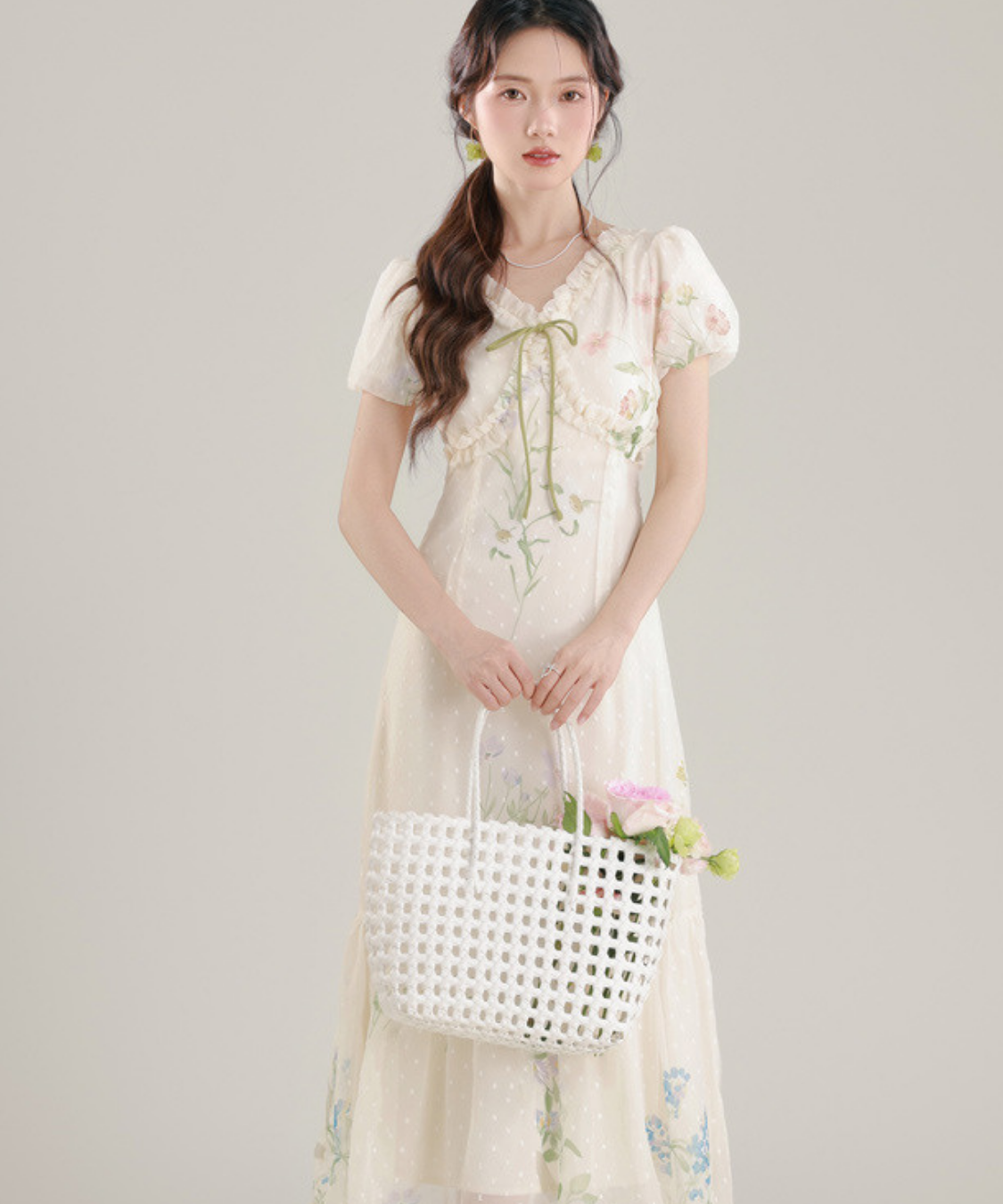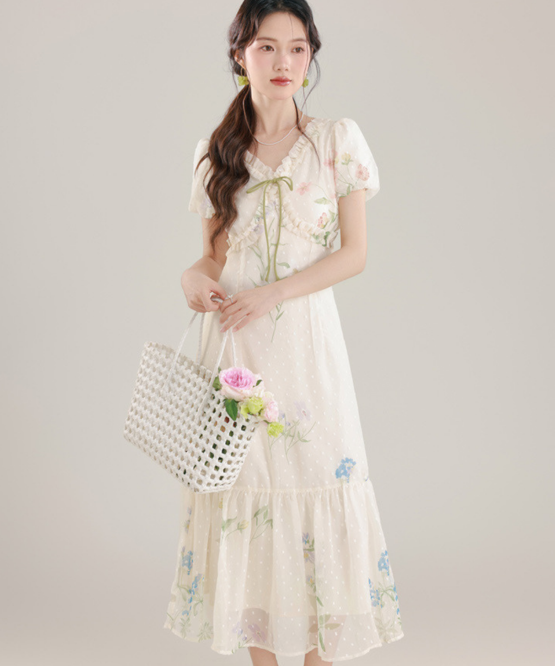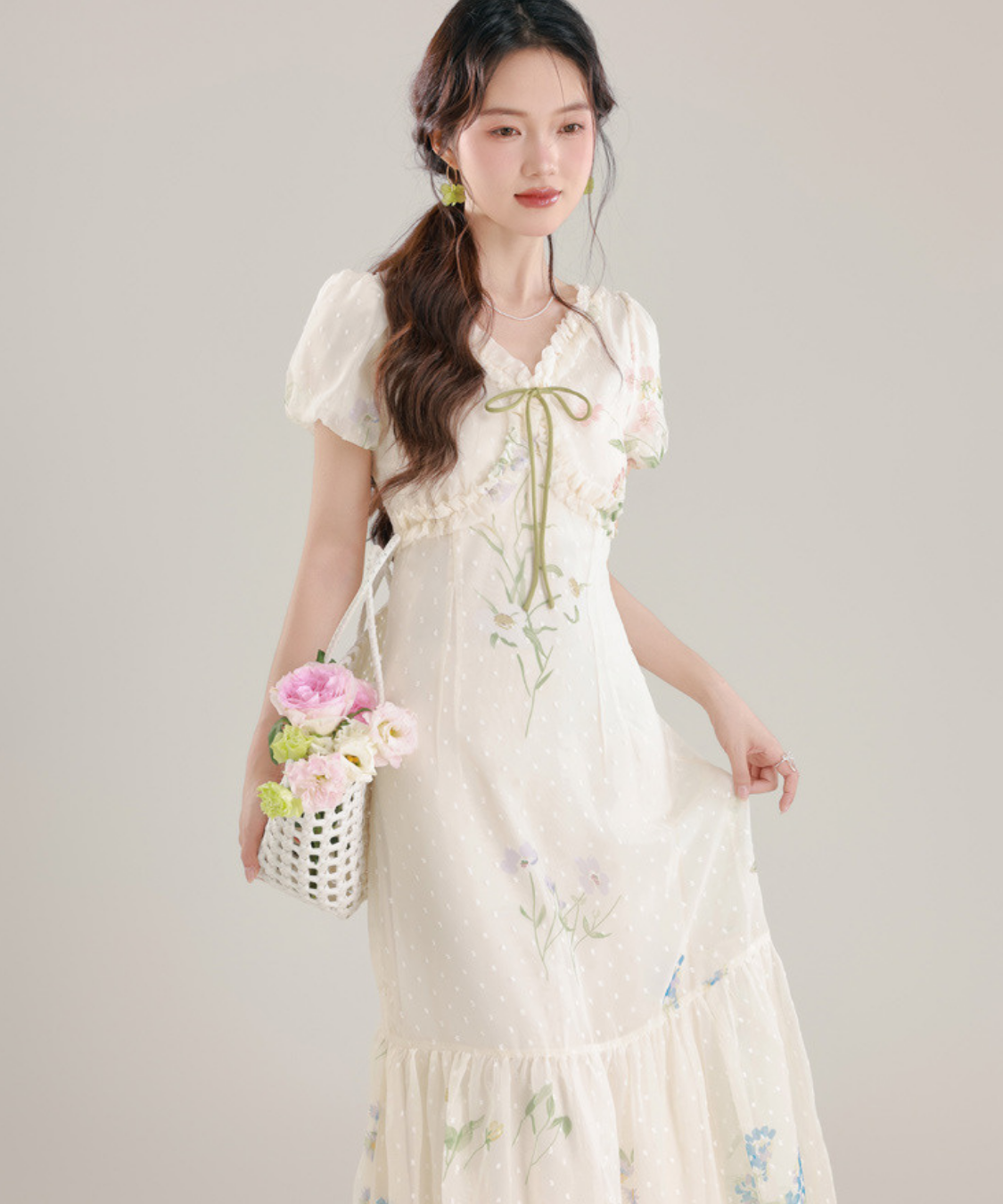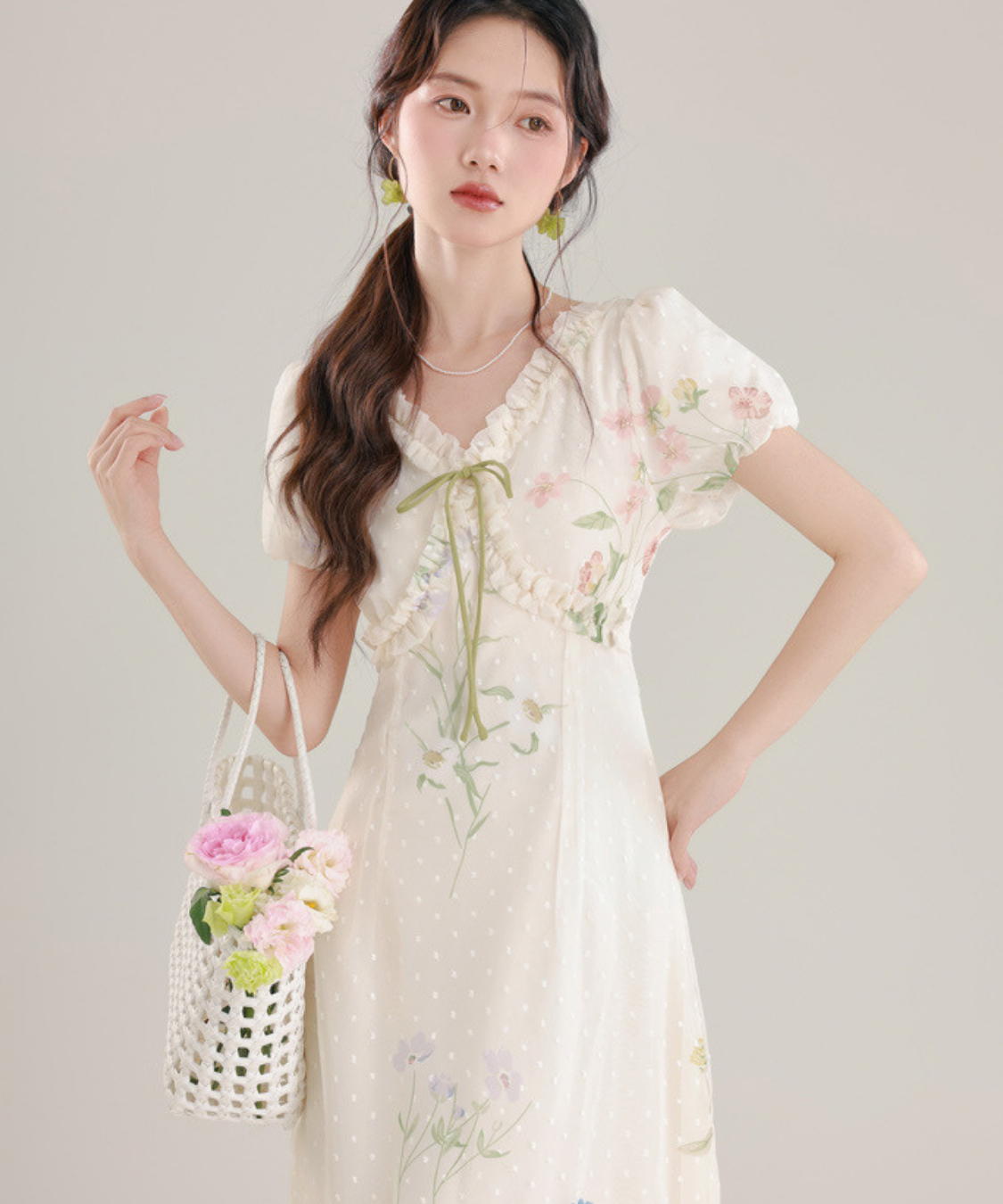 ドット柄と花柄の組み合わせが可憐な印象のロングワンピースです。