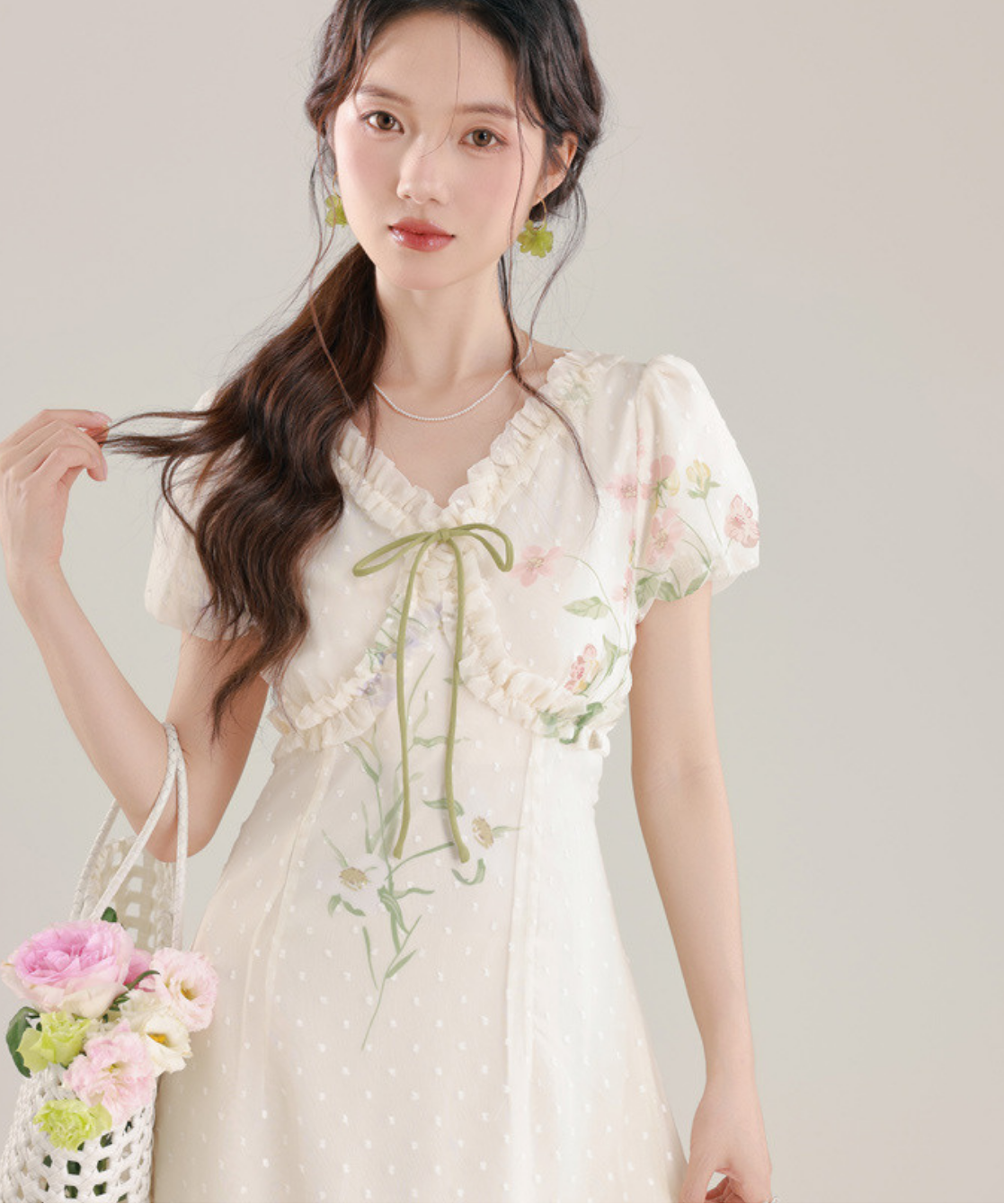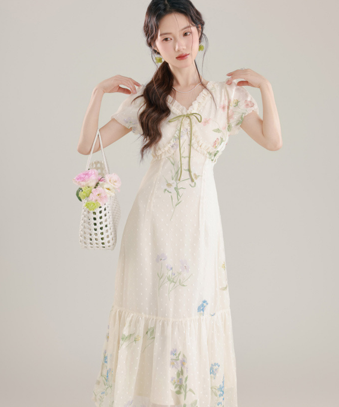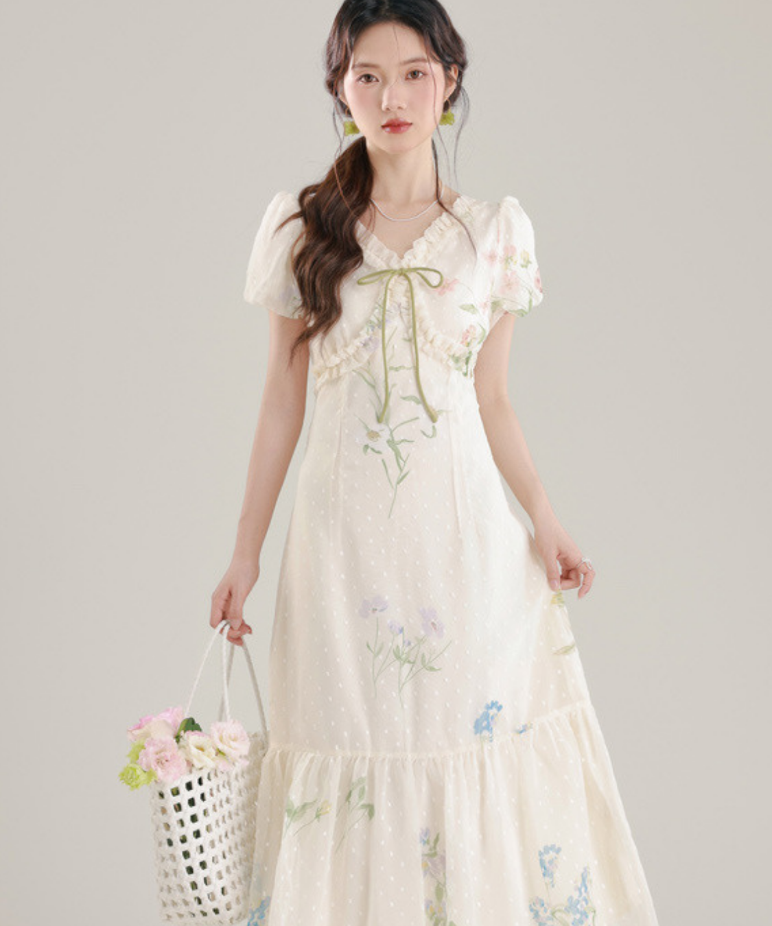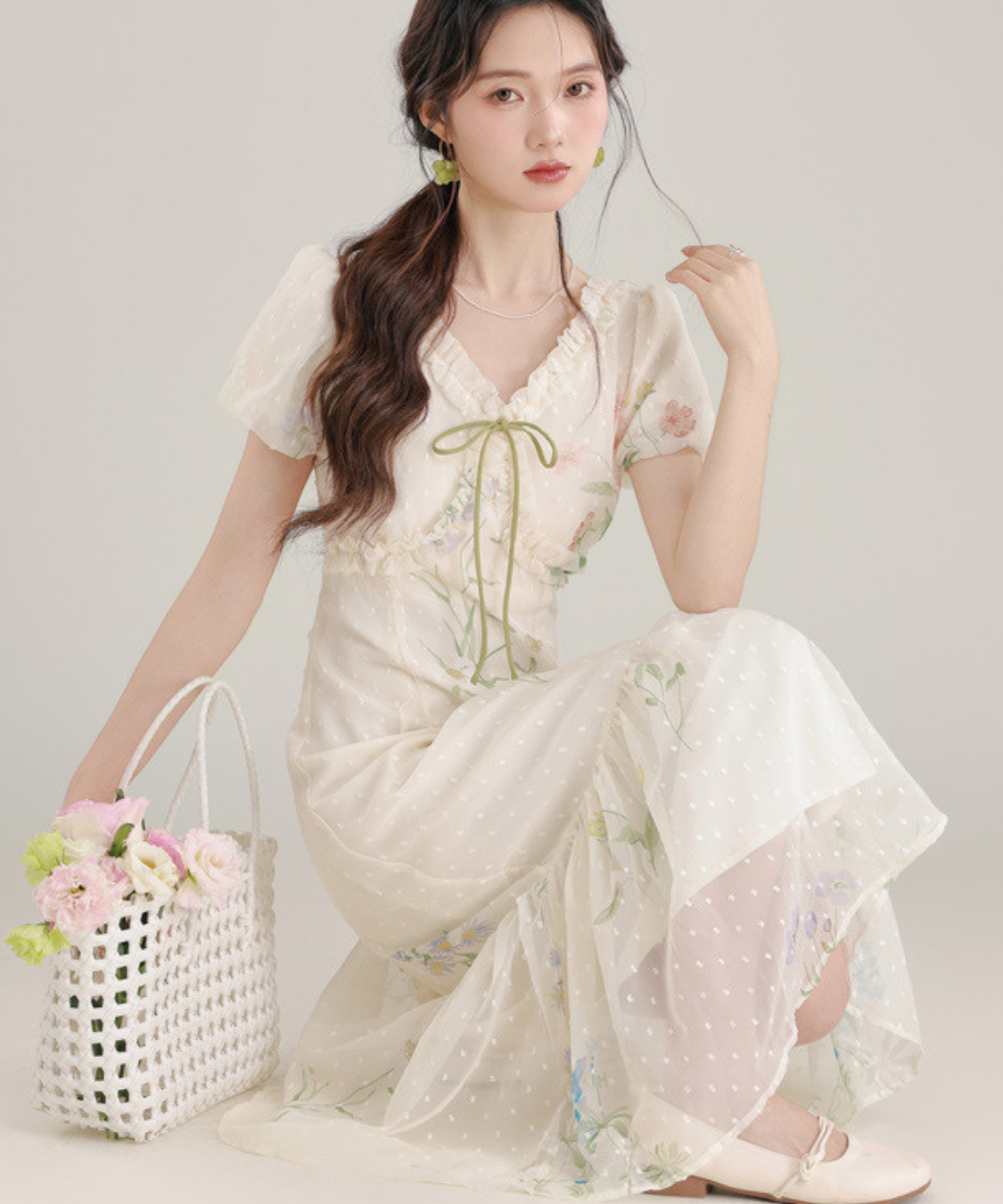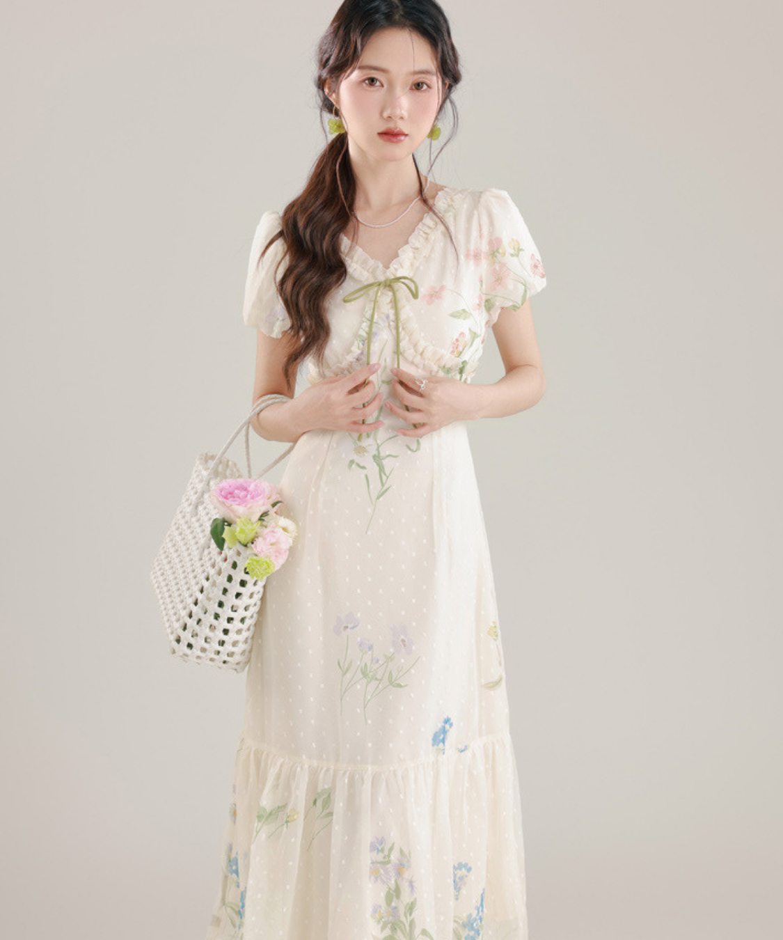 ドット柄と花柄の組み合わせが可憐な印象のロングワンピースです。