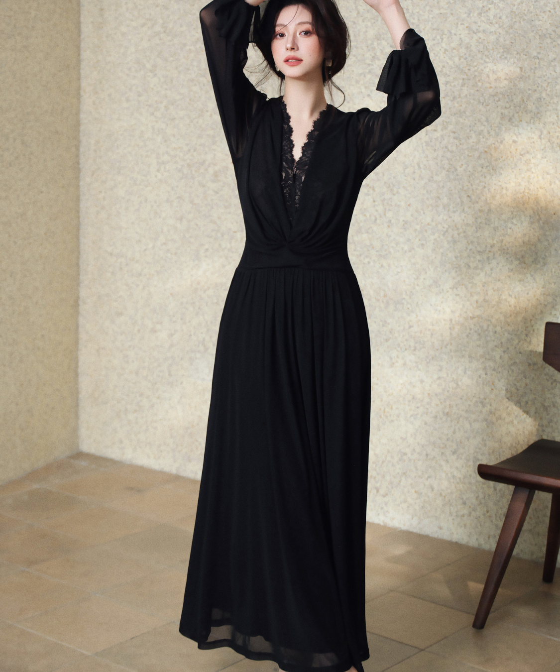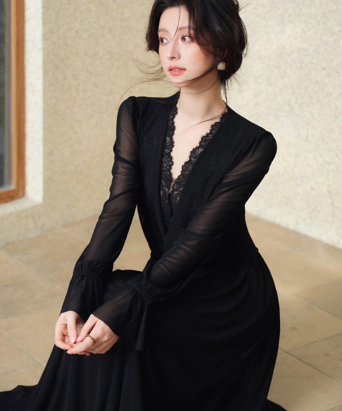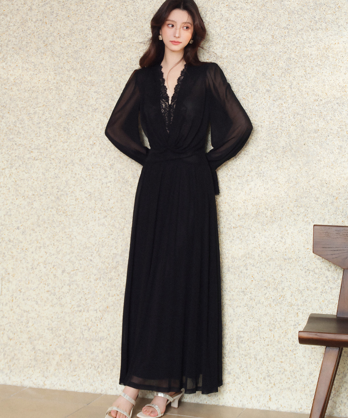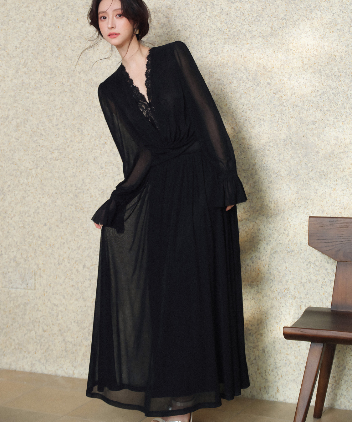 シアー感のある生地がエレガントな雰囲気を演出してくれるロングワンピースです。