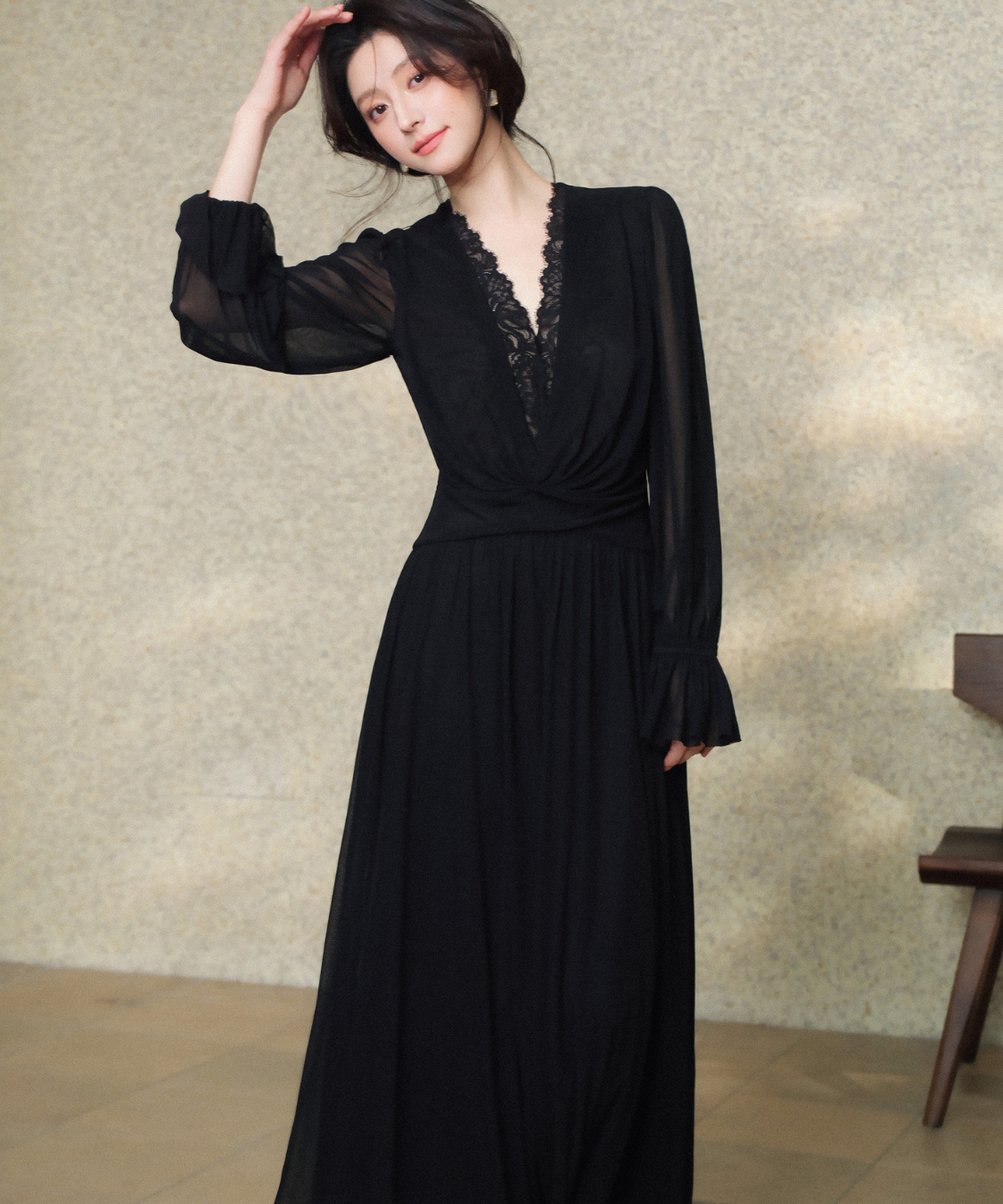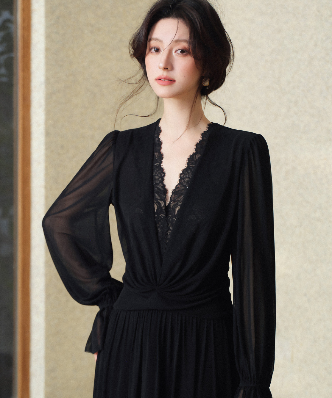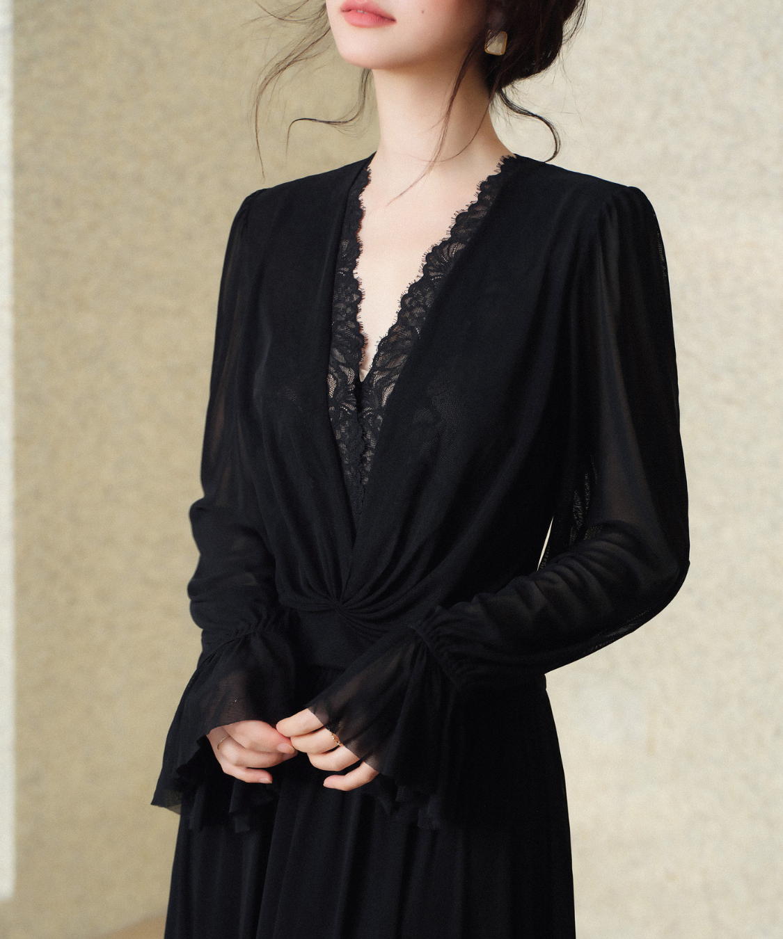 レース付きのVネックがデコルテを美しく見せ、女性らしさを引き立てます♡