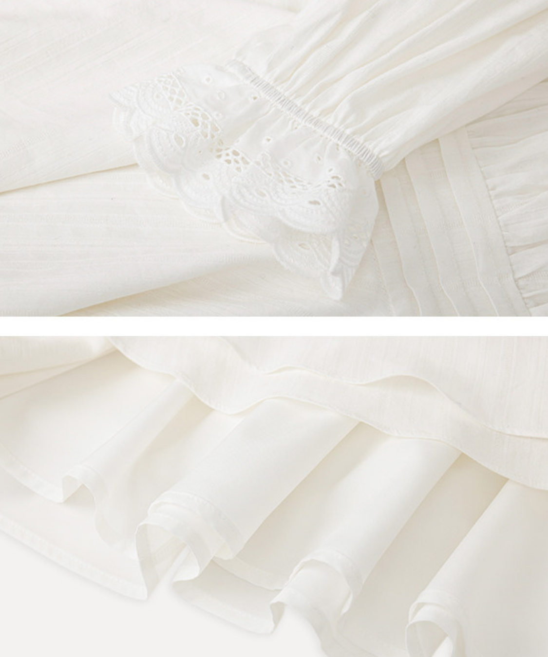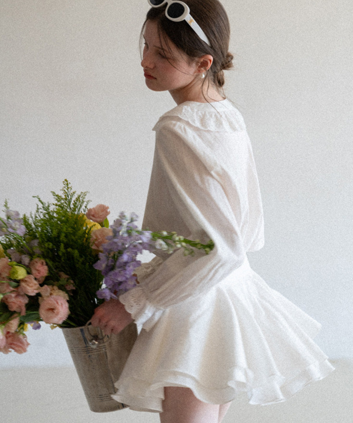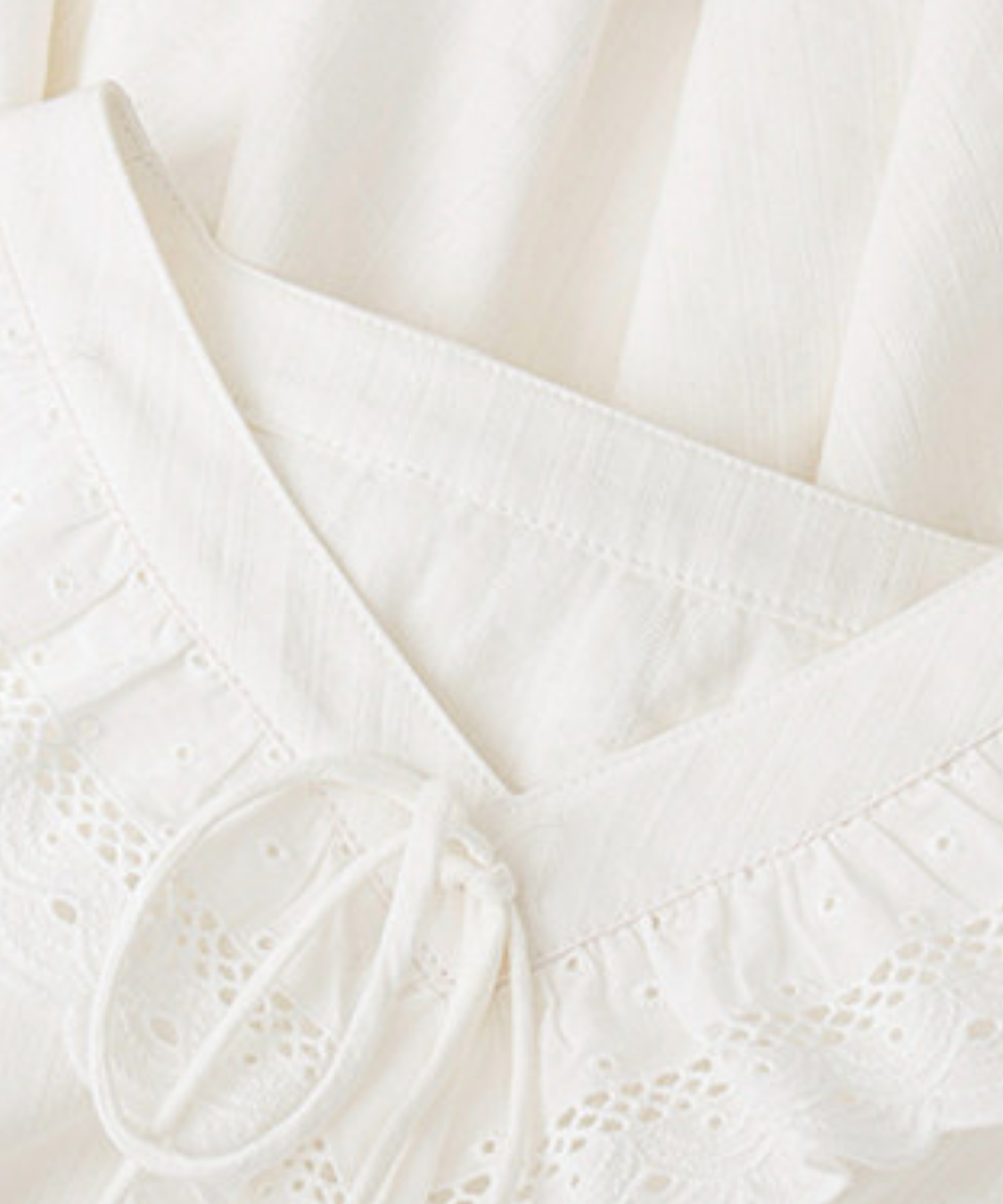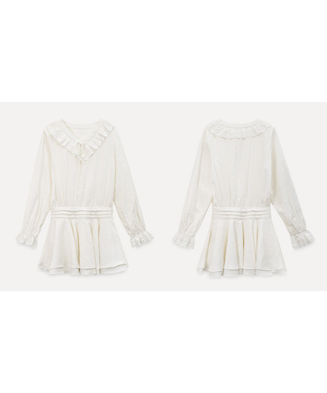 繊細なフリルカラーとレースディテールがクラシカルな雰囲気を醸し出すワンピースです。