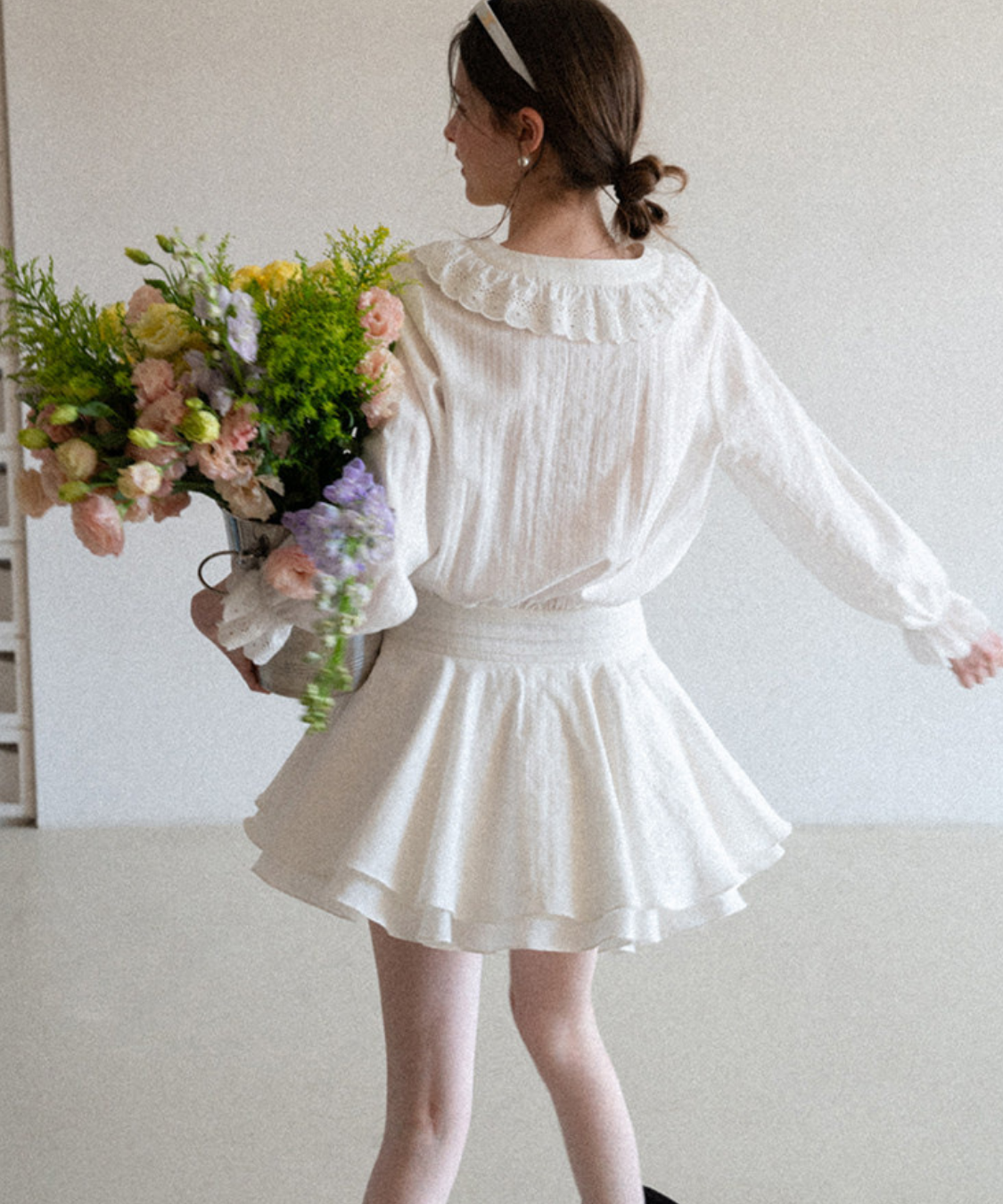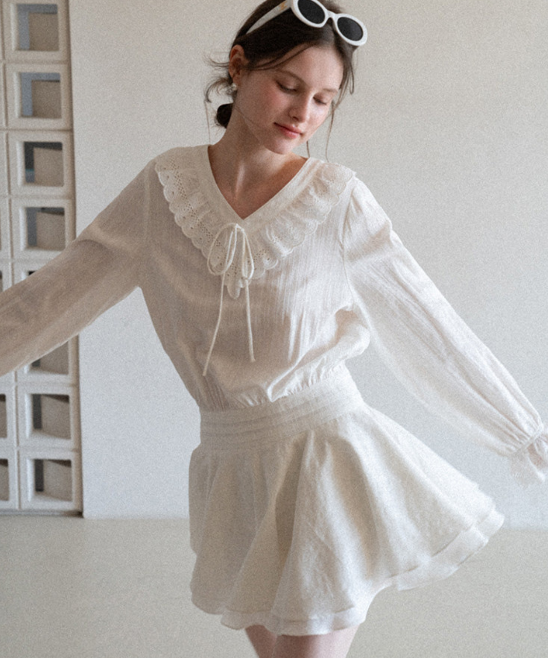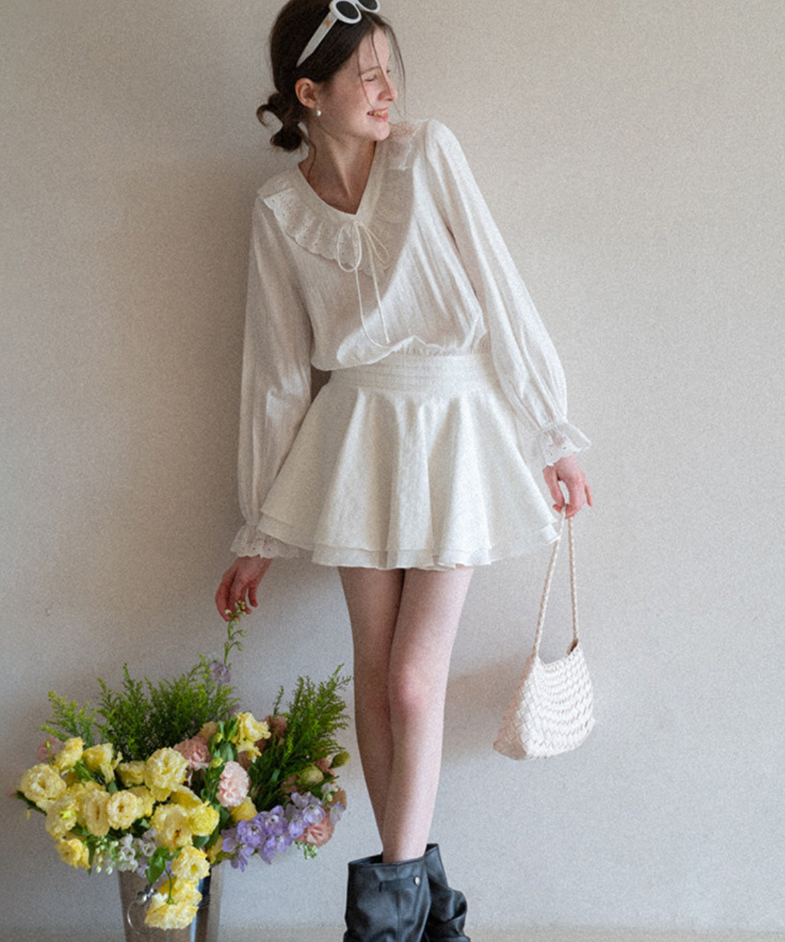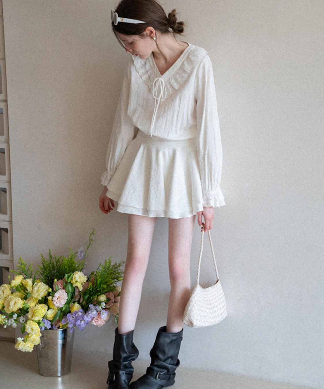 繊細なフリルカラーとレースディテールがクラシカルな雰囲気を醸し出すワンピースです。