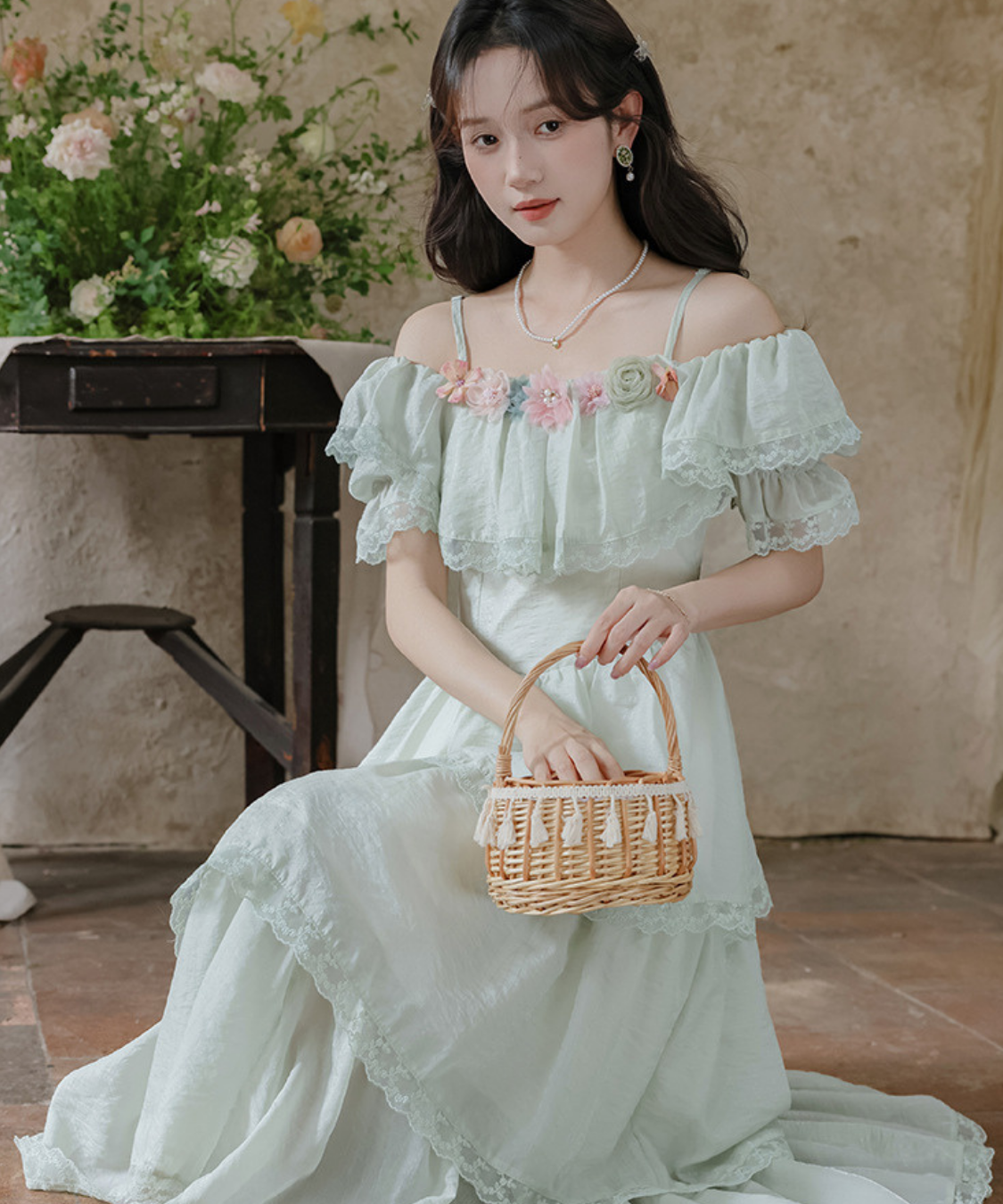 オフショルダーとフリルスリーブが華やかで、特別感のあるガーリーなワンピースです。