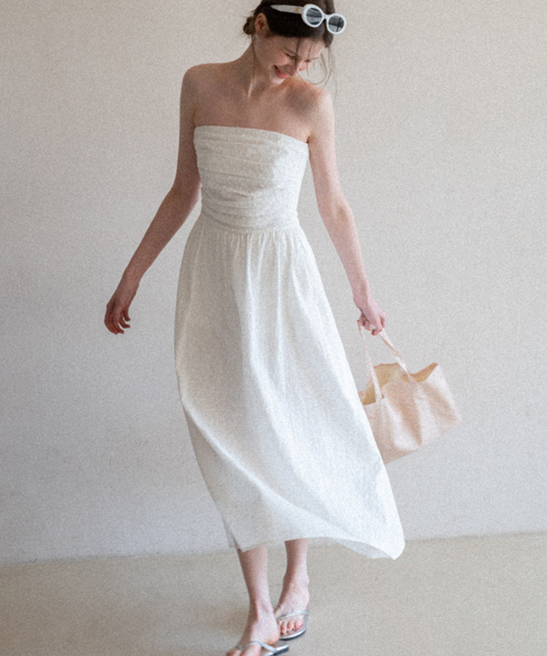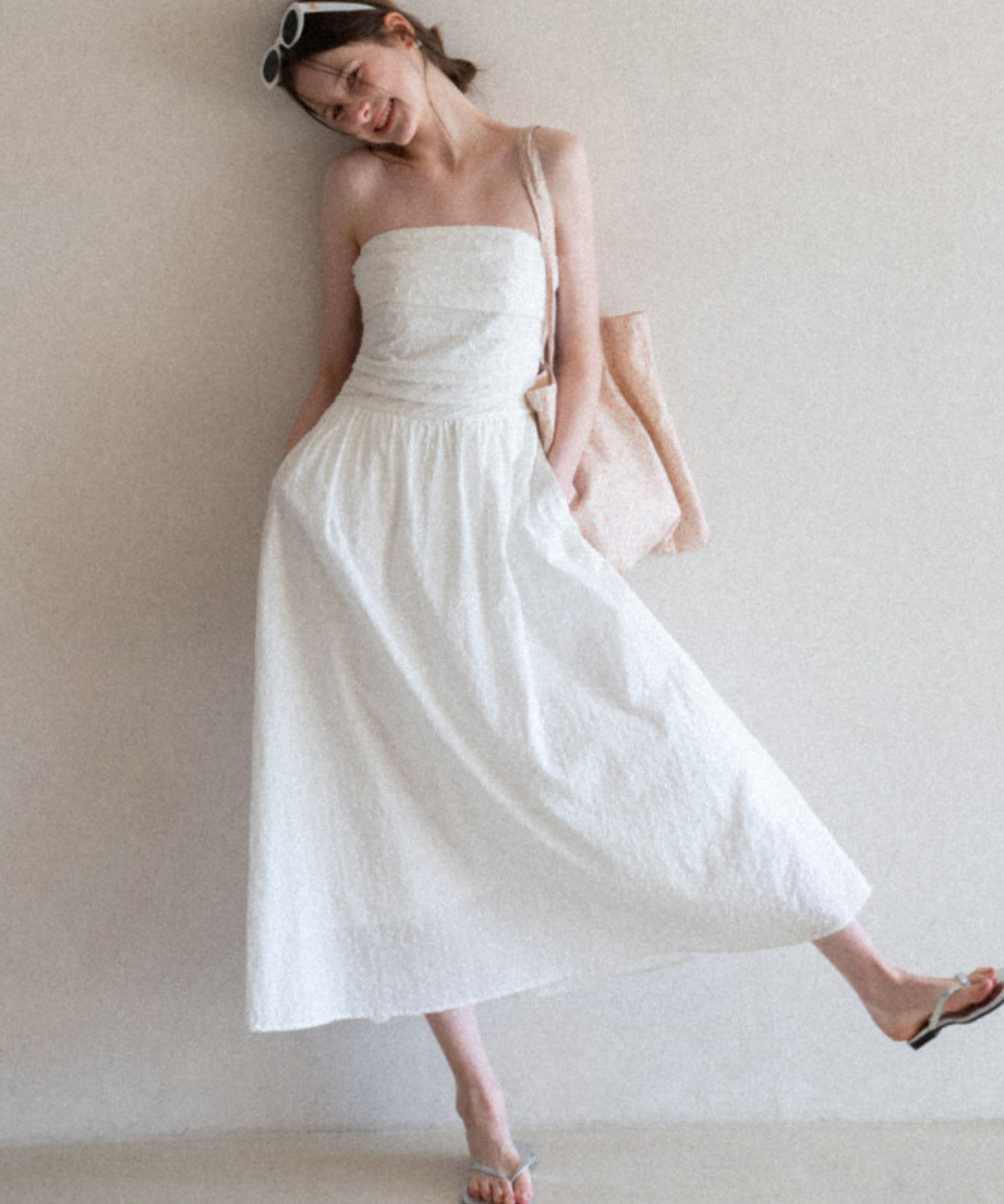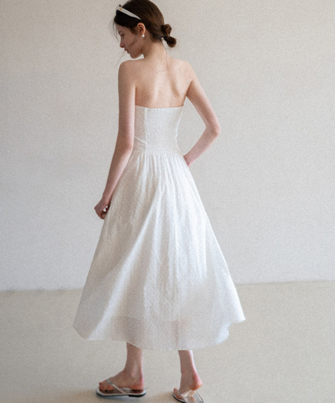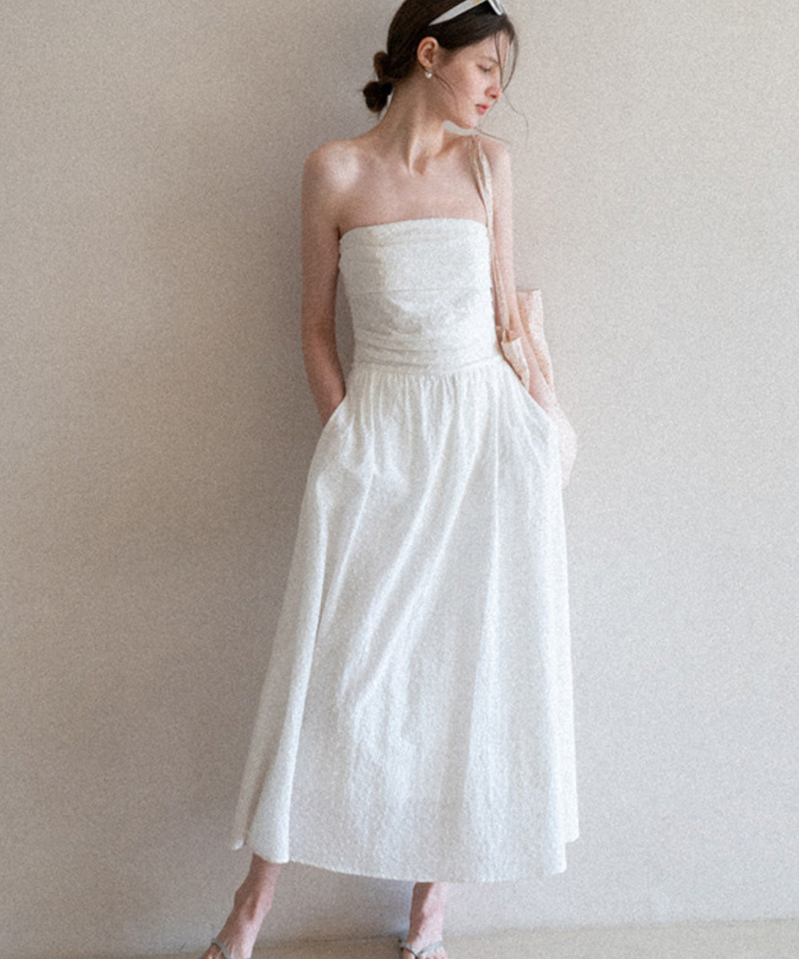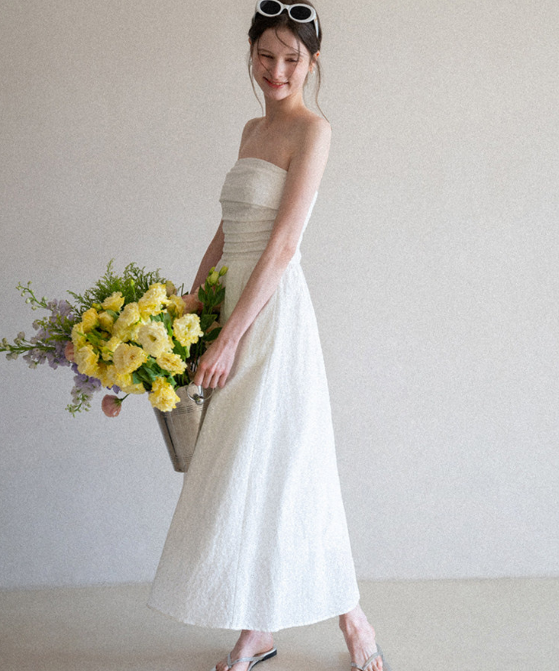 ベアトップデザインと切り替えフレアが、すっきりと女性らしい印象を与えるワンピースです。