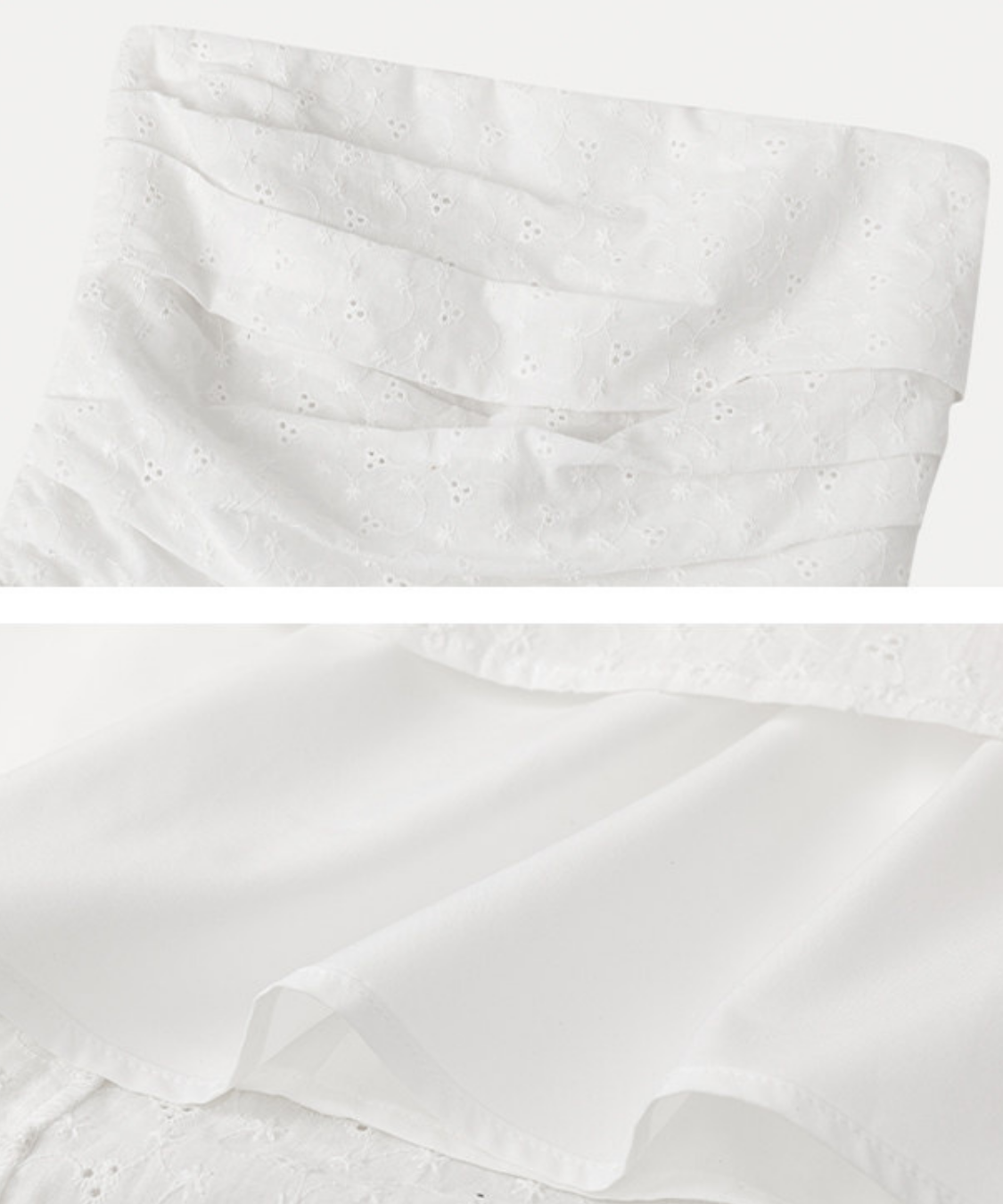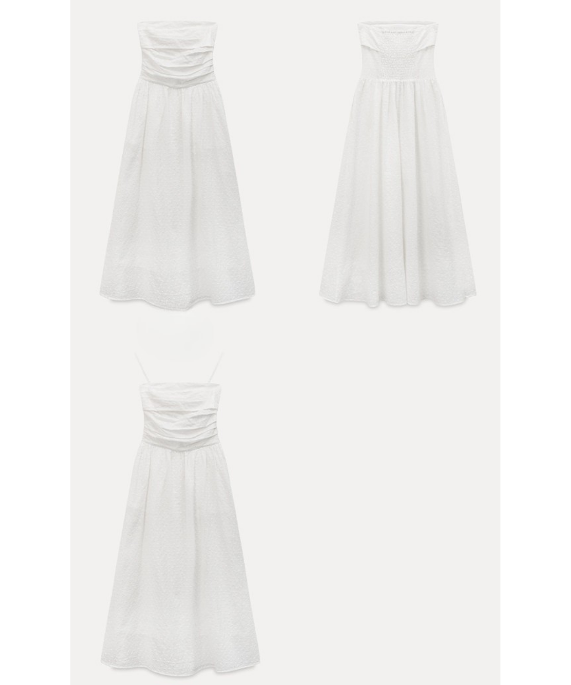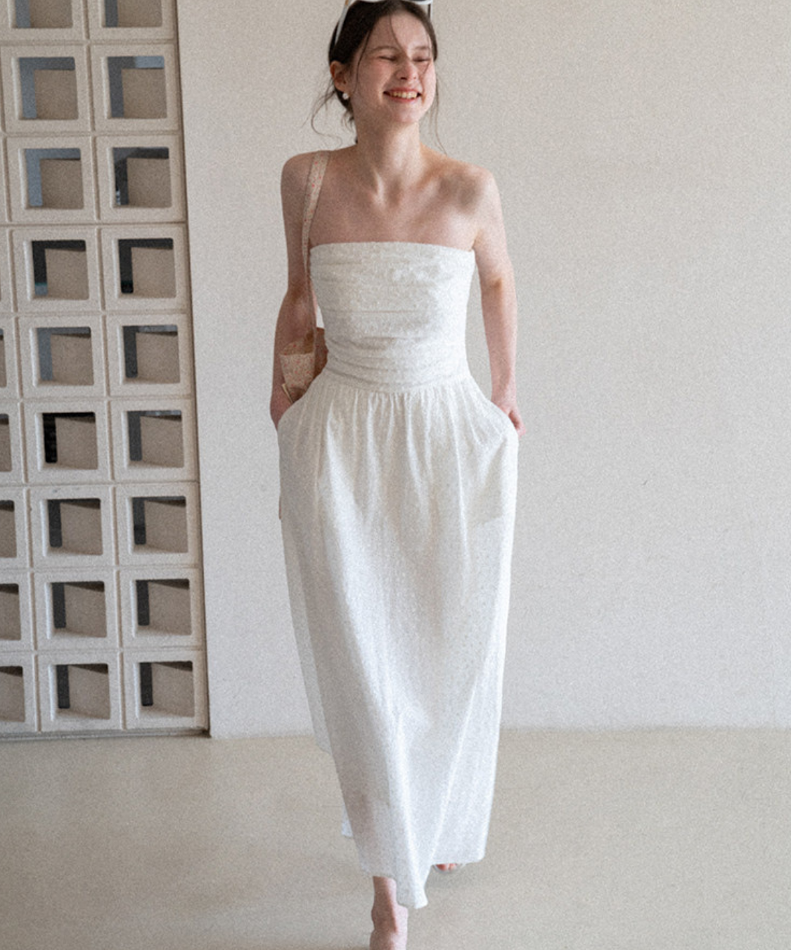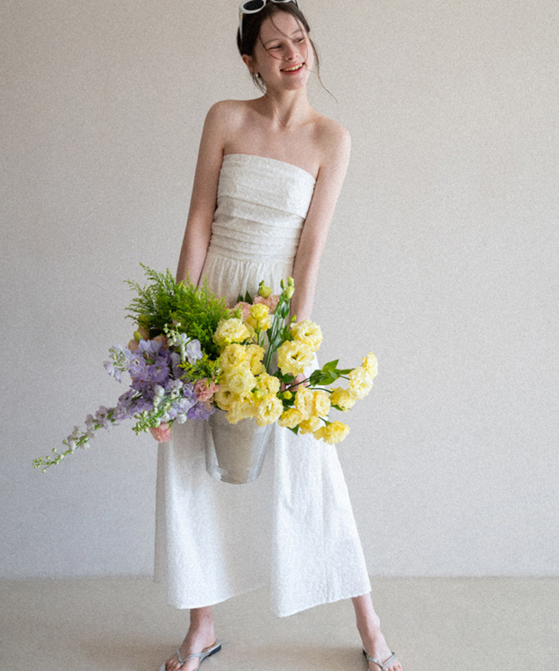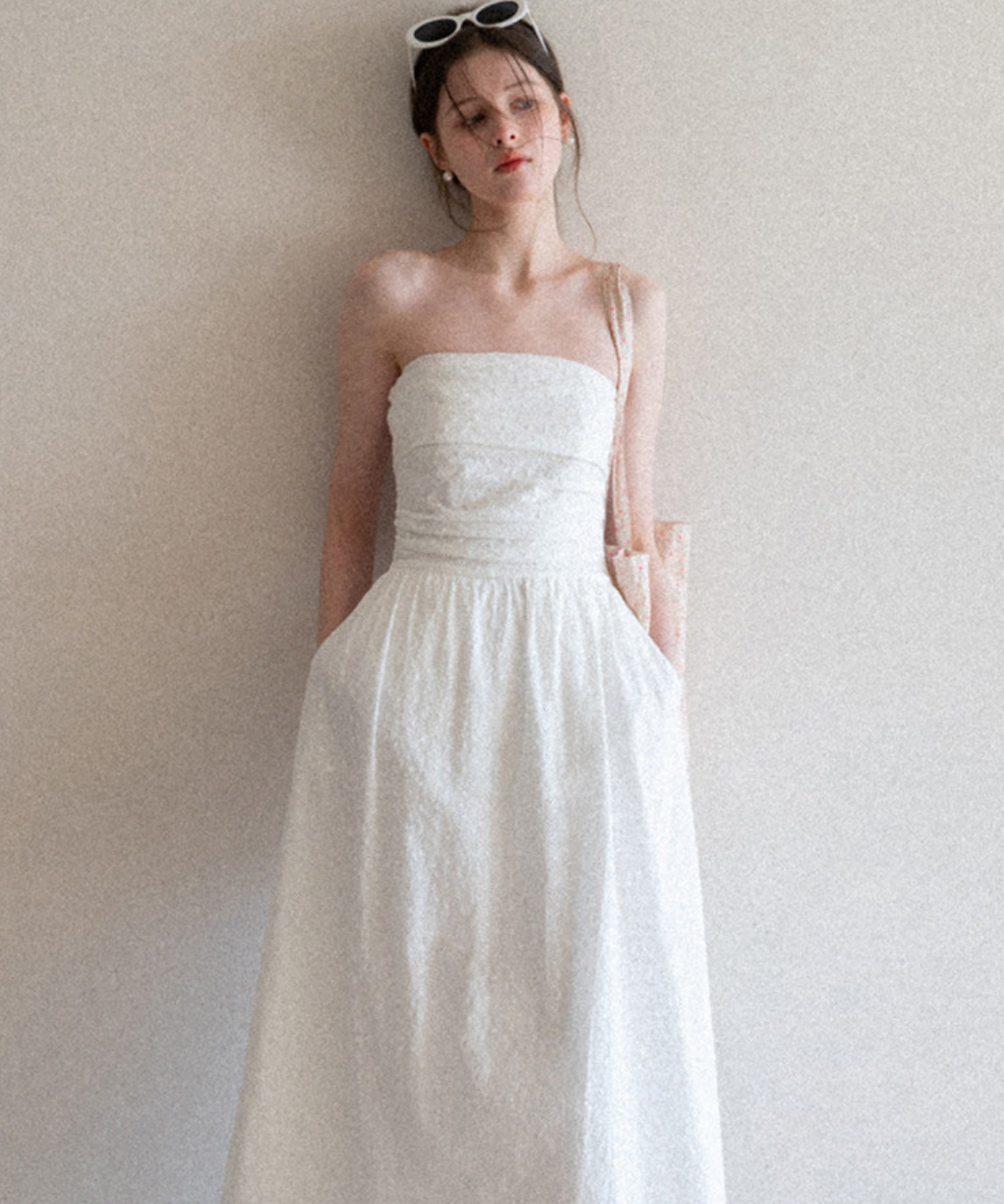 ベアトップデザインと切り替えフレアが、すっきりと女性らしい印象を与えるワンピースです。
