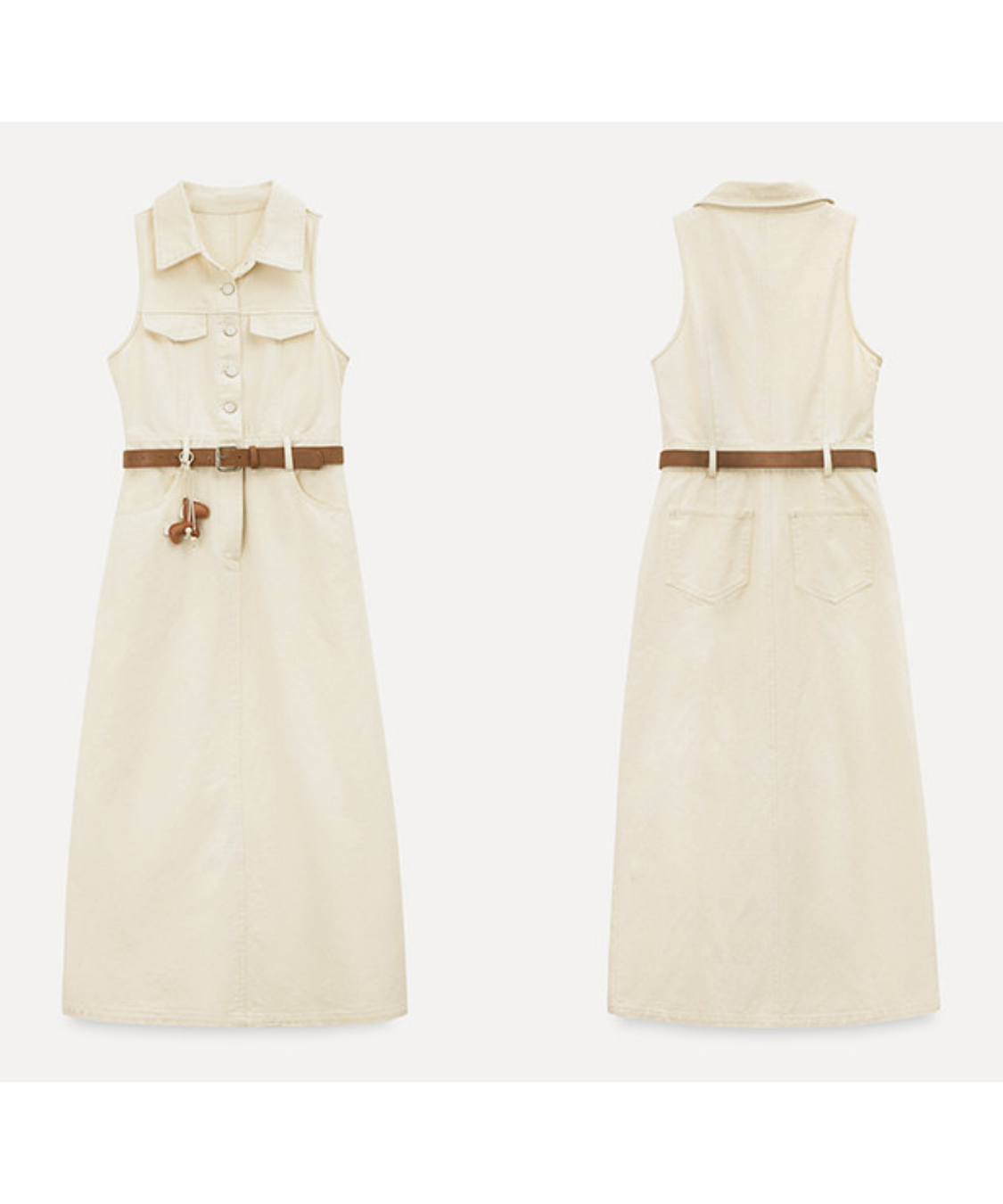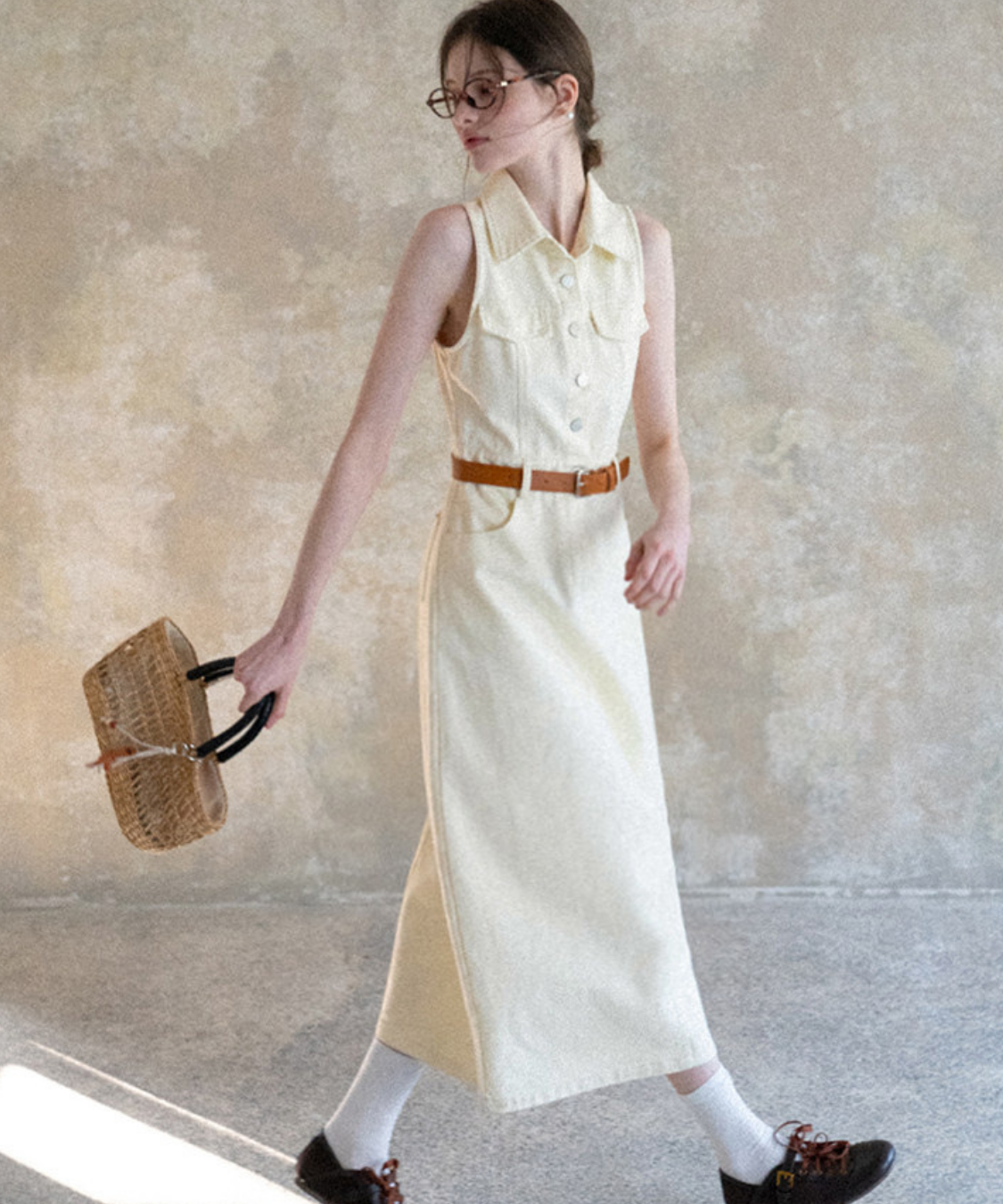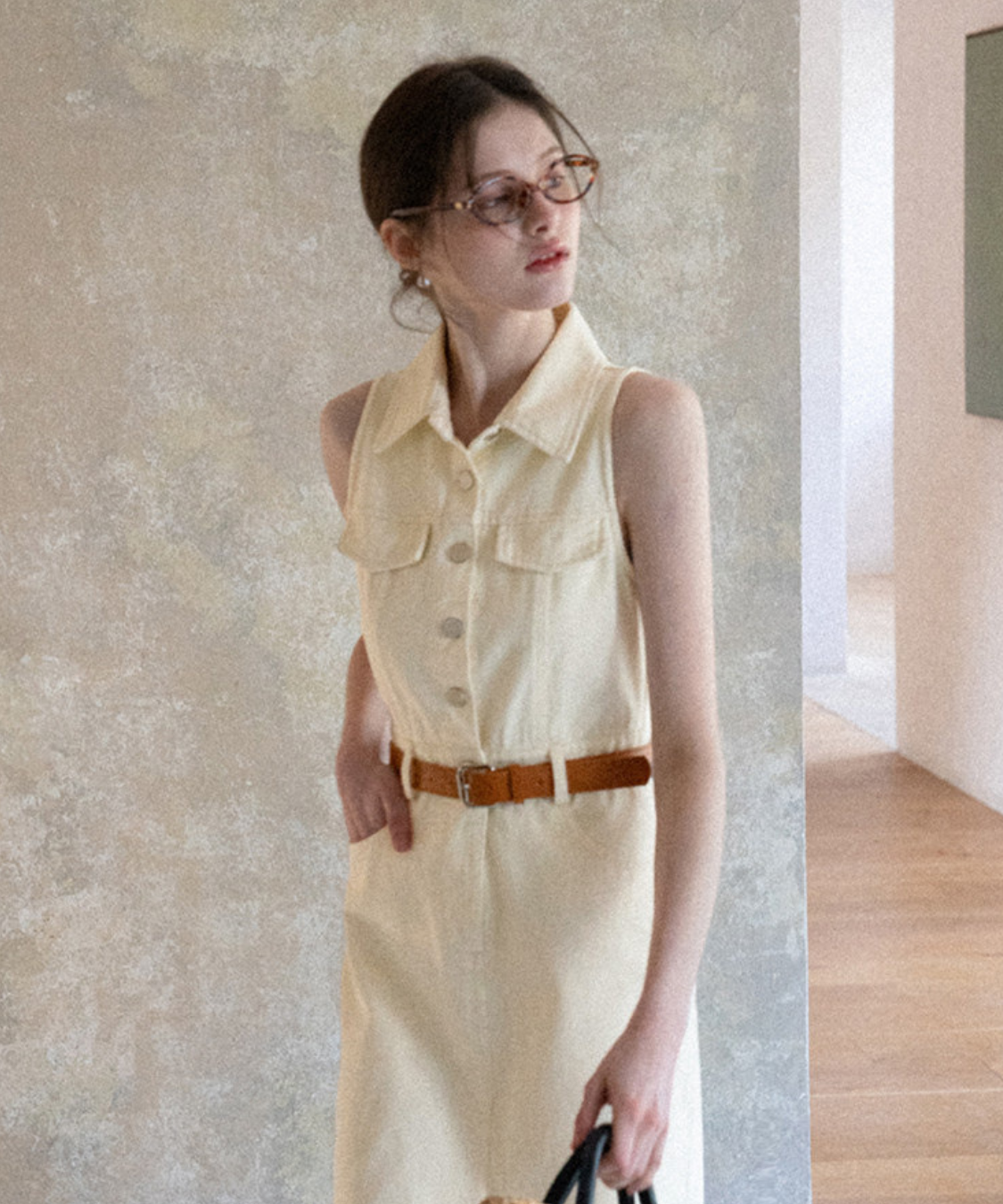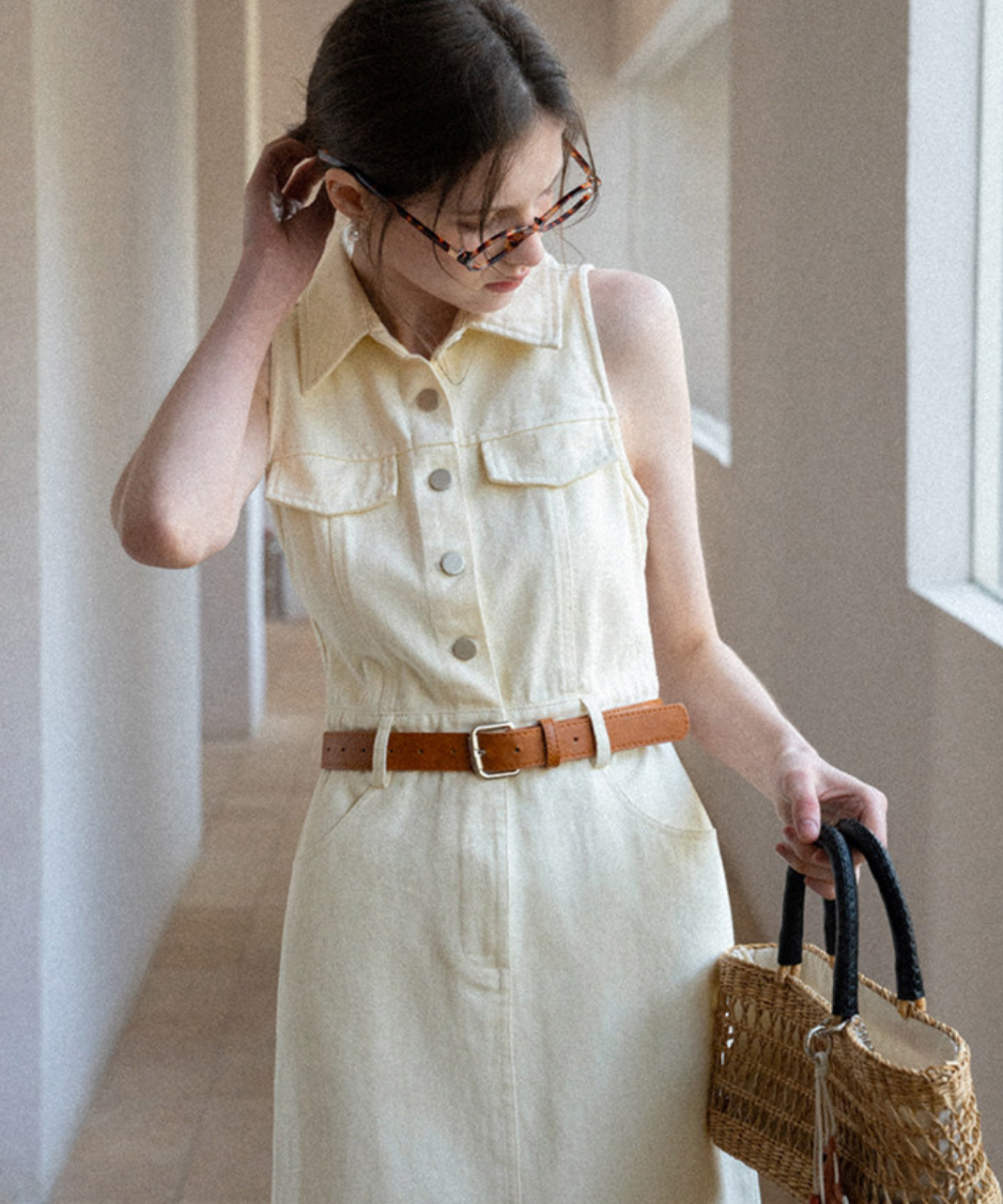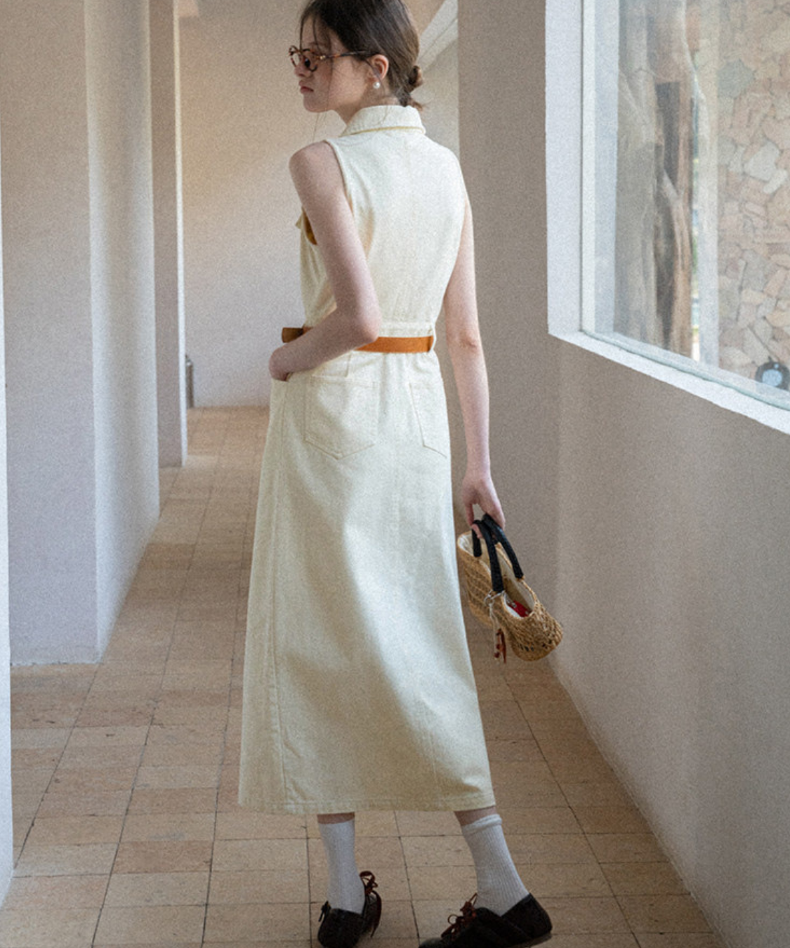 きちんと感のあるシャツカラーが魅力のノースリーブロングワンピースです。