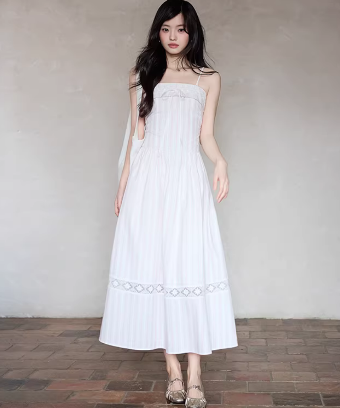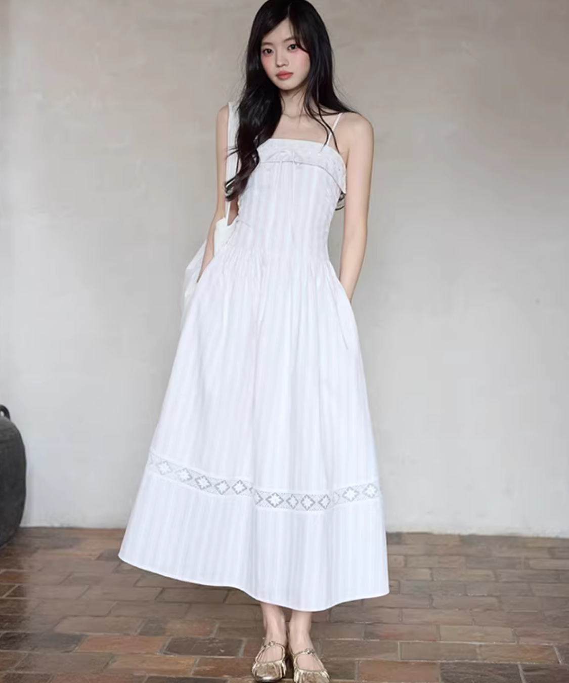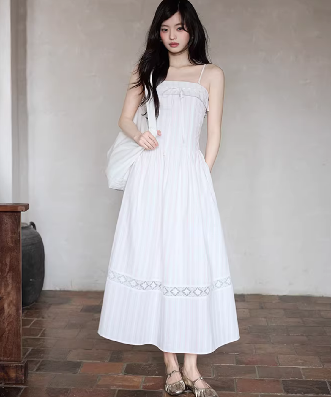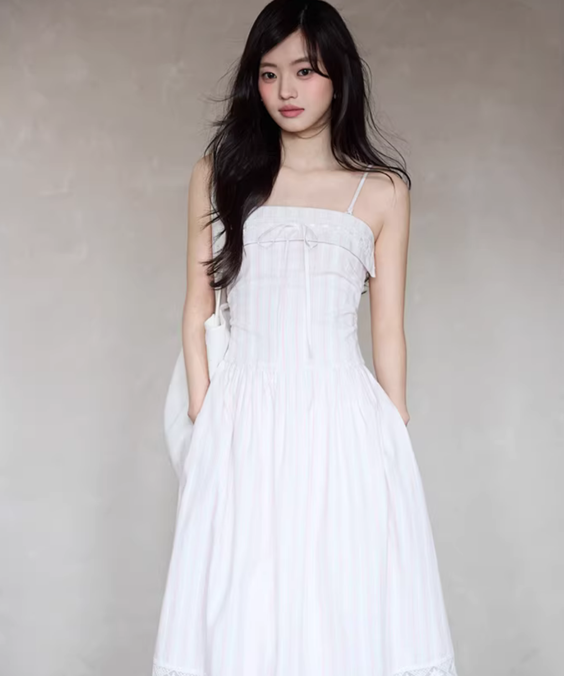 胸元のリボンがさりげなく可愛い、華奢ストラップのキャミワンピースです。