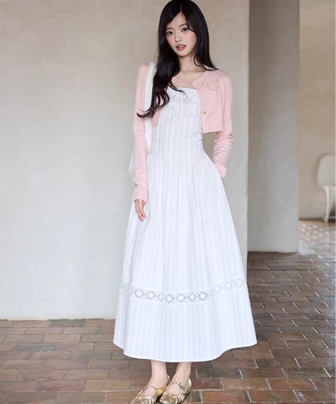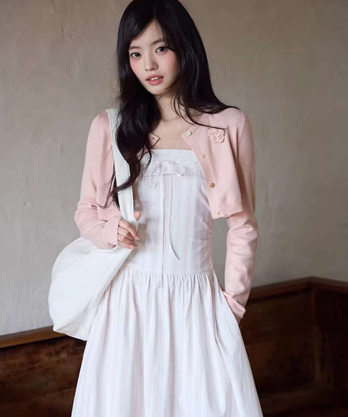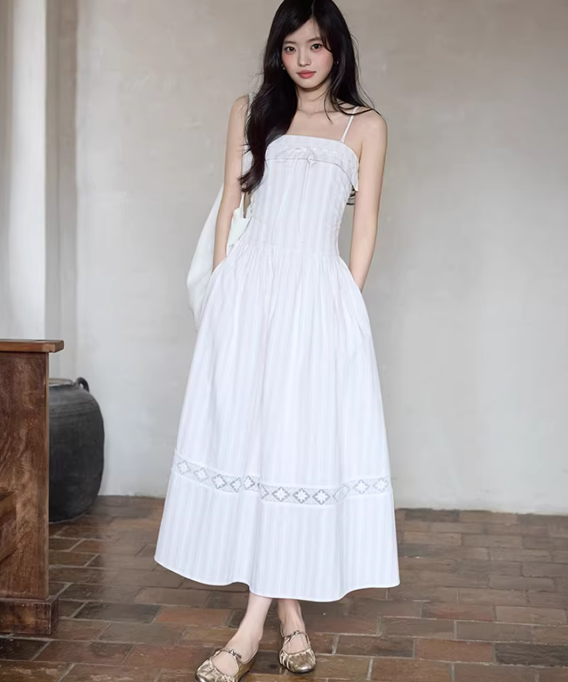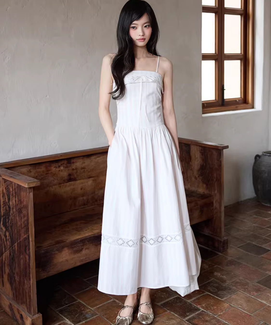 胸元のリボンがさりげなく可愛い、華奢ストラップのキャミワンピースです。