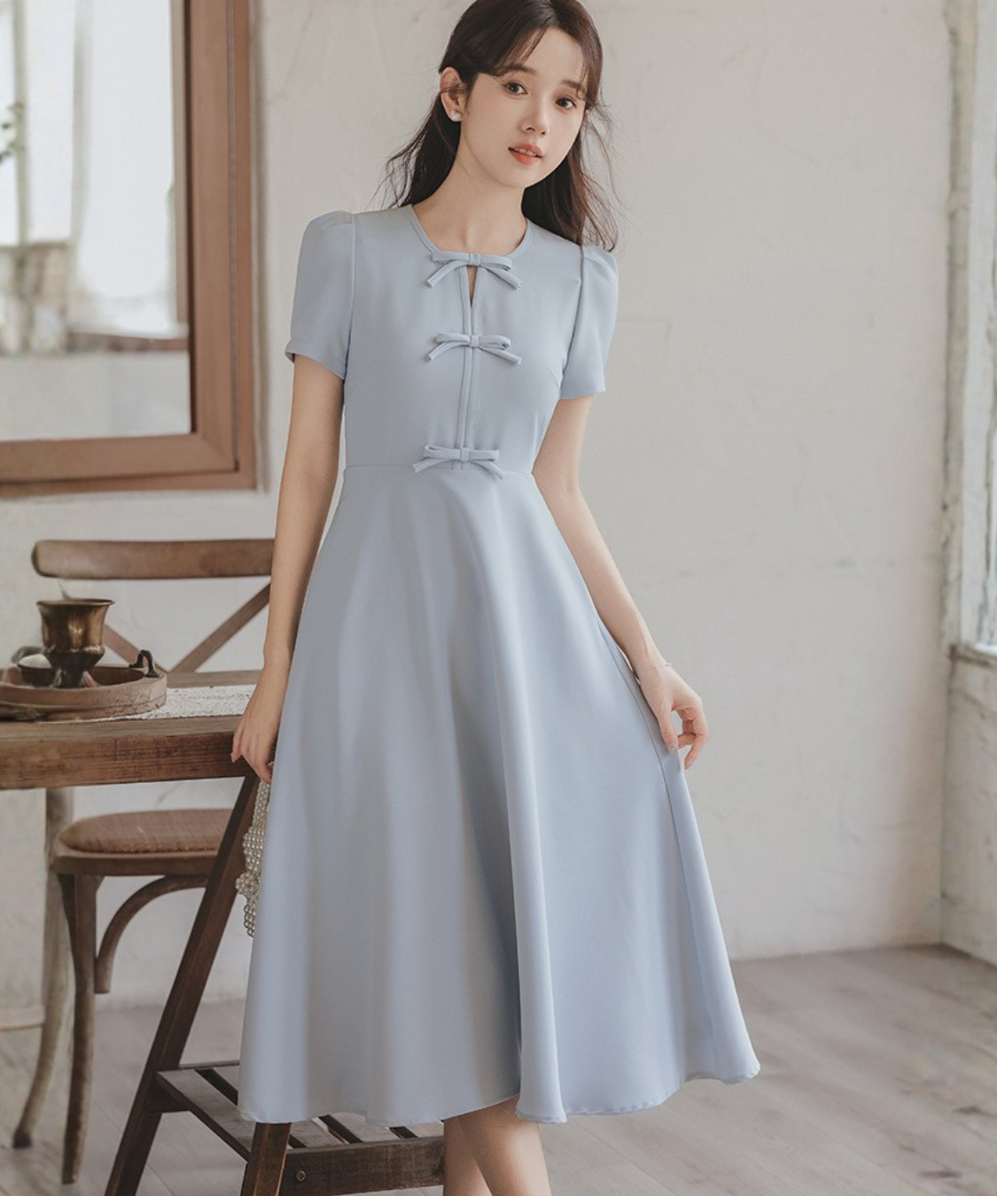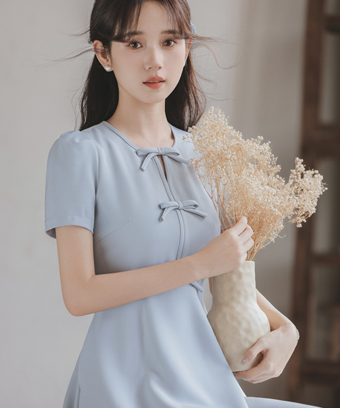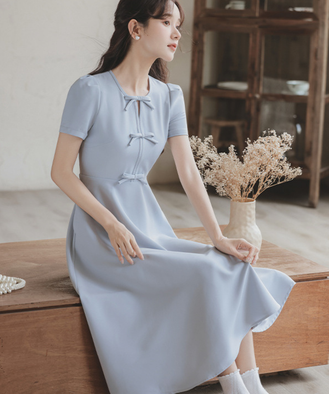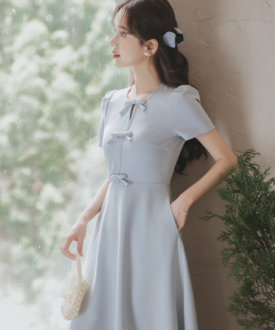 フロントのリボンディテールが愛らしく映える、上品フェミニンな半袖フレアワンピースです。