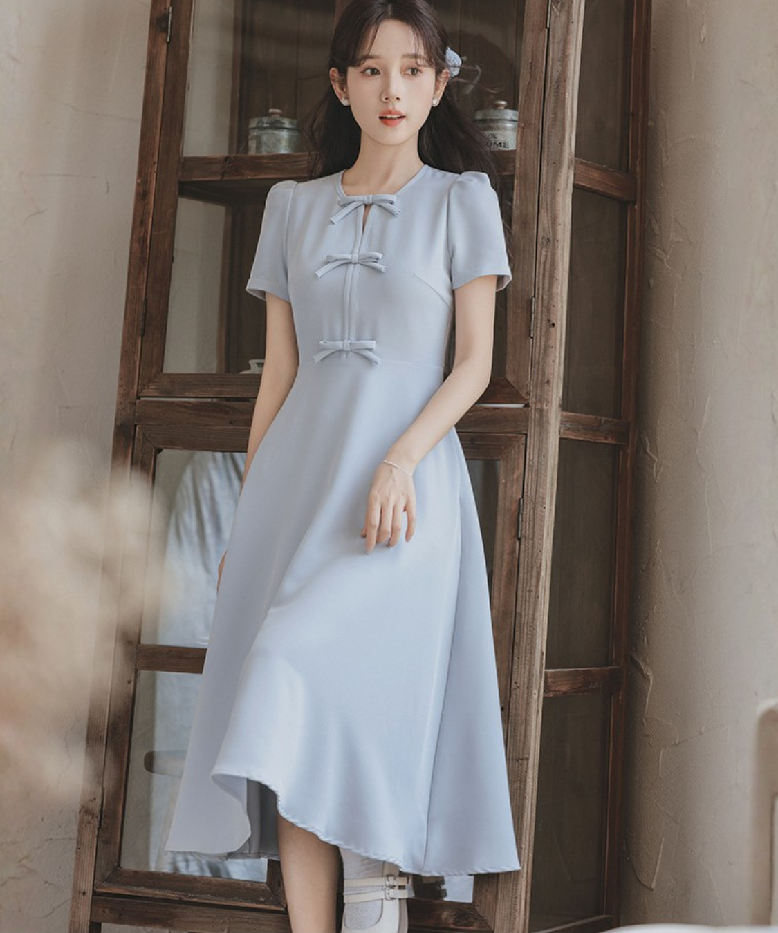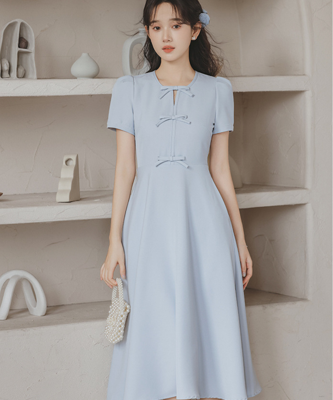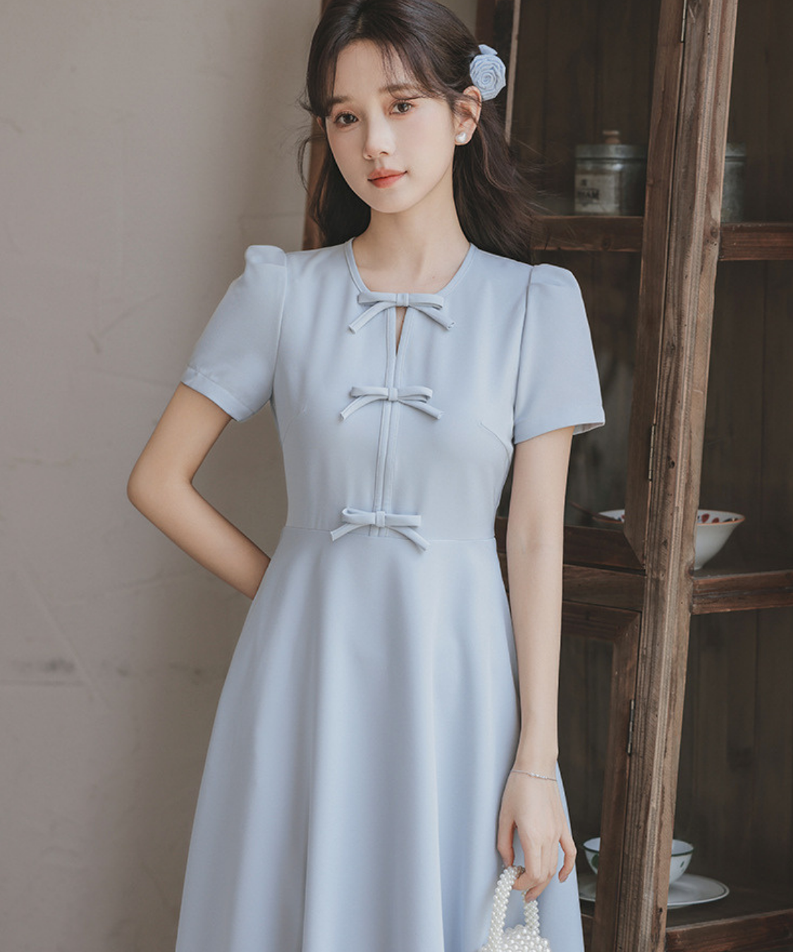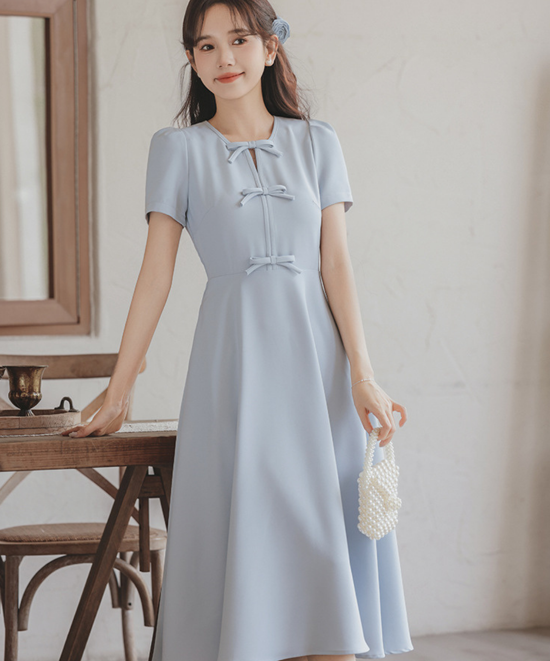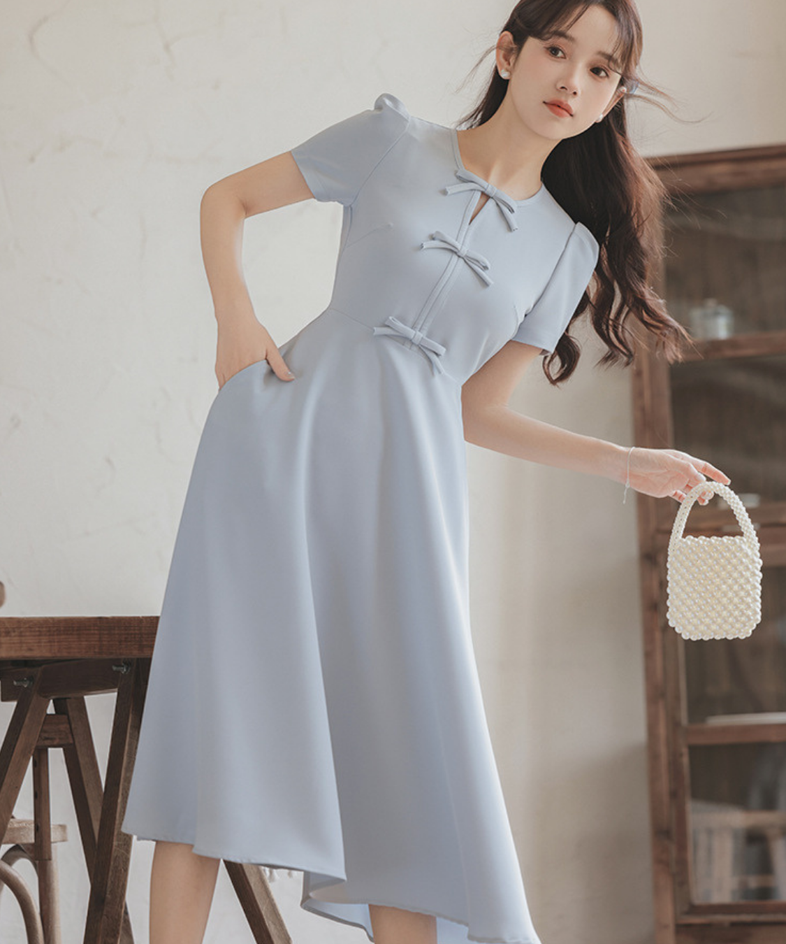 フロントのリボンディテールが愛らしく映える、上品フェミニンな半袖フレアワンピースです。