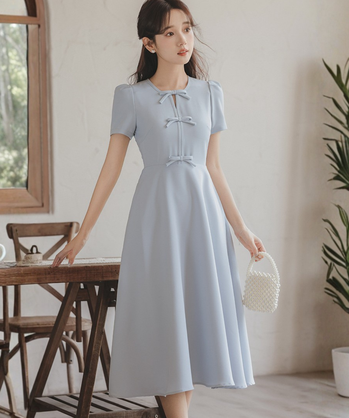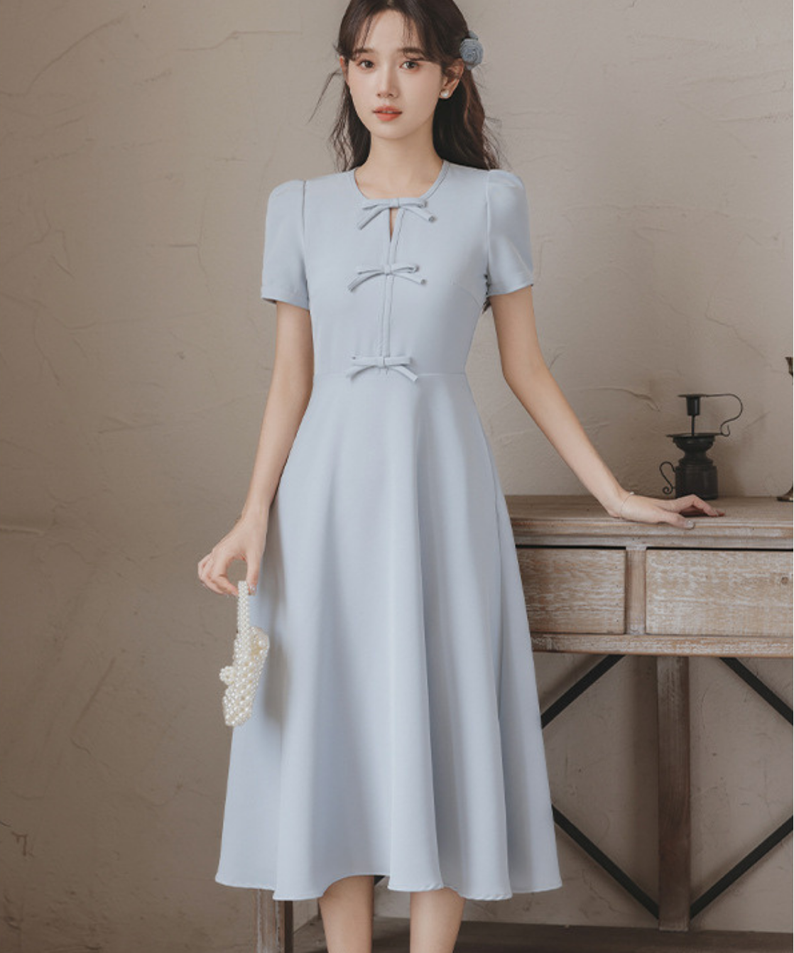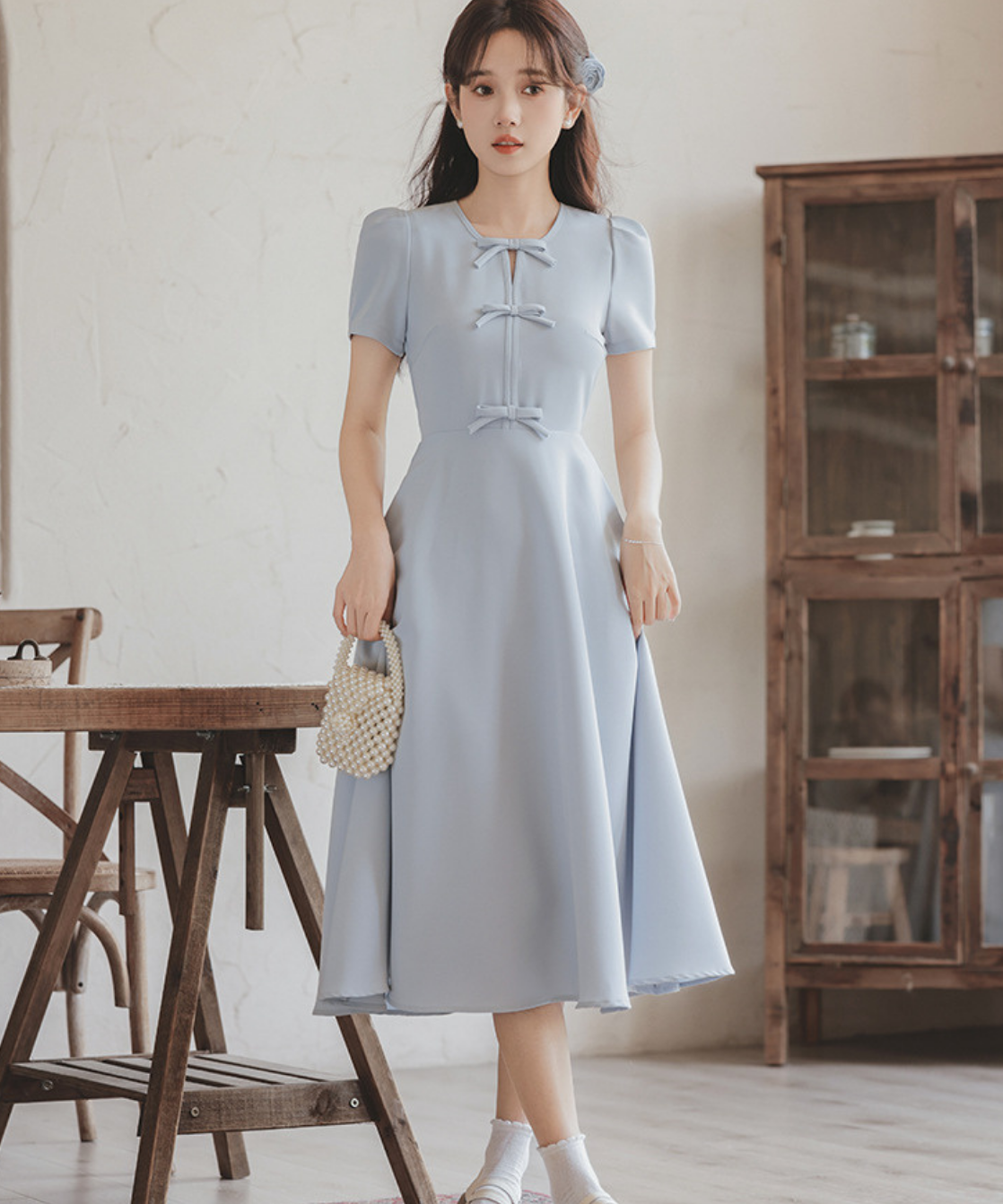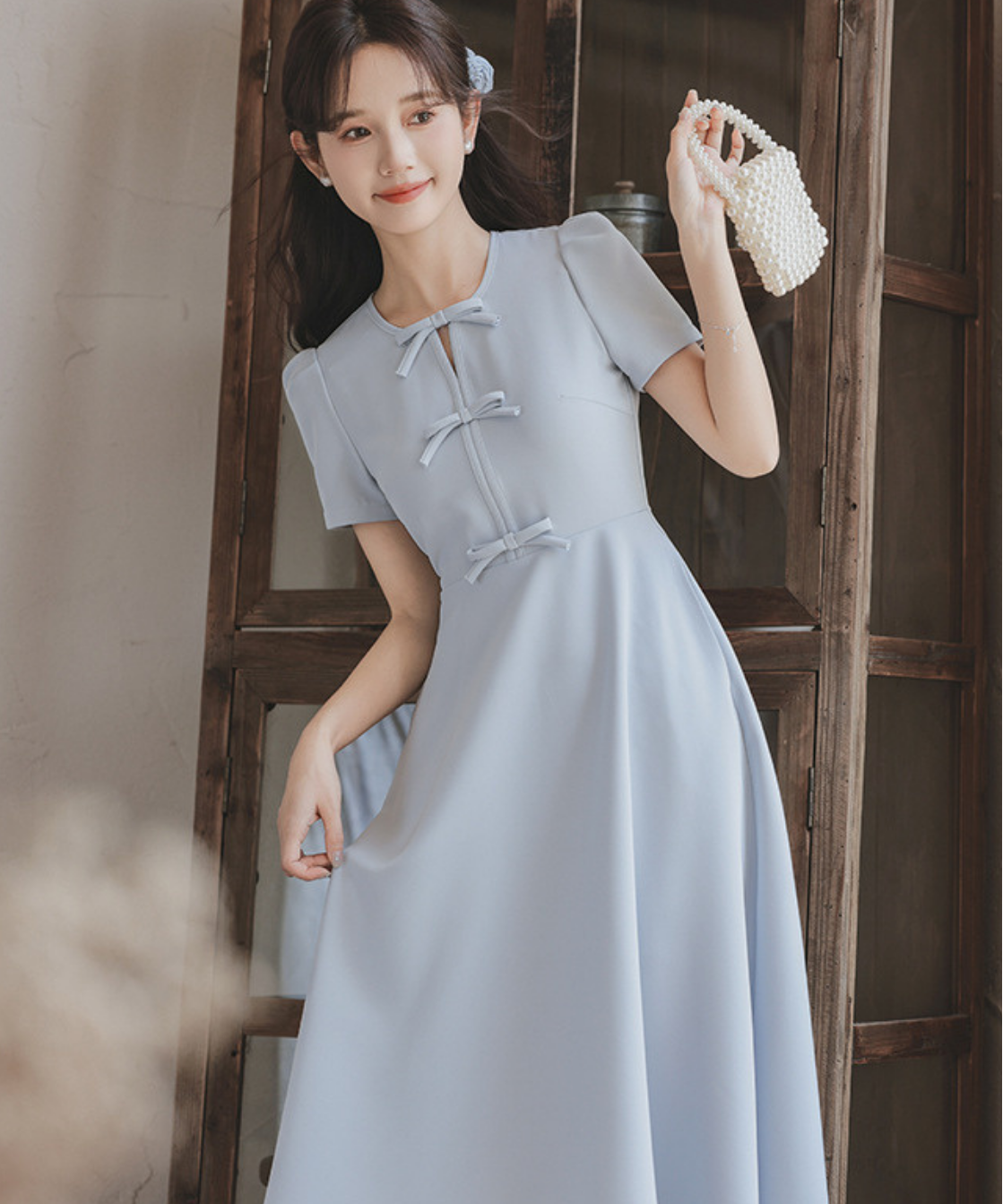 フロントのリボンディテールが愛らしく映える、上品フェミニンな半袖フレアワンピースです。