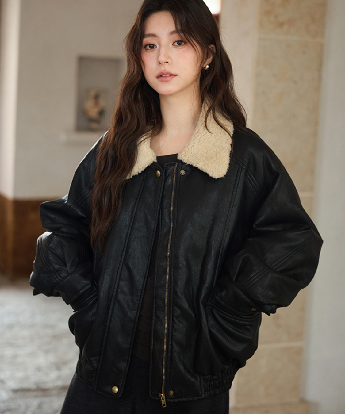 ヴィンテージライクな雰囲気が漂う、ボア襟付きフェイクレザーブルゾンです。
