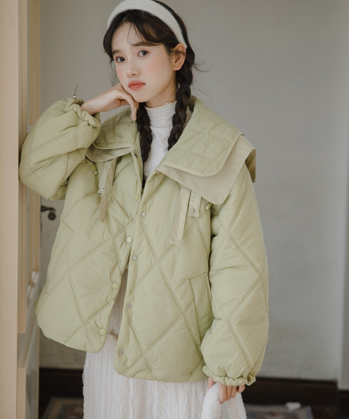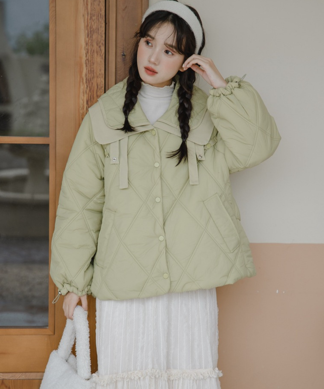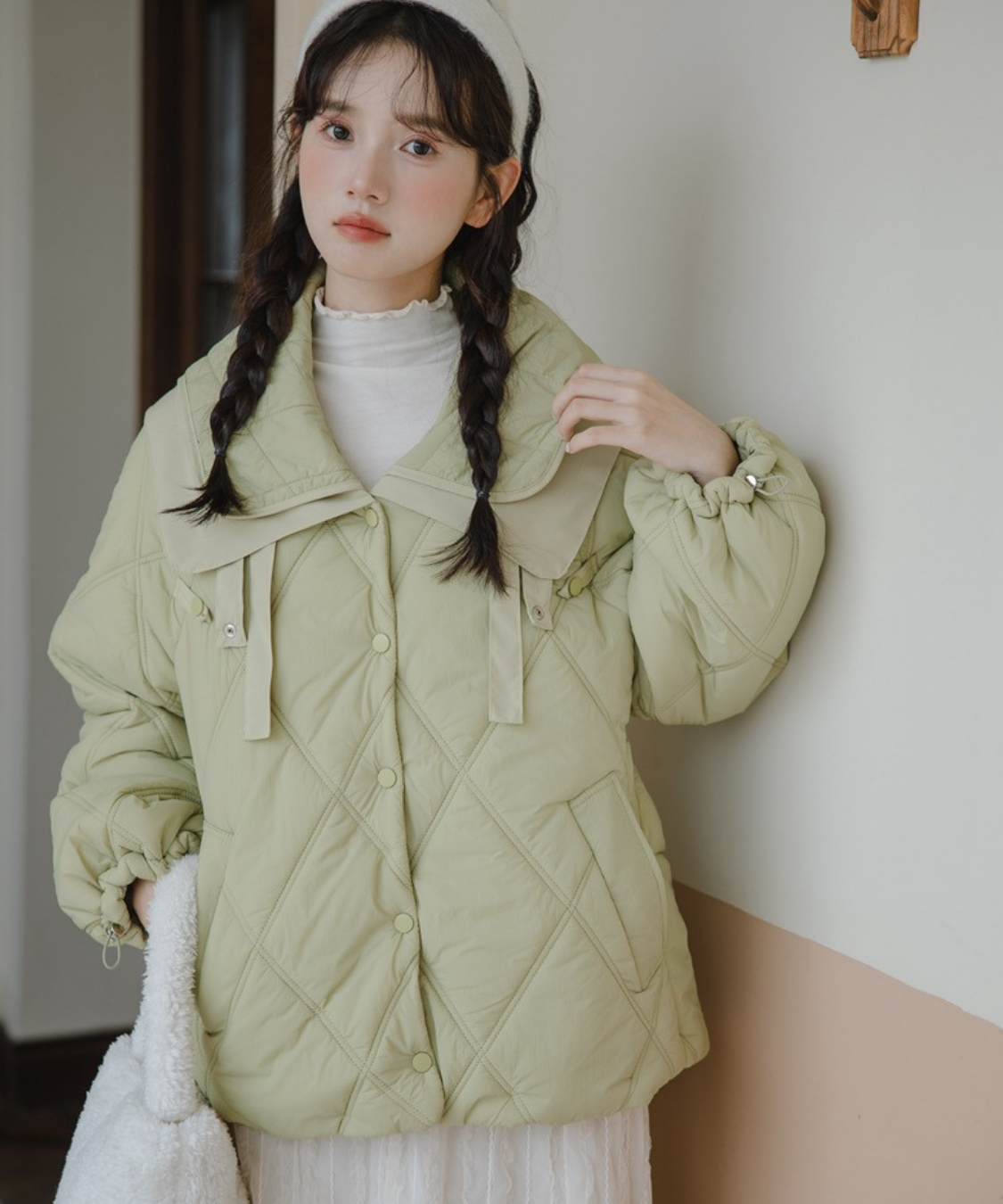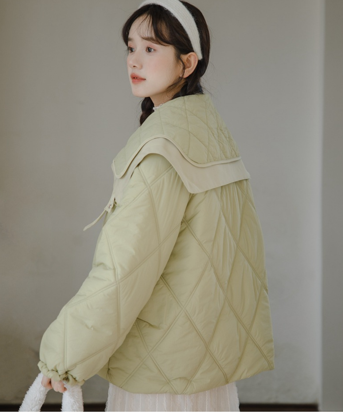 セーラー襟を2重に重ねたガーリーなデザインが目を引くキルティングジャケットです。