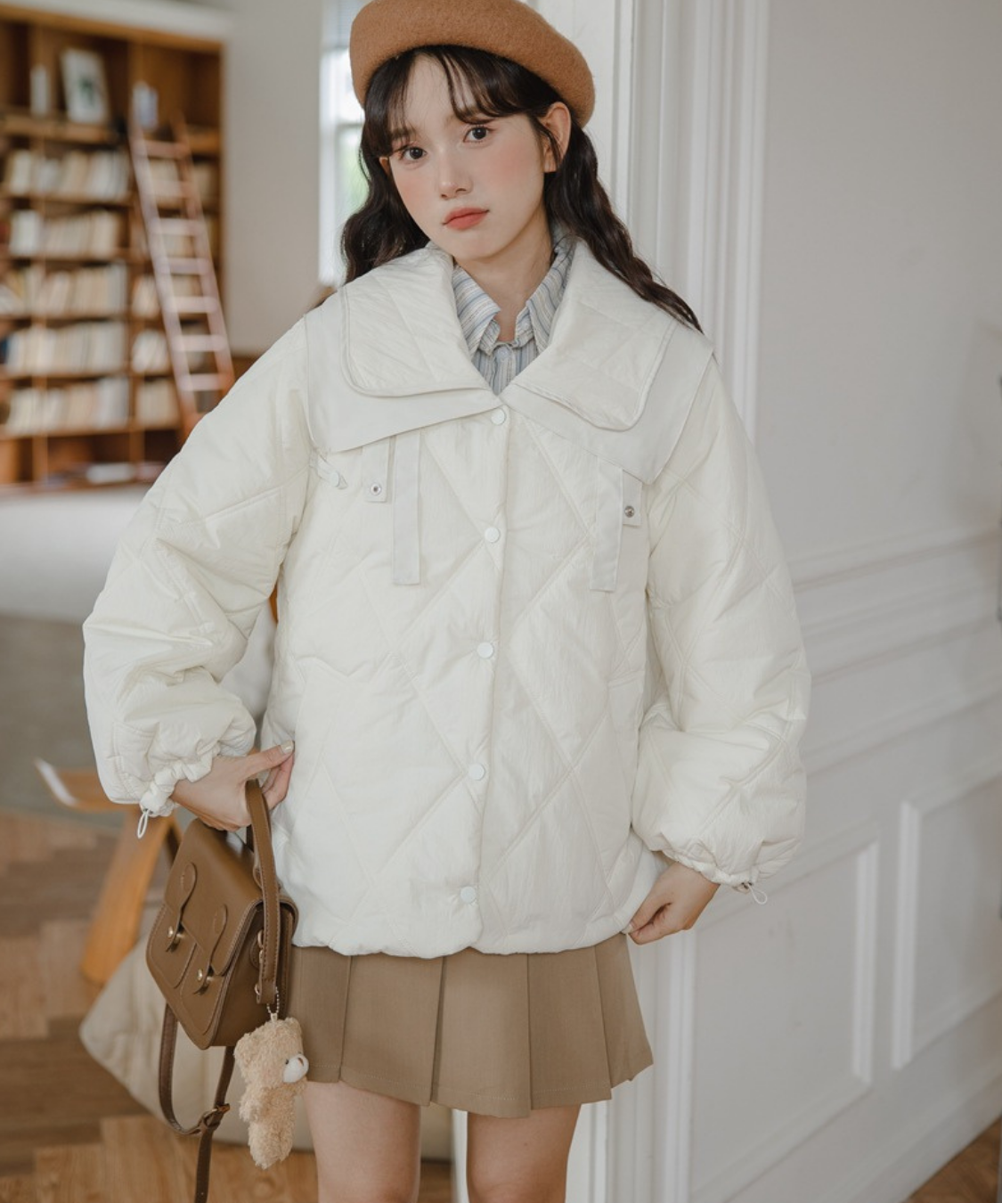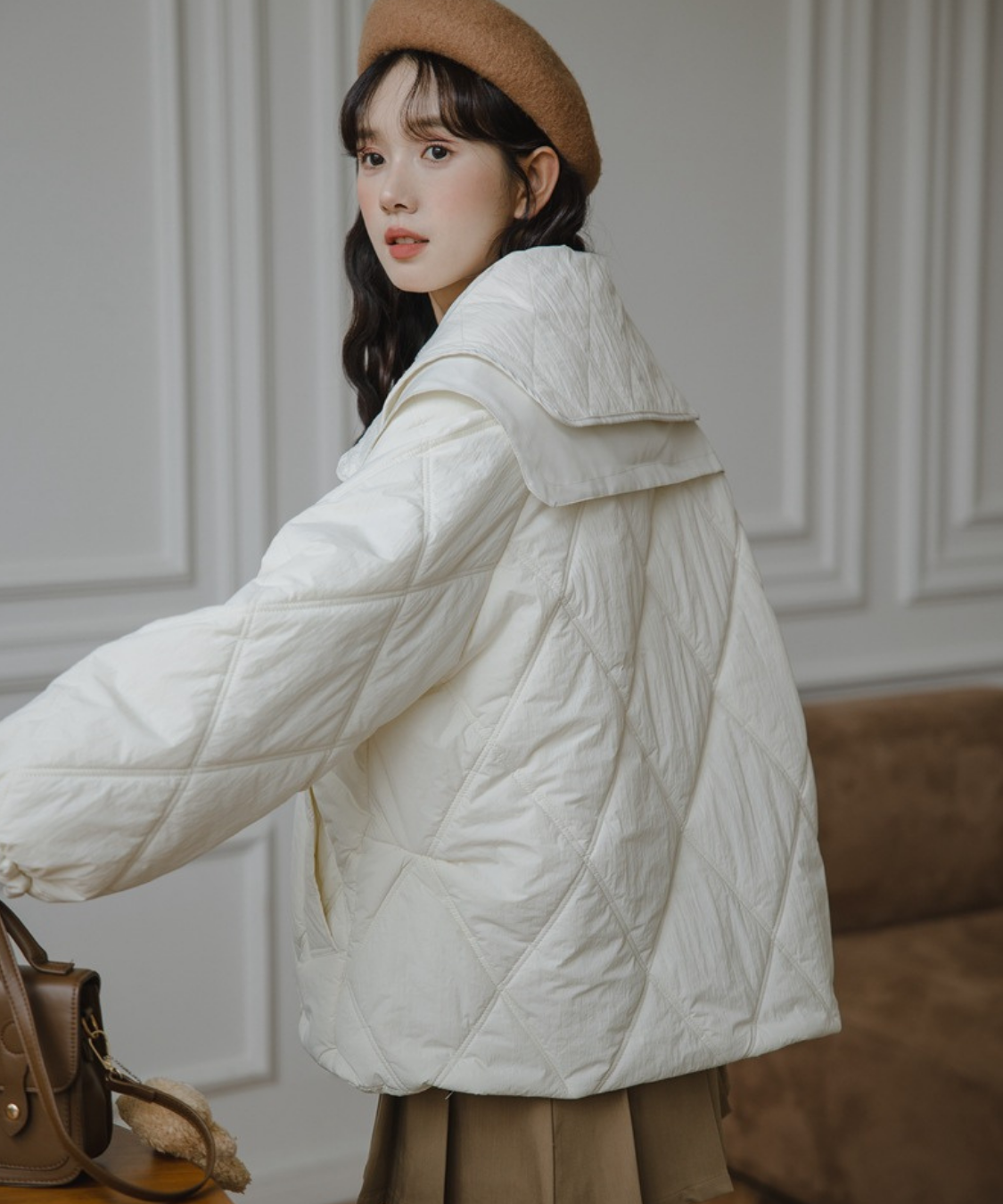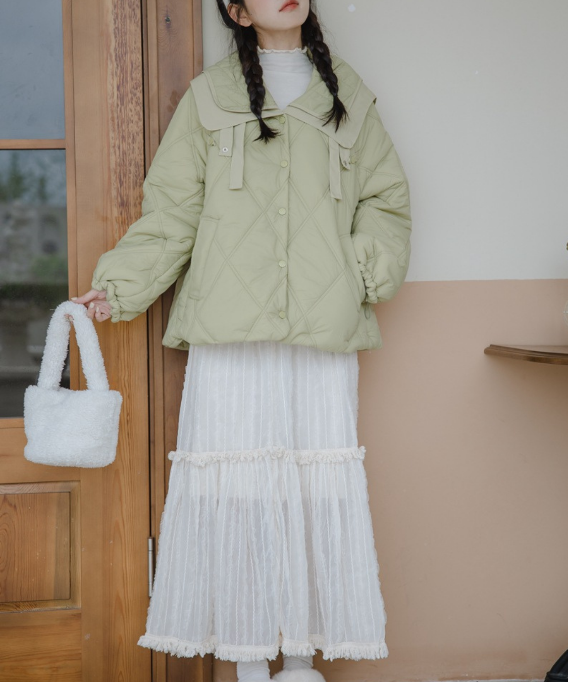 セーラー襟を2重に重ねたガーリーなデザインが目を引くキルティングジャケットです。