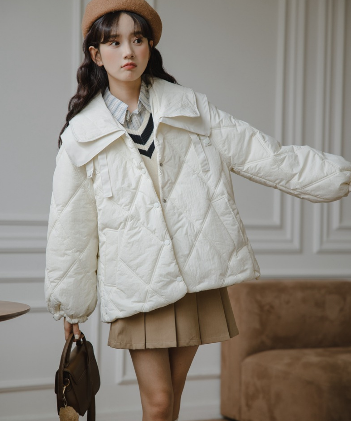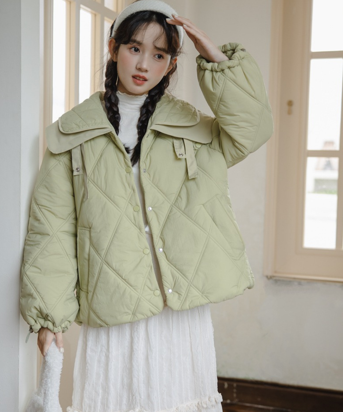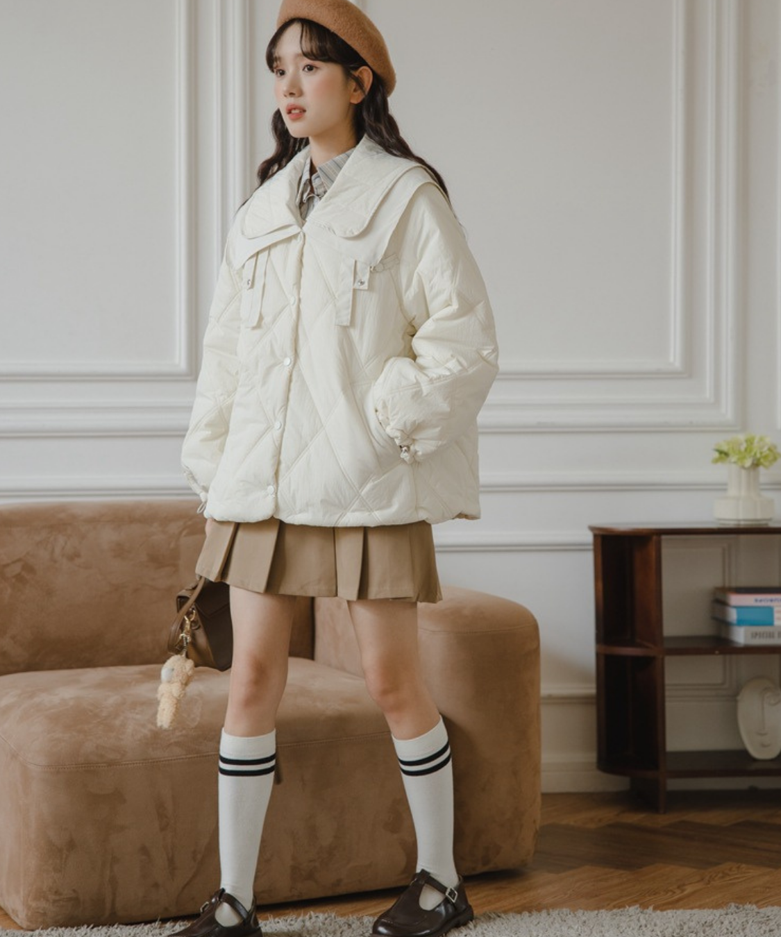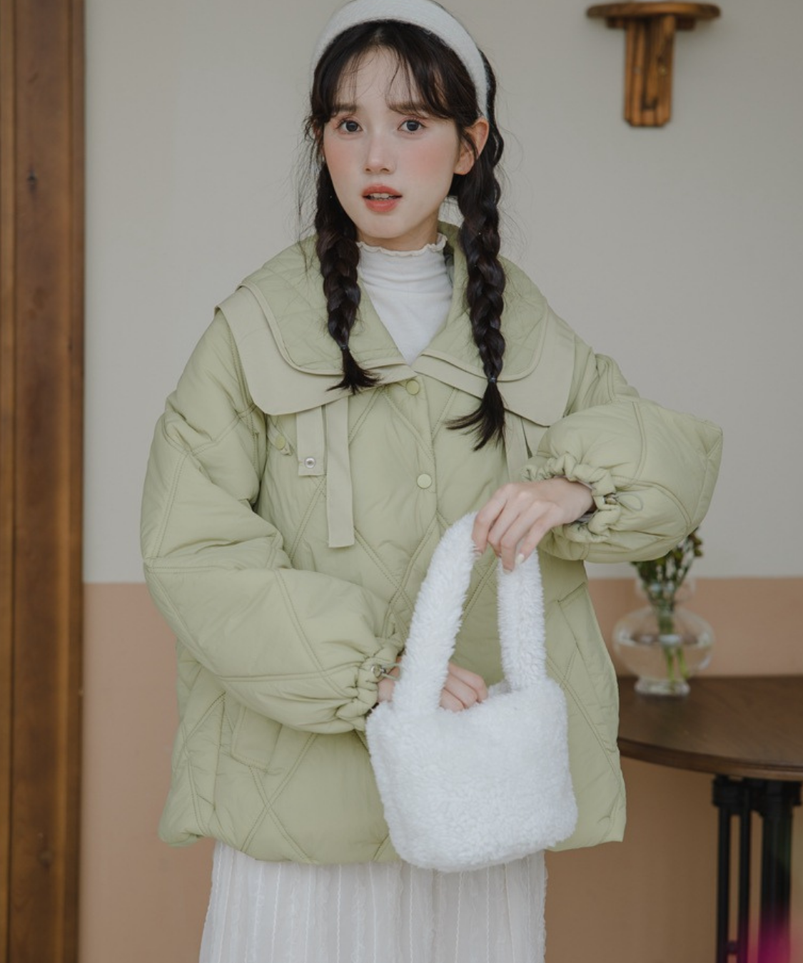 セーラー襟を2重に重ねたガーリーなデザインが目を引くキルティングジャケットです。