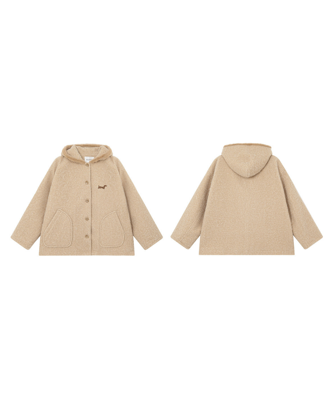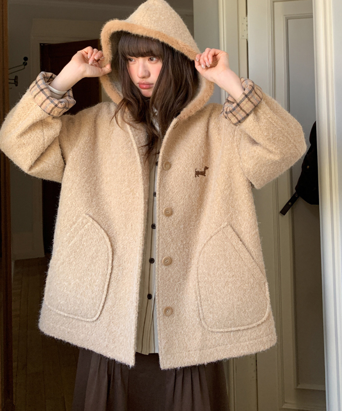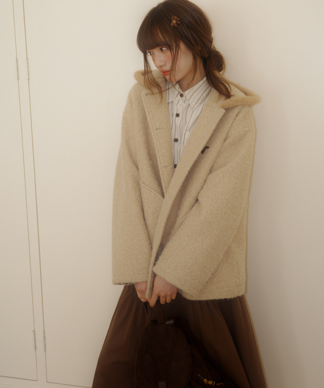 もこもこのボア素材がやさしく包み込んでくれる、ほっこり可愛いフード付きアウターです。
