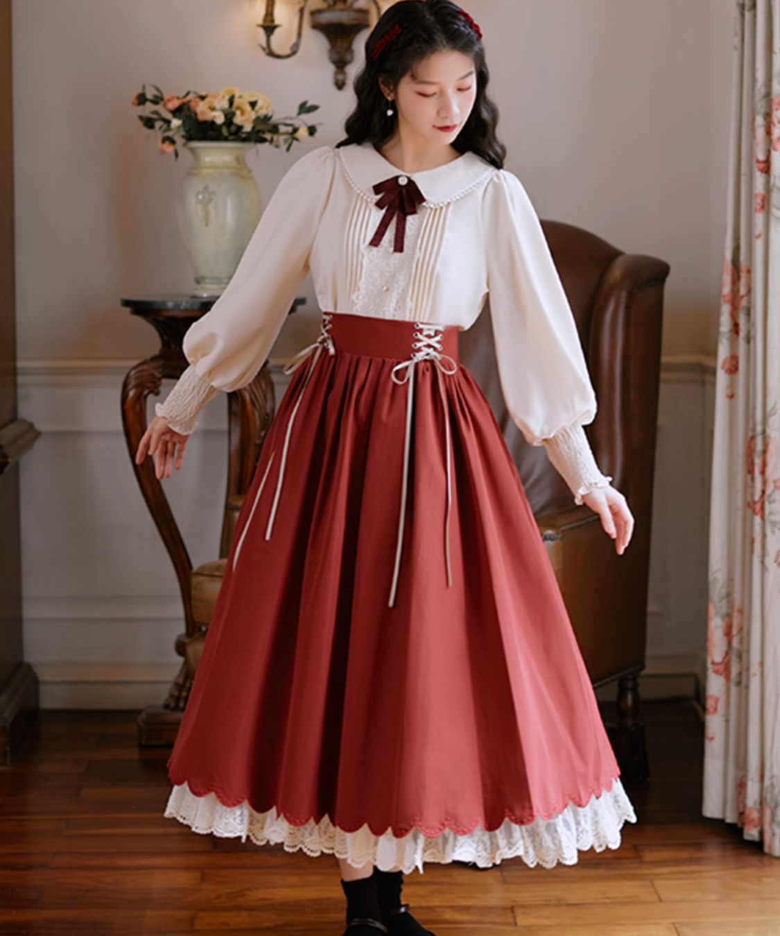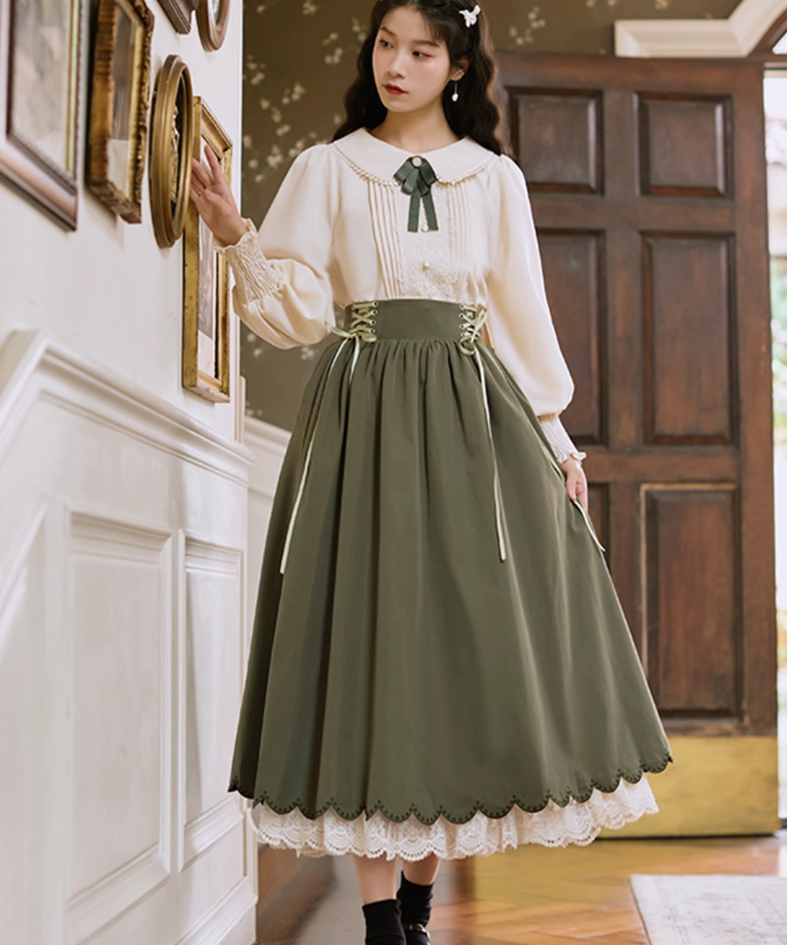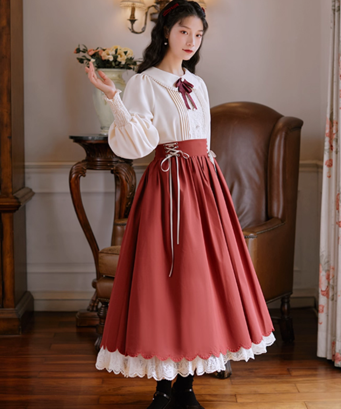 レースとピンタックが上品に映える、クラシカルなブラウスとスカートのセットアップです。