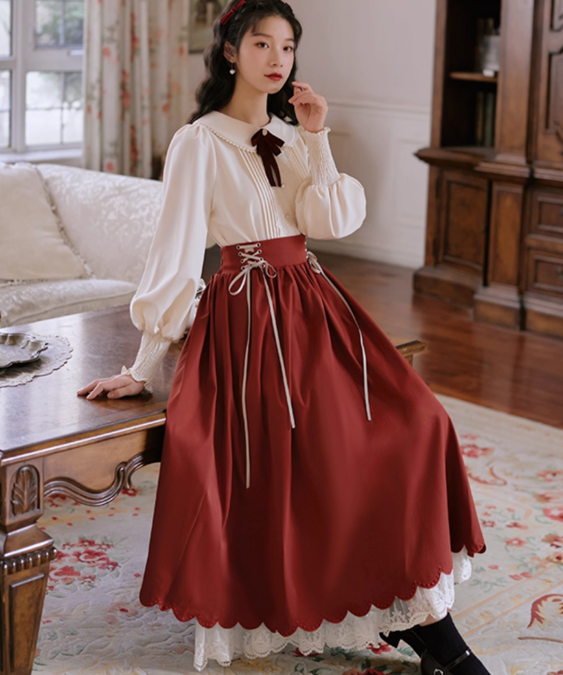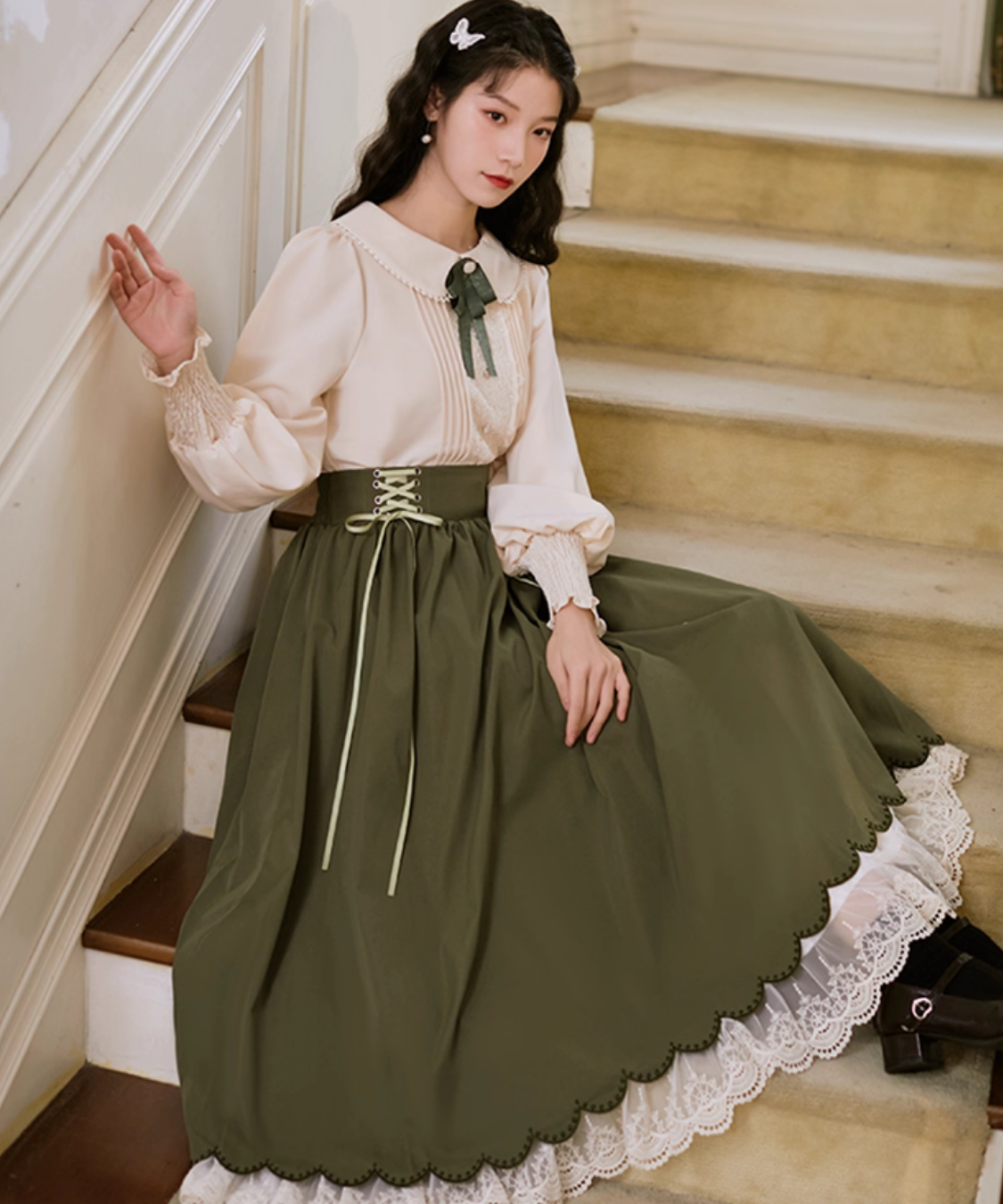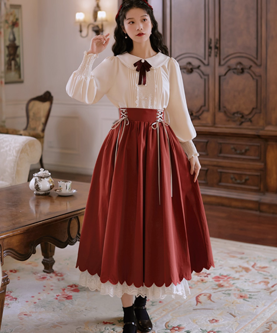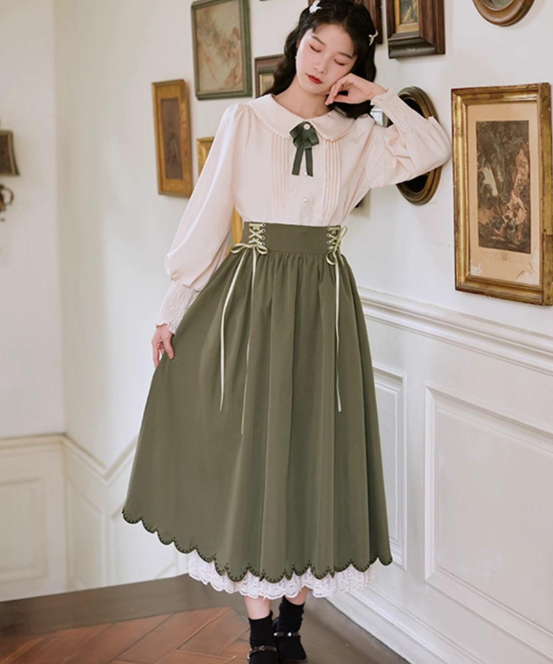 レースとピンタックが上品に映える、クラシカルなブラウスとスカートのセットアップです。