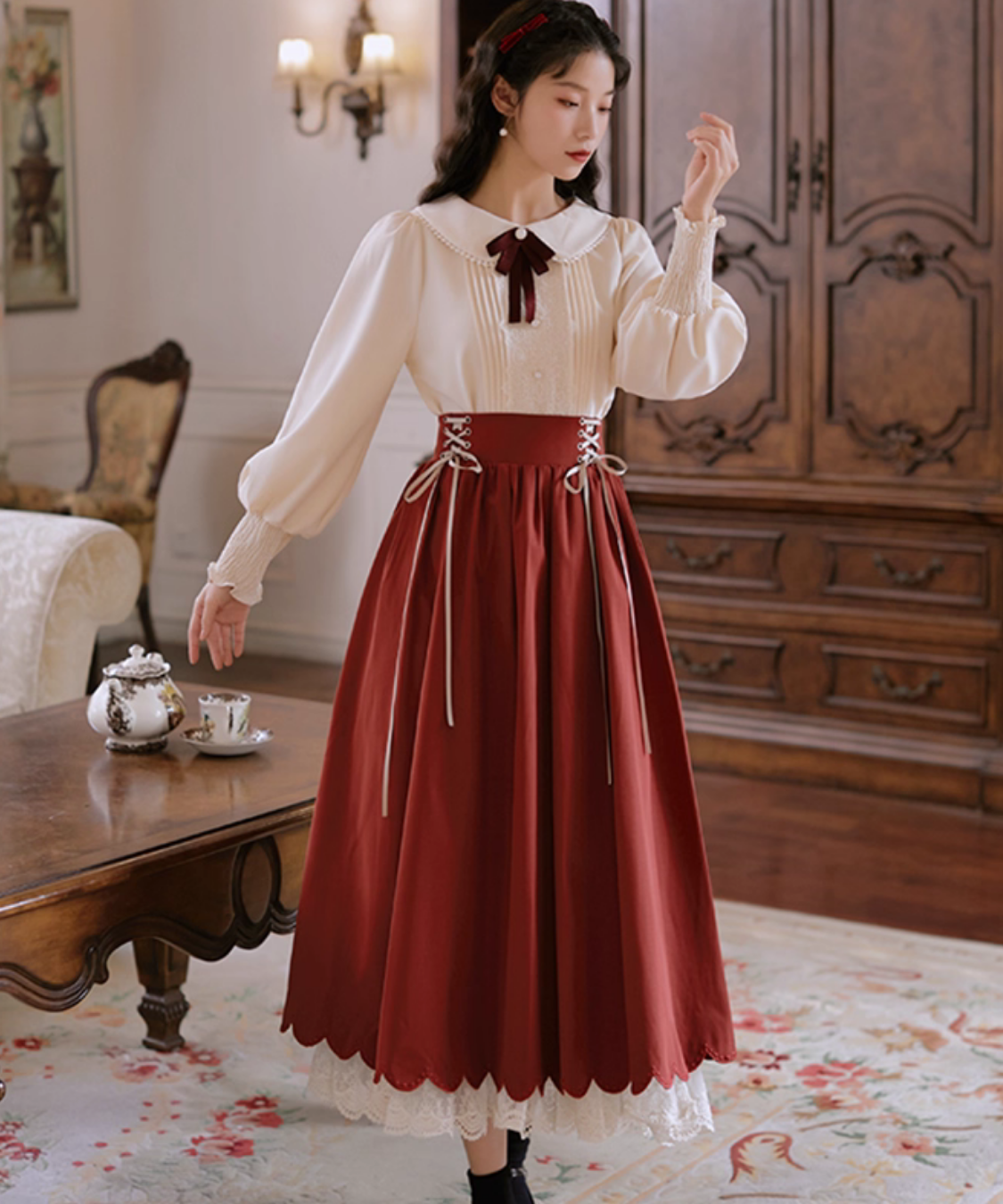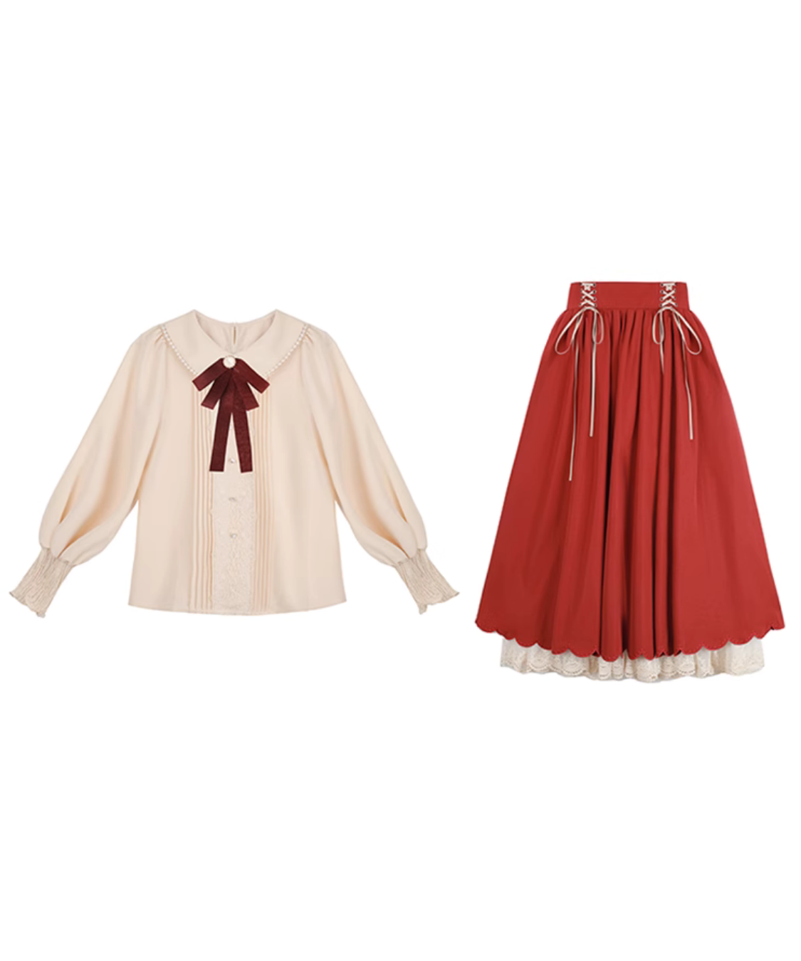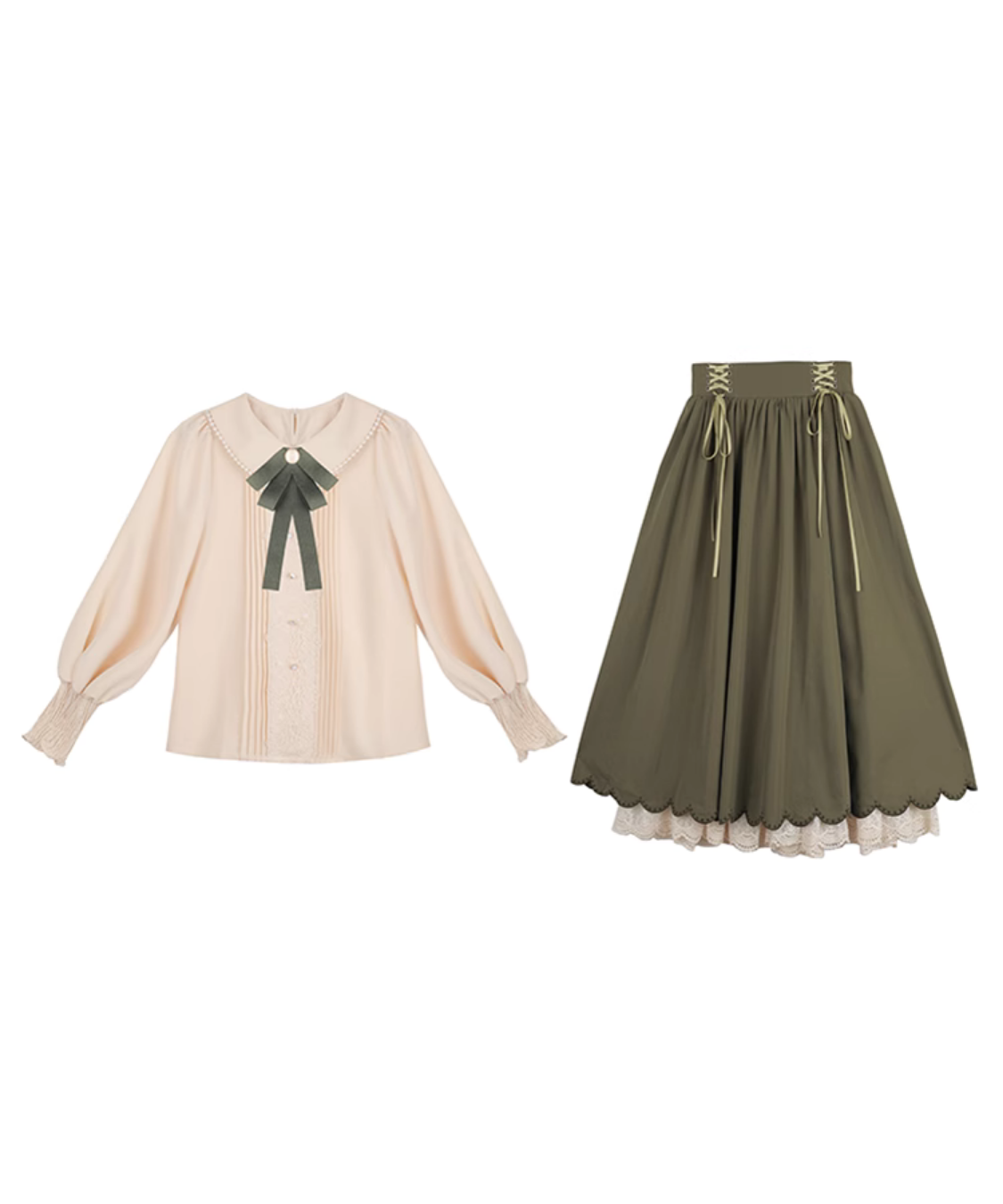 ピンタックレースブラウス+編み上げスカート 2点セット