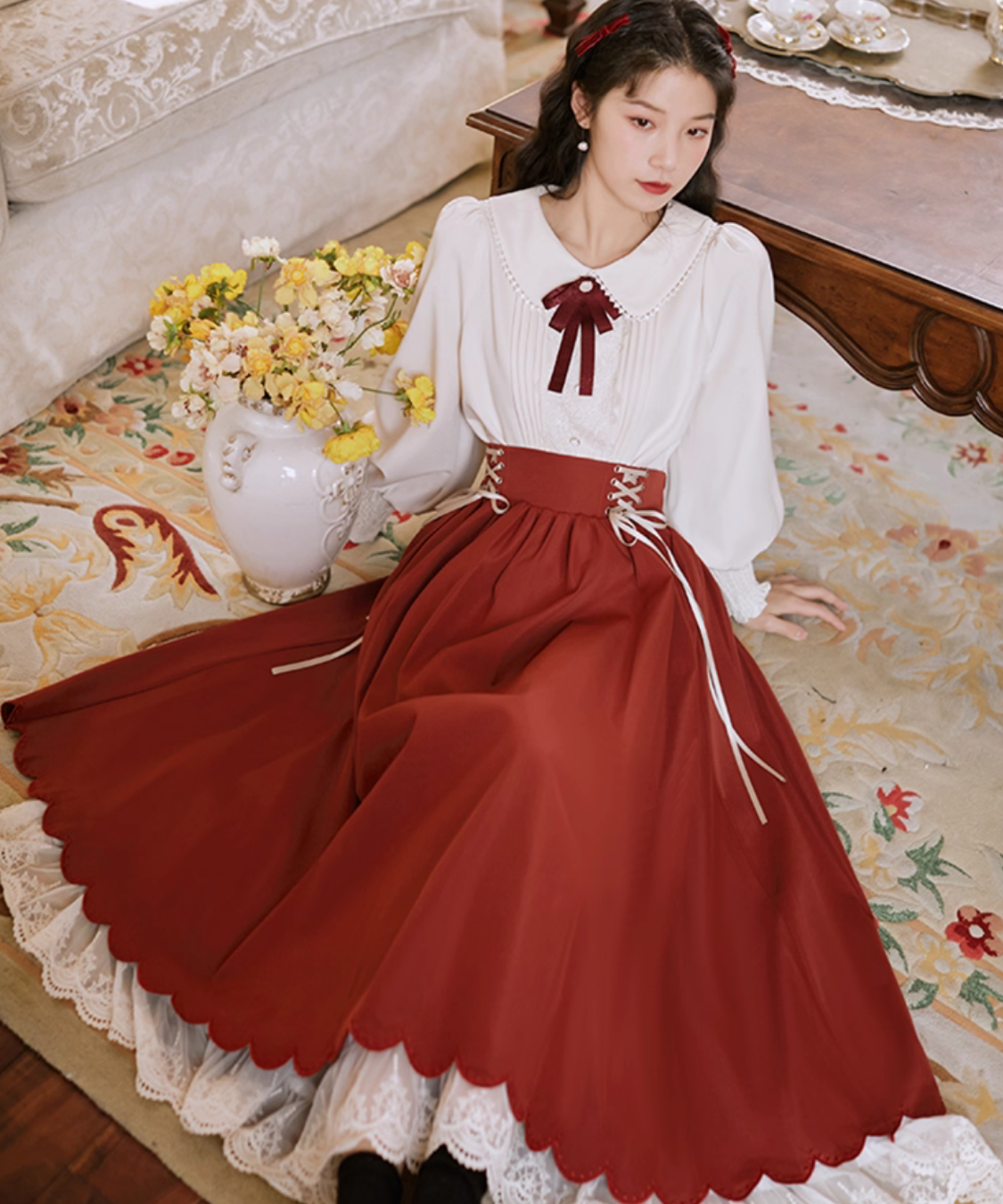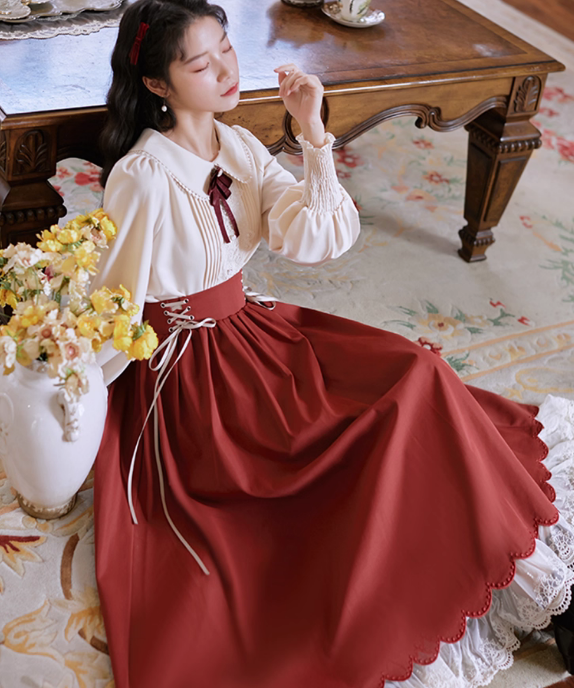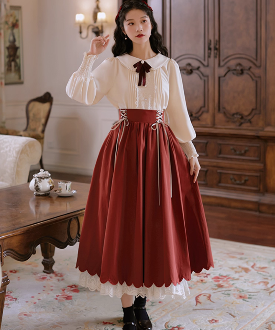 ピンタックレースブラウス+編み上げスカート 2点セット