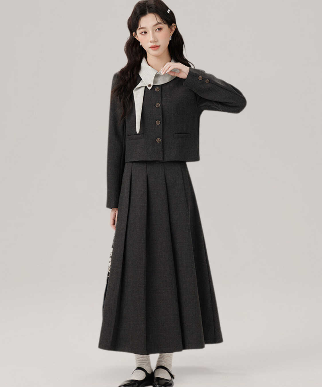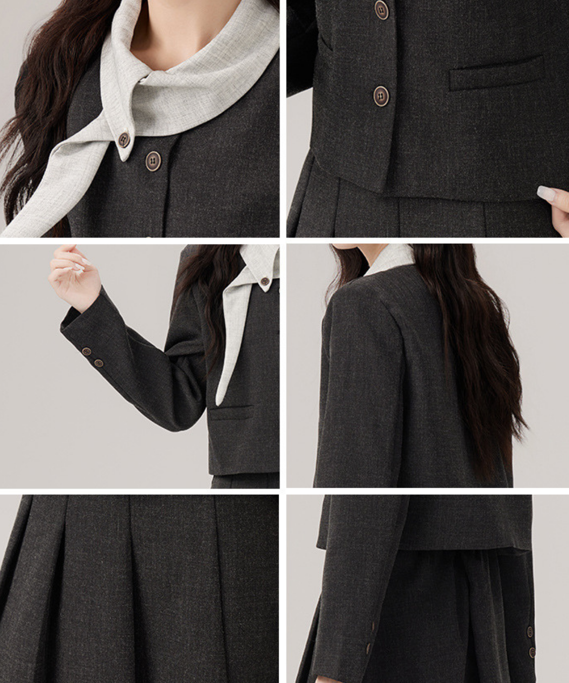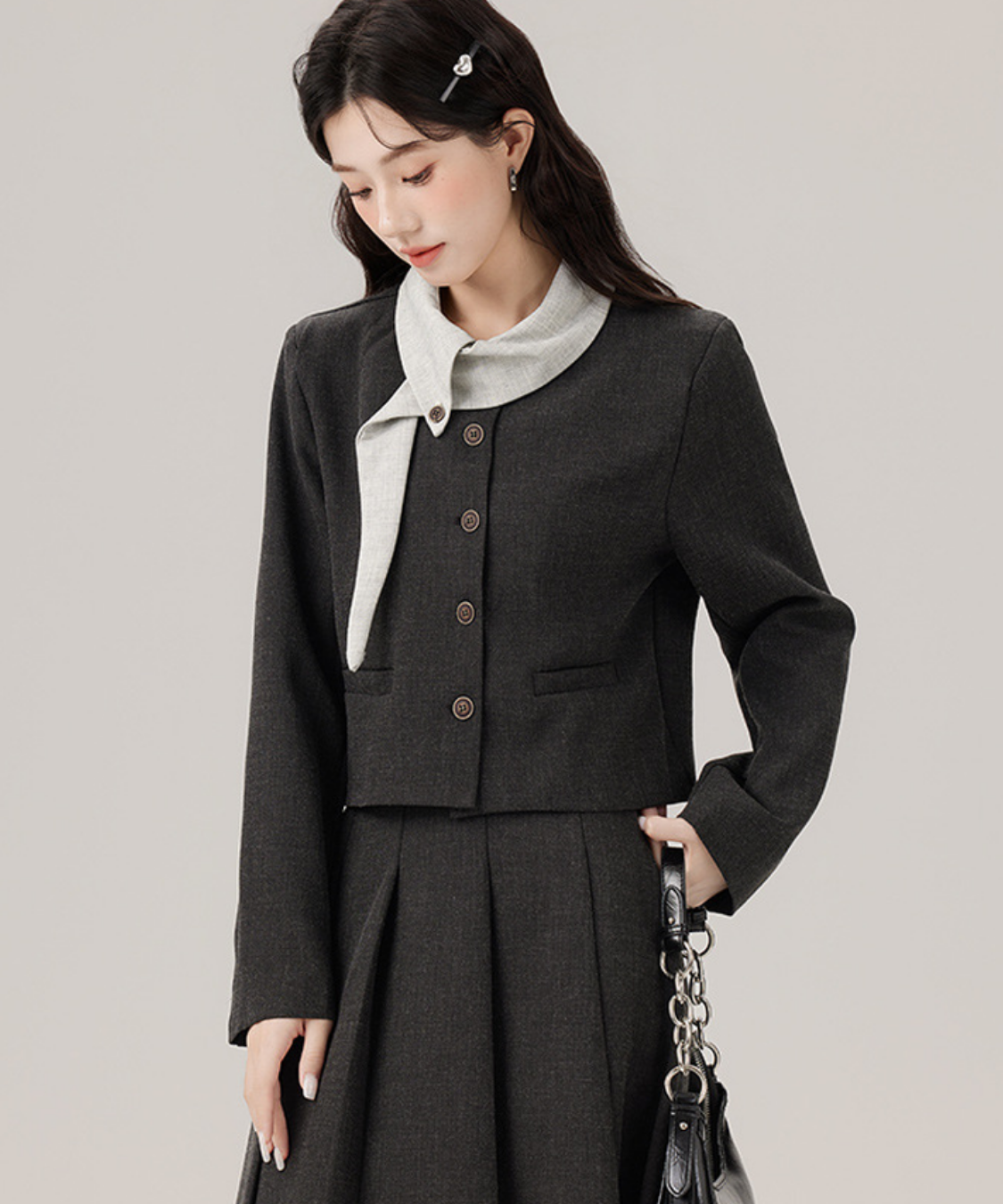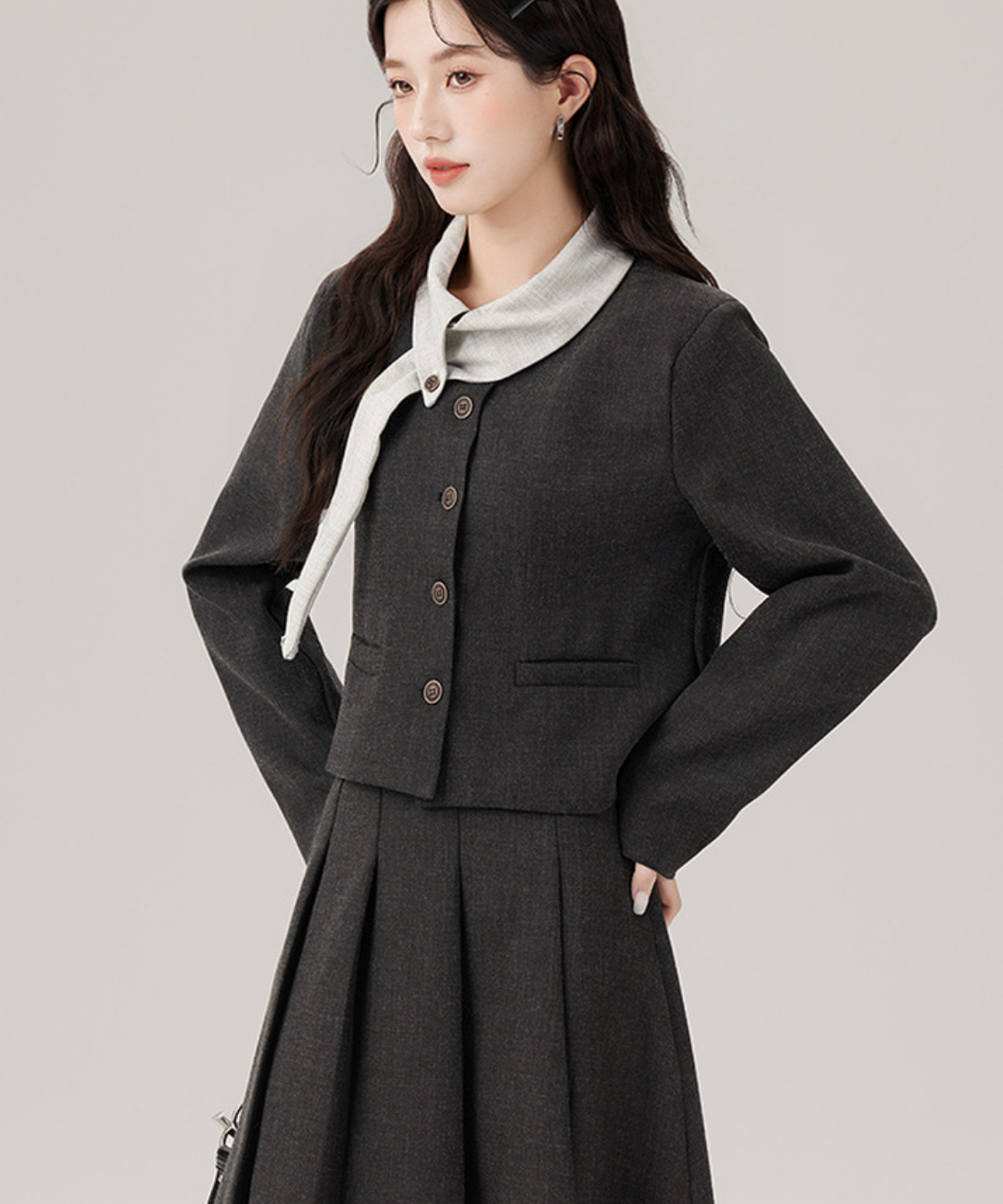 配色スカーフ風カラーショートジャケット+ボックスプリーツスカート 2点セット