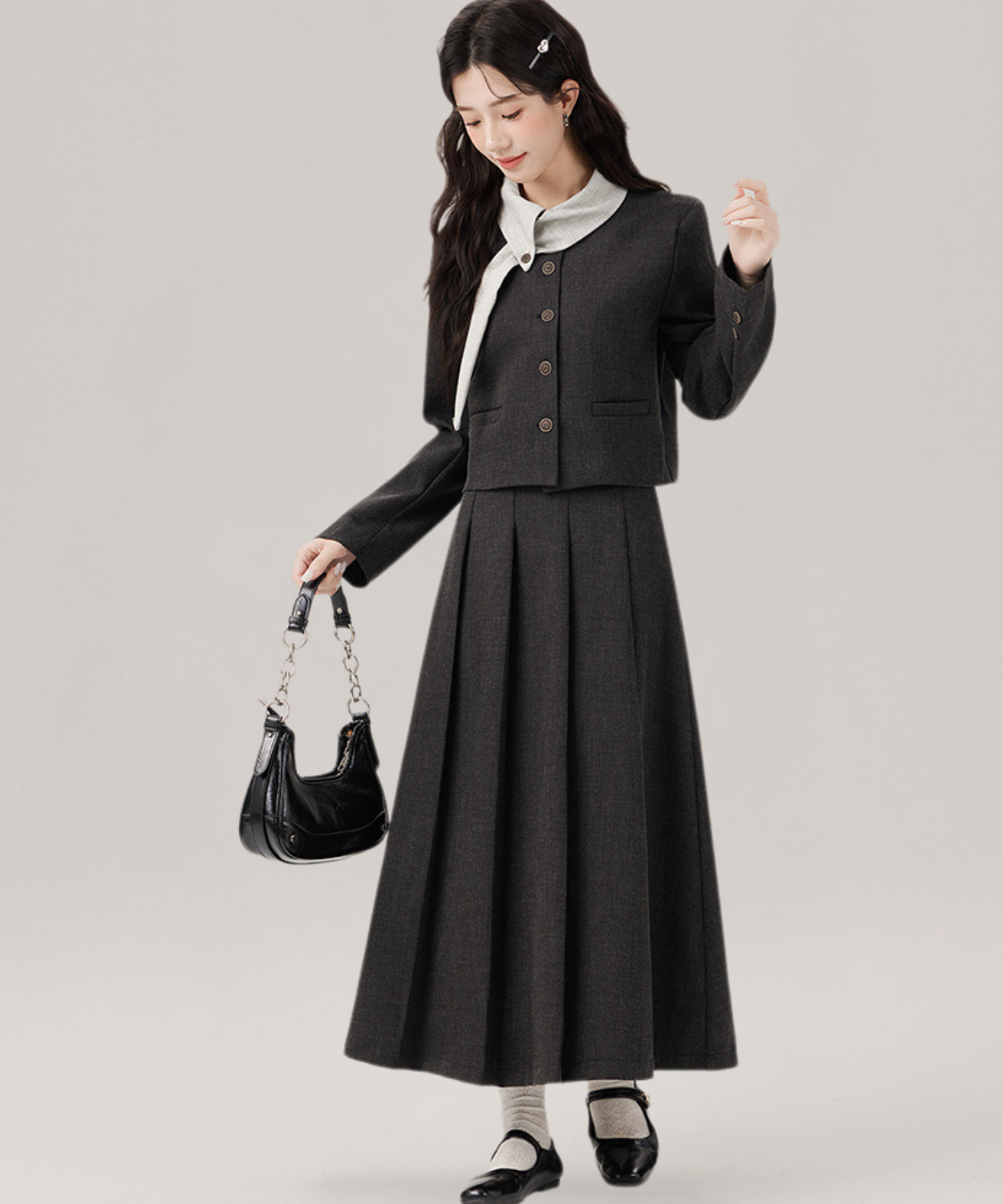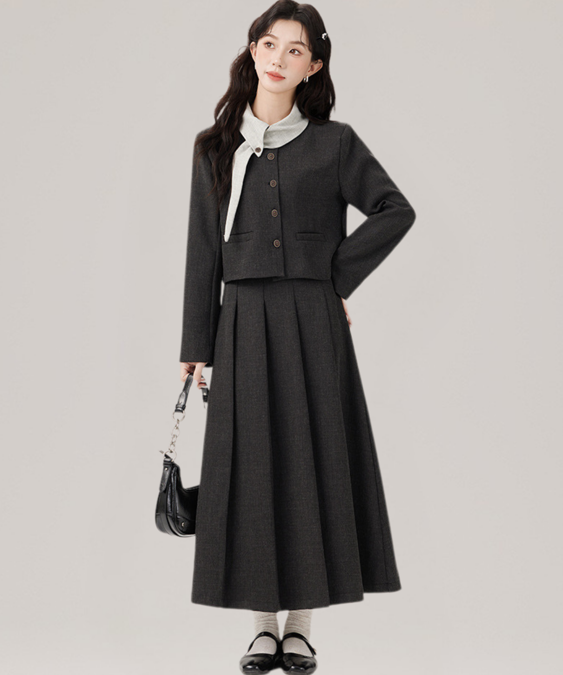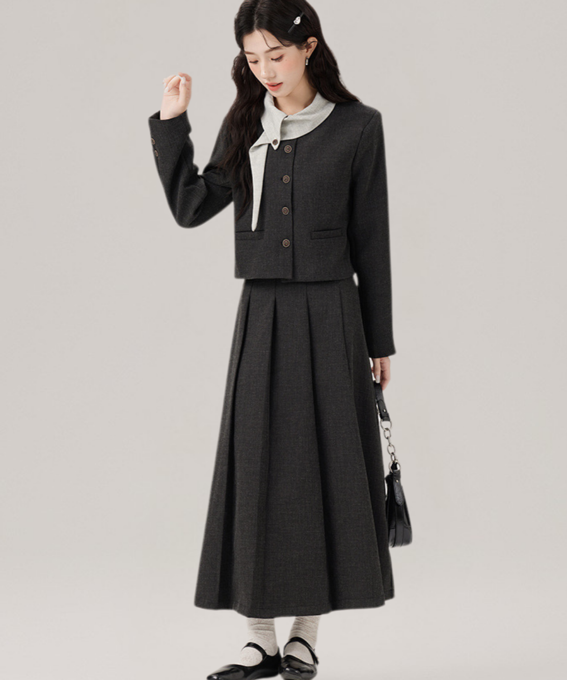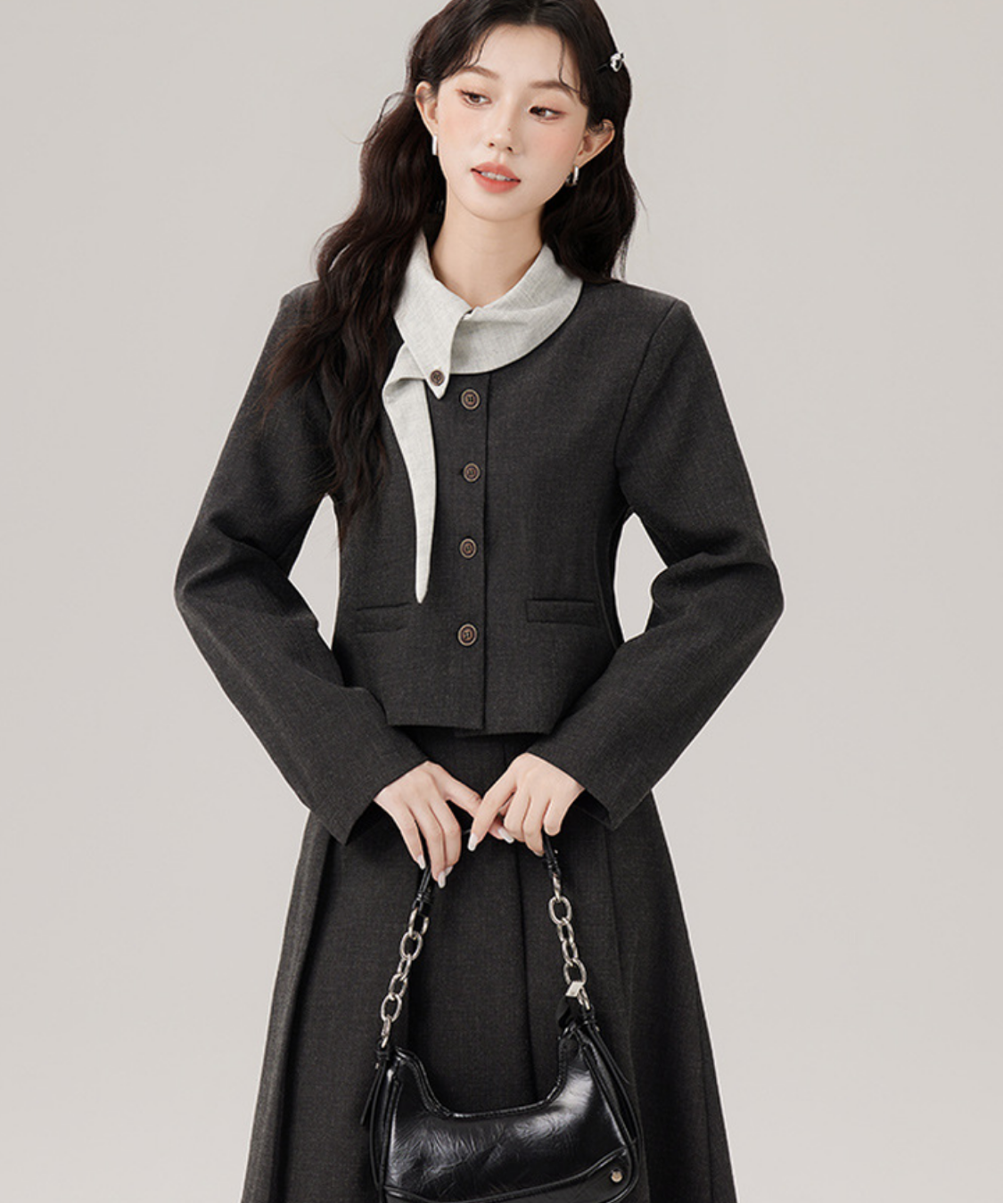 配色スカーフ風カラーショートジャケット+ボックスプリーツスカート 2点セット