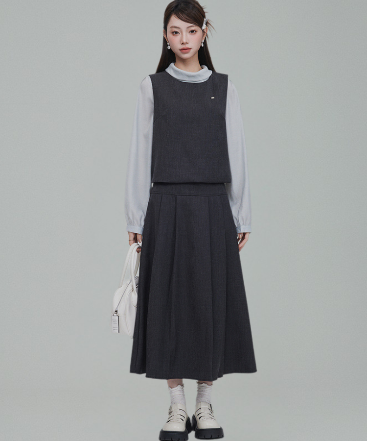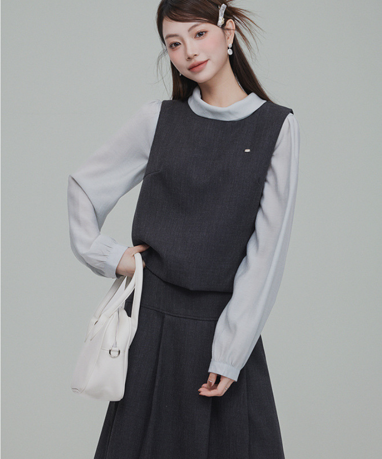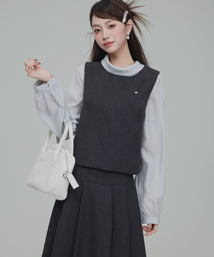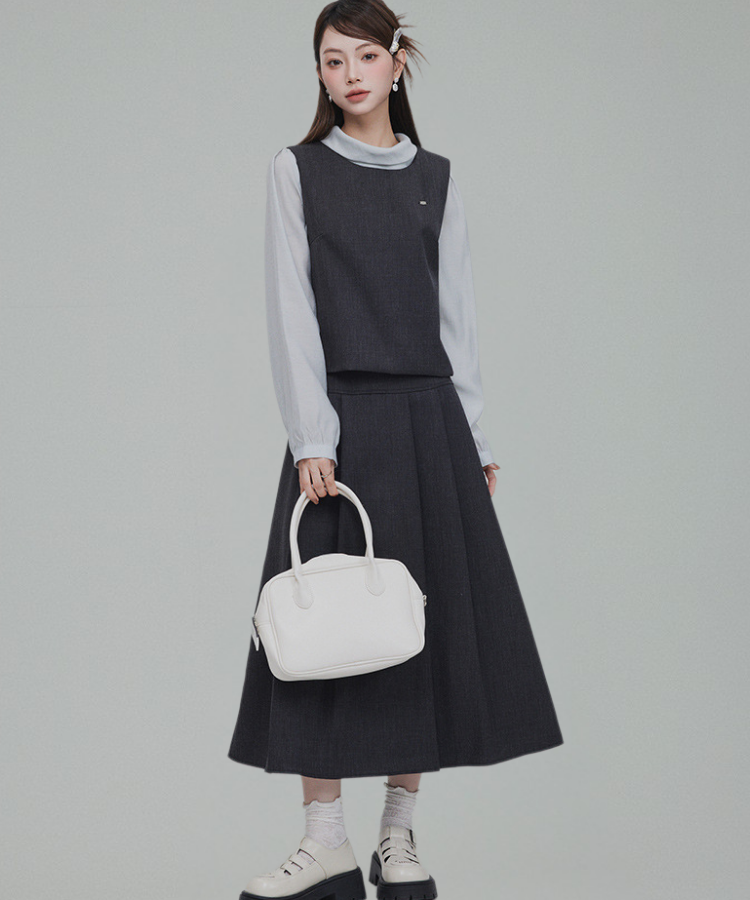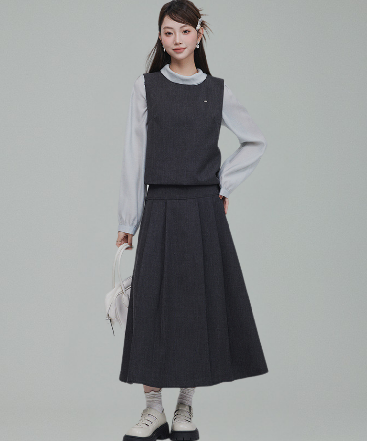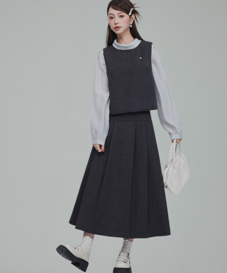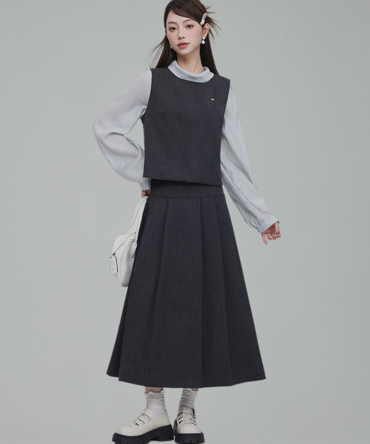 バックリボンブラウス+無地ノースリーブベスト+フレアタックスカート 3点セット