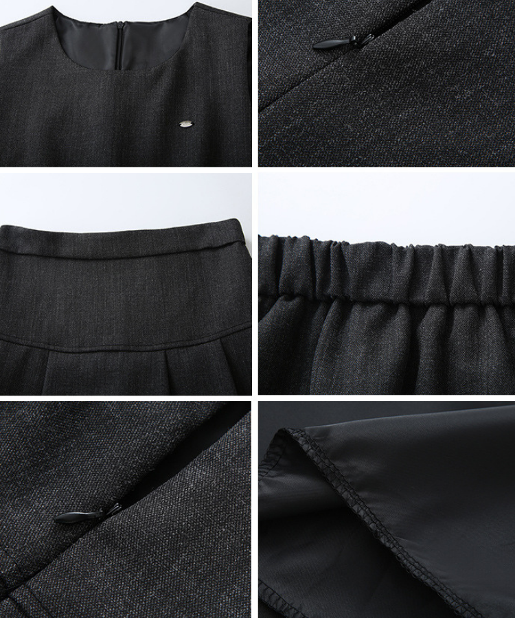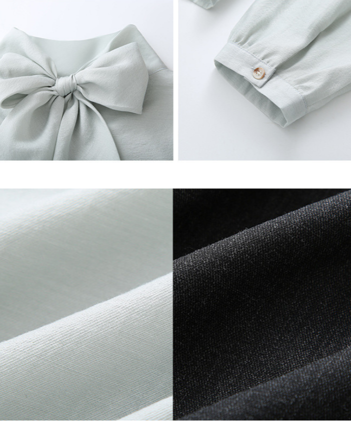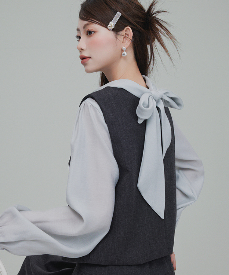上品なバックリボンが映えるブラウスと、ベスト・スカートのセットアイテムです。