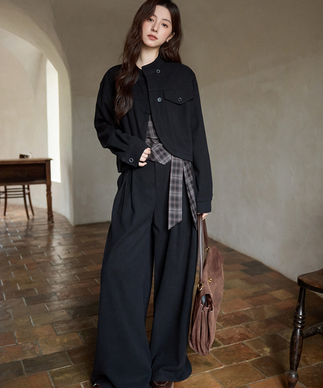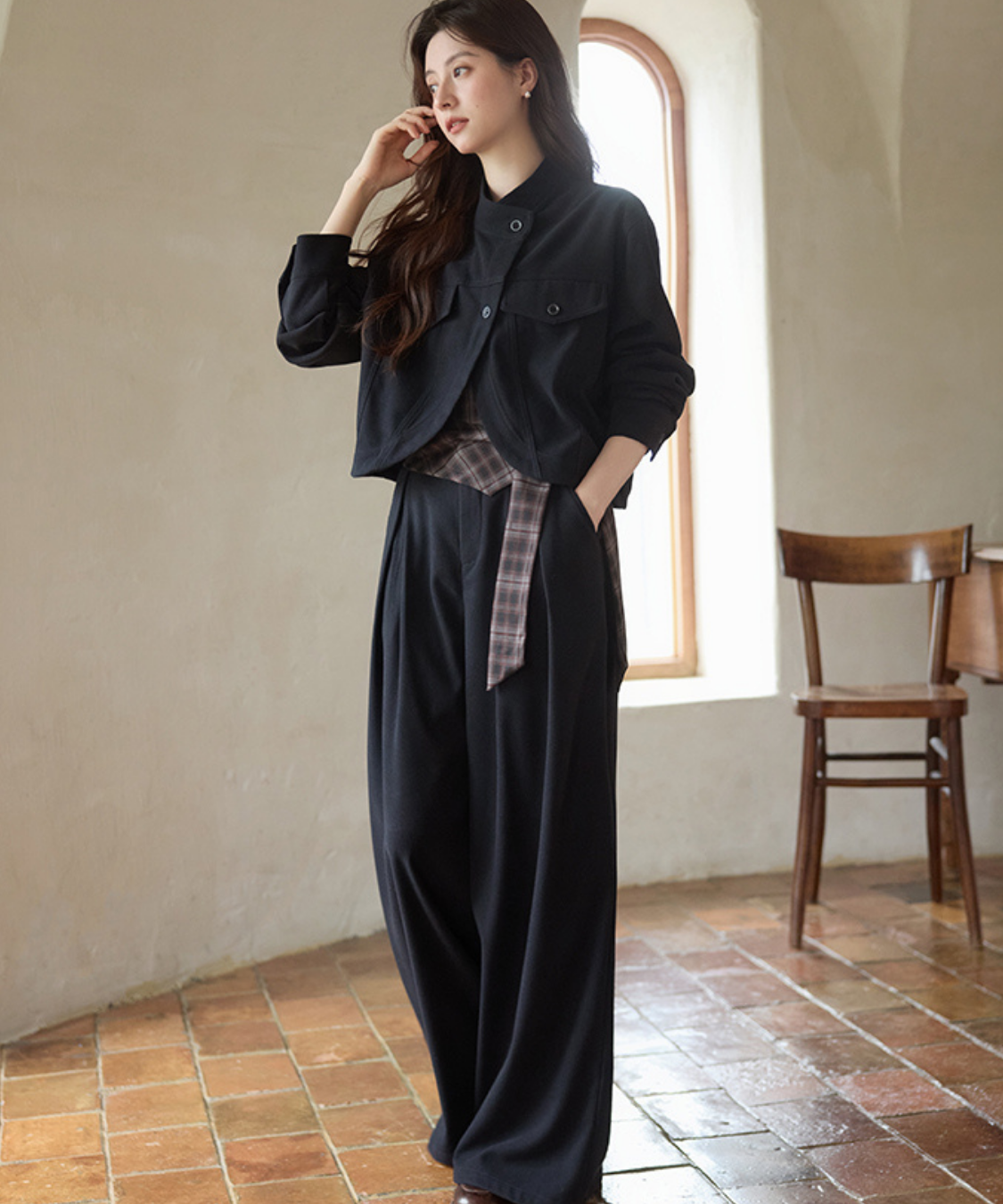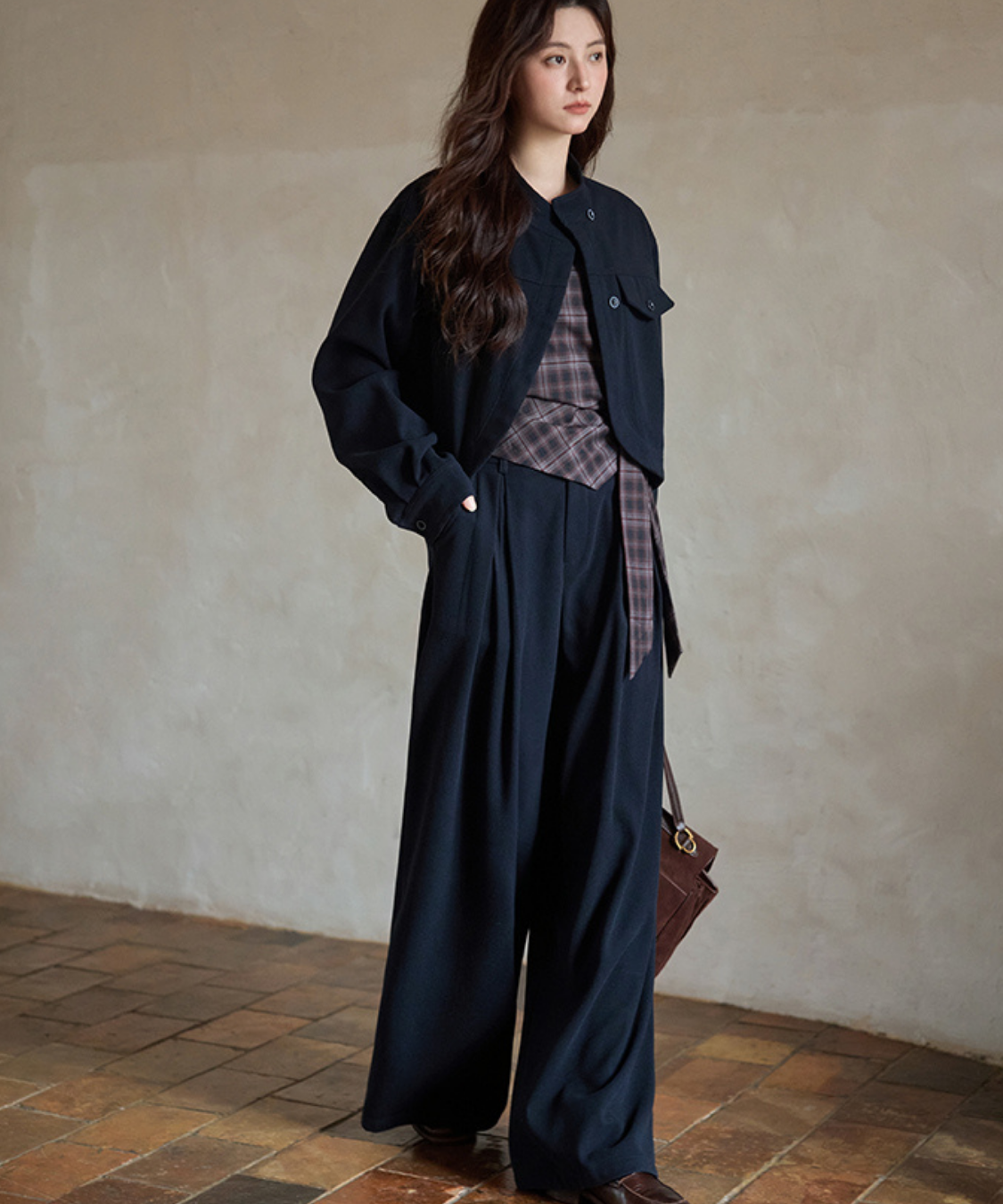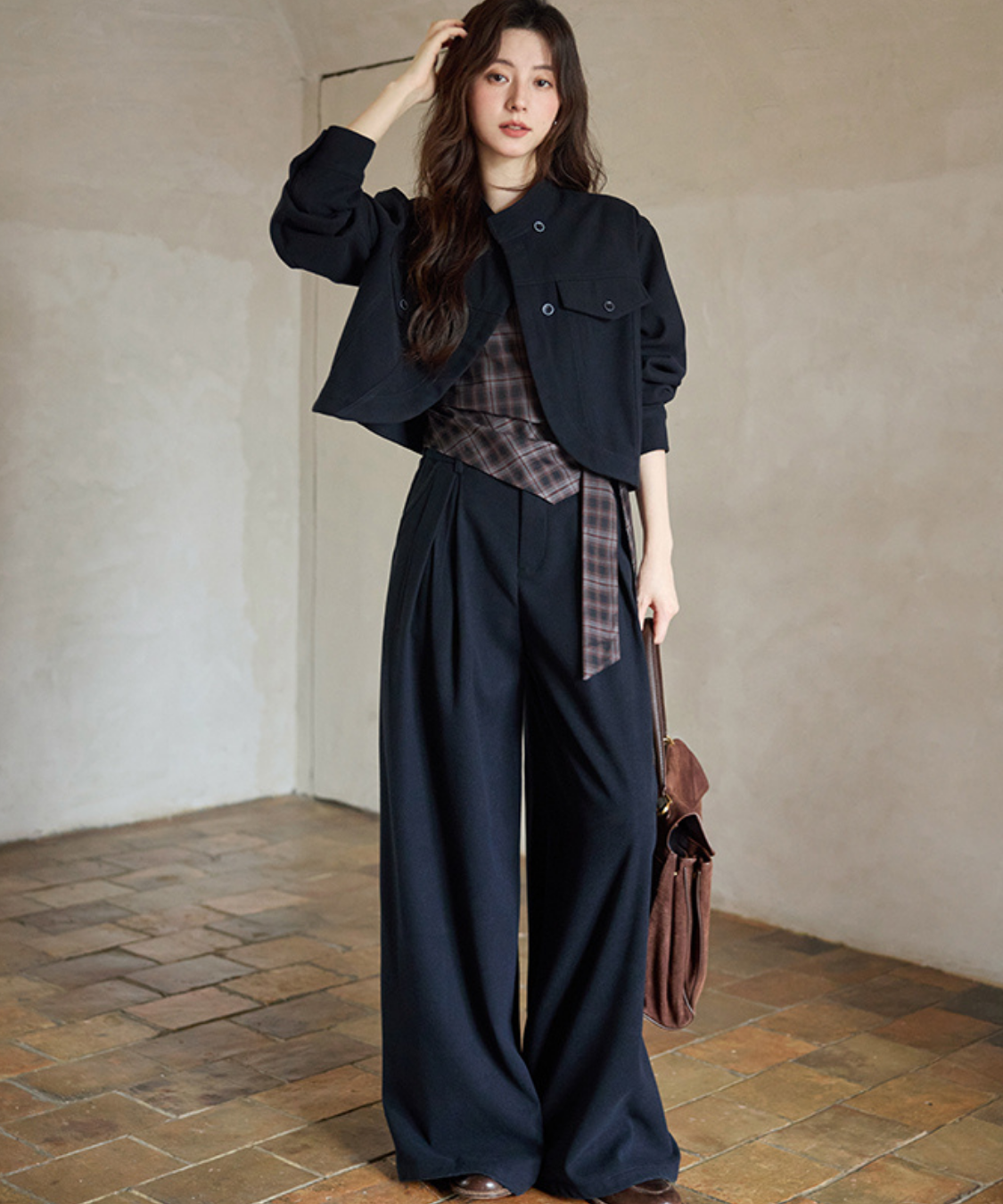 チェック柄キャミとワイドパンツを、ショート丈のジャケットで引き締めたバランス上手な3点セットです。
