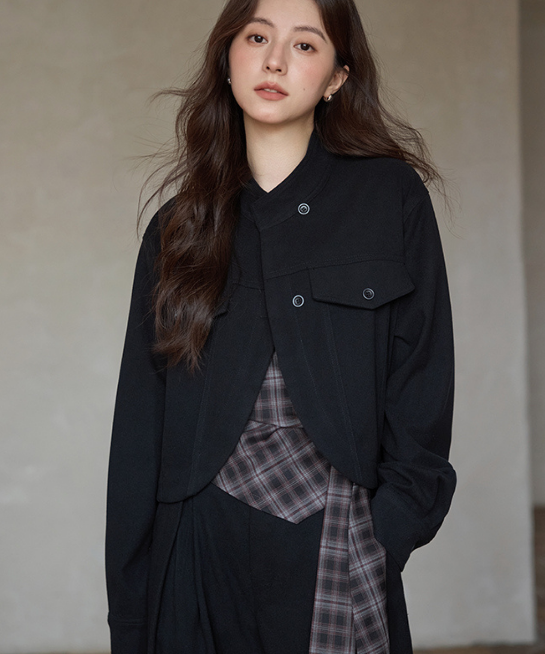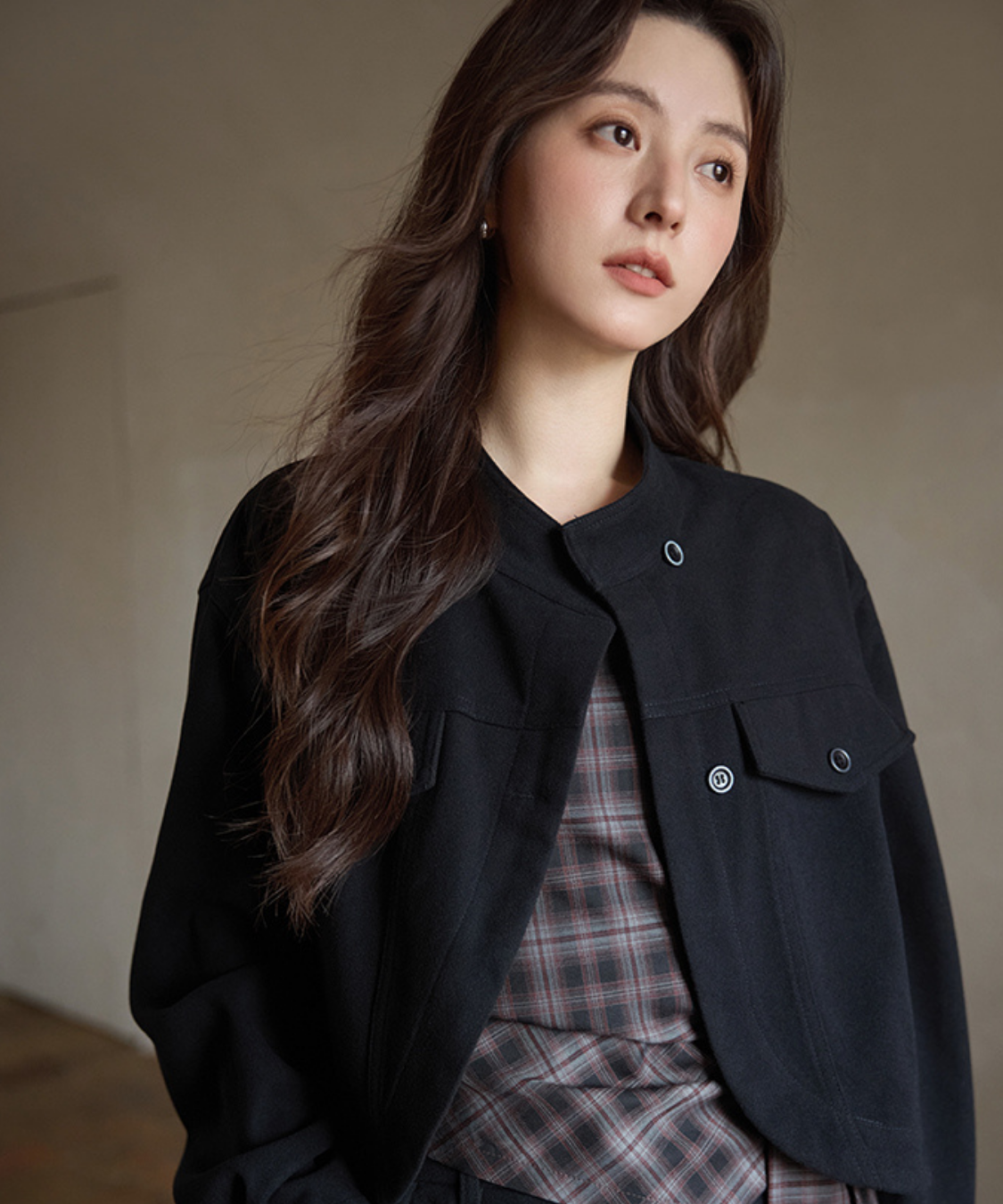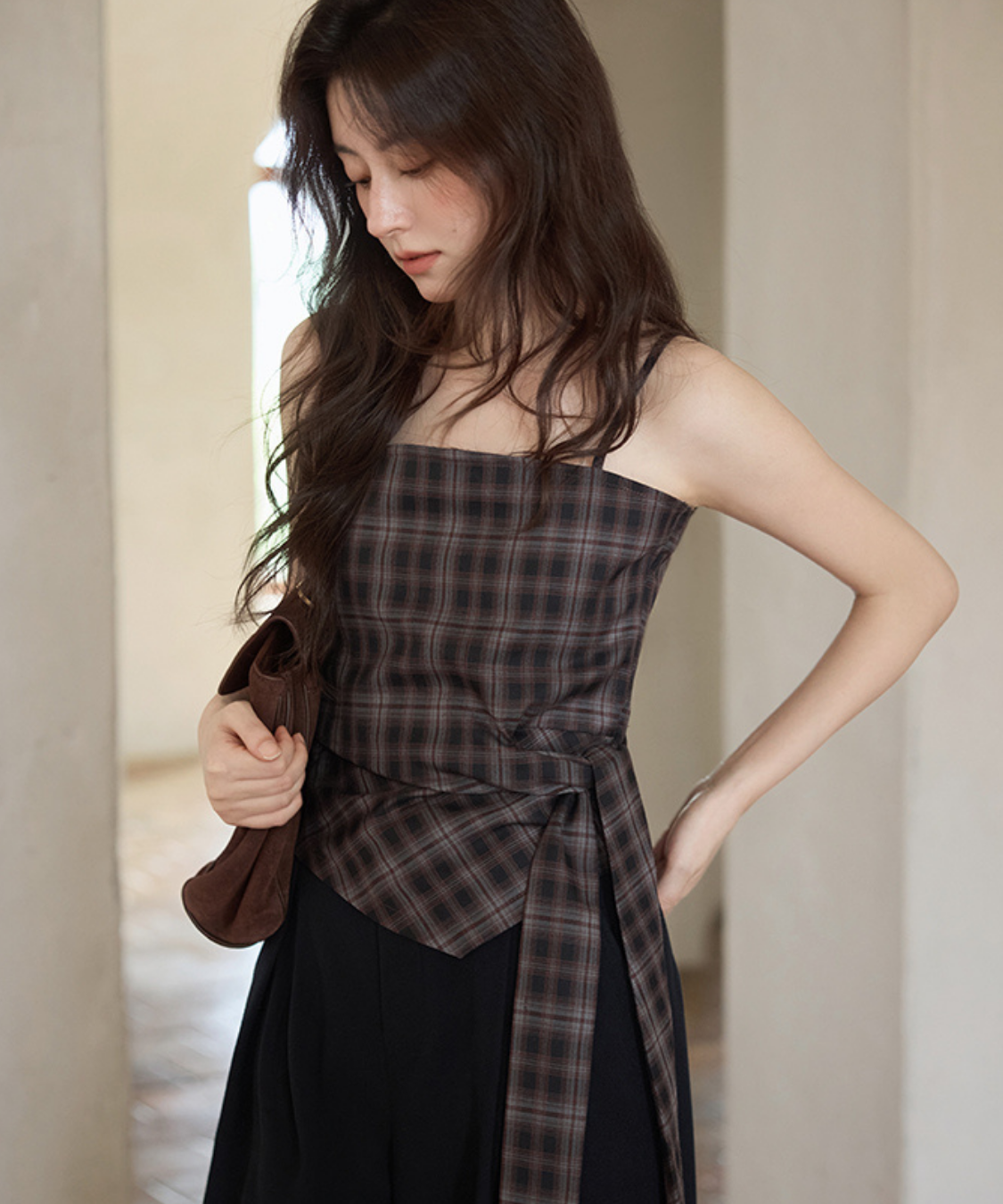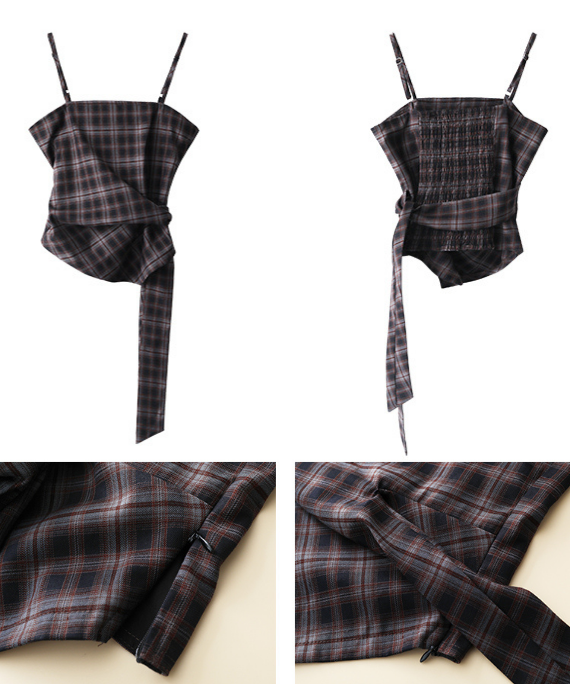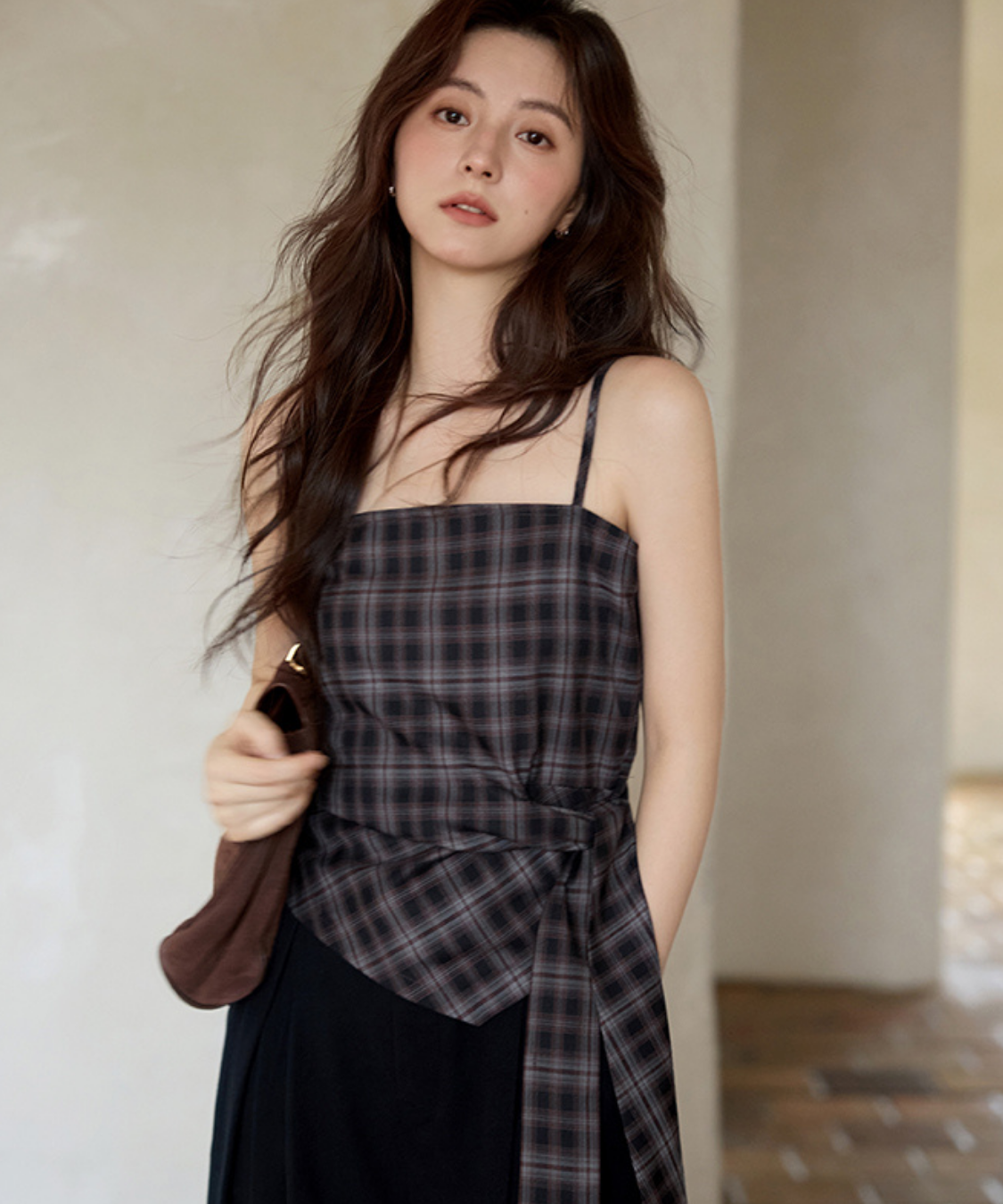 チェック柄キャミとワイドパンツを、ショート丈のジャケットで引き締めたバランス上手な3点セットです。