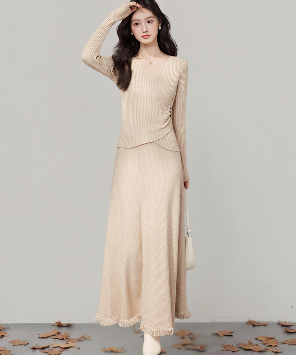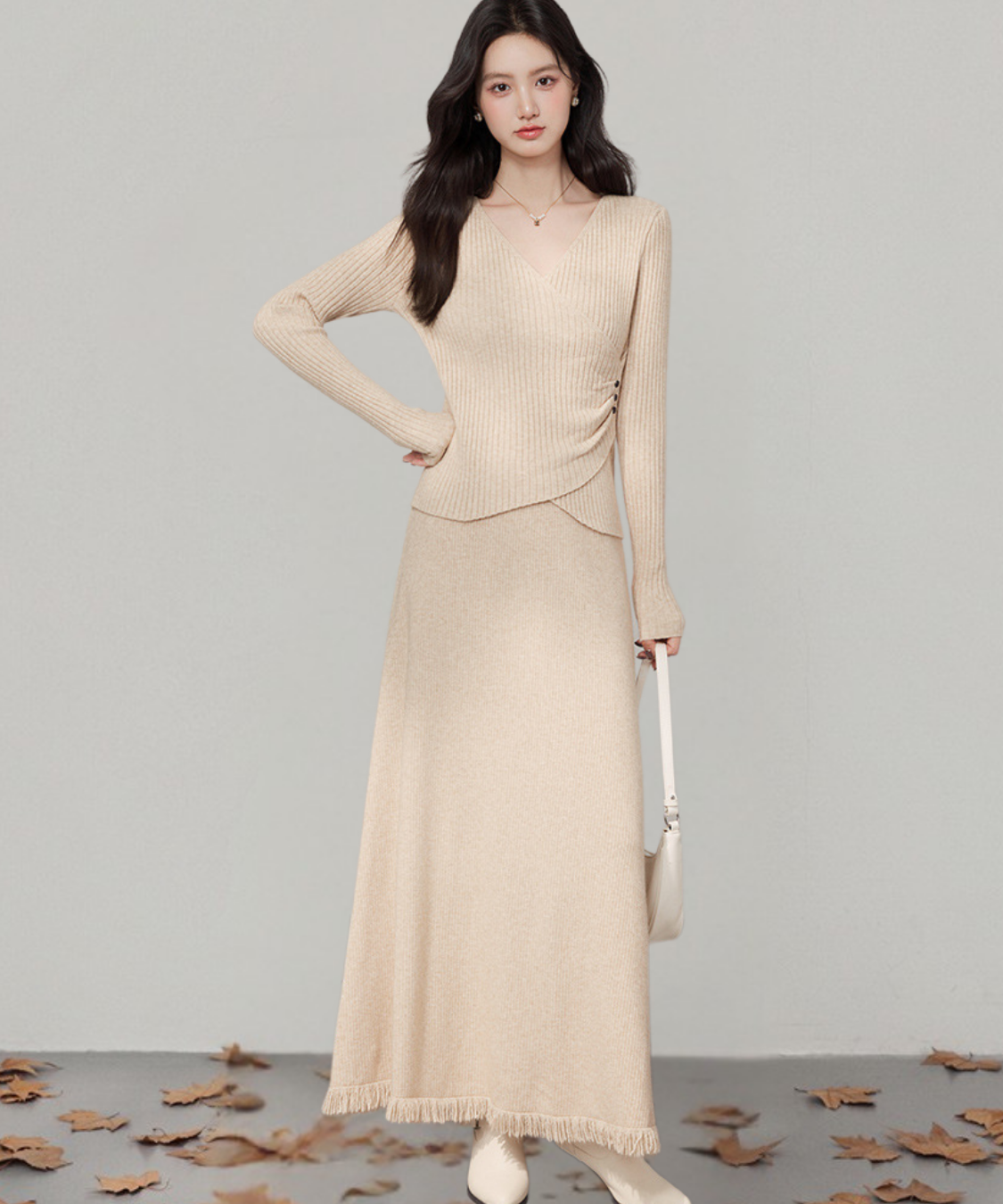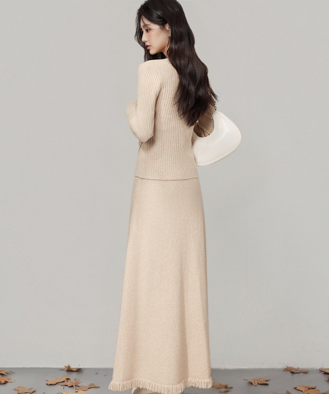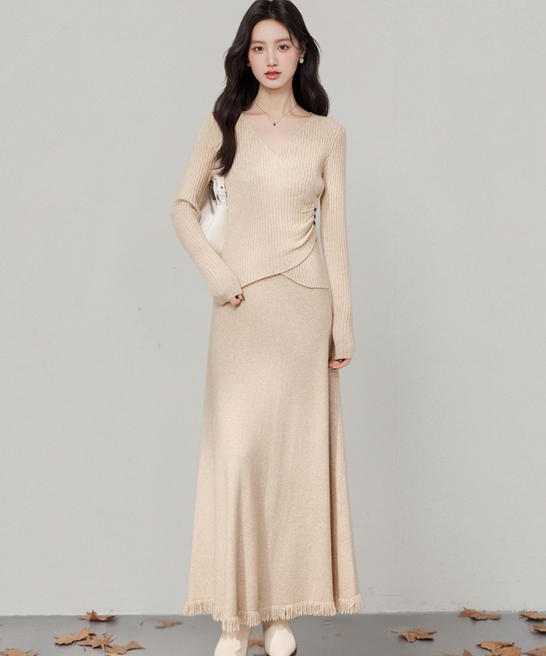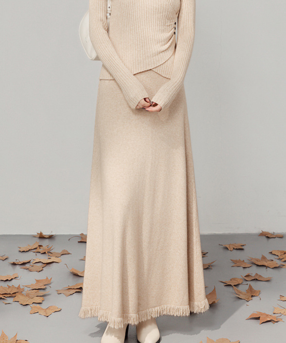 カシュクール風リブニットトップス+フリンジロングスカート 2点セット