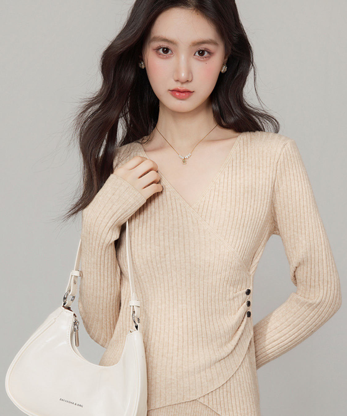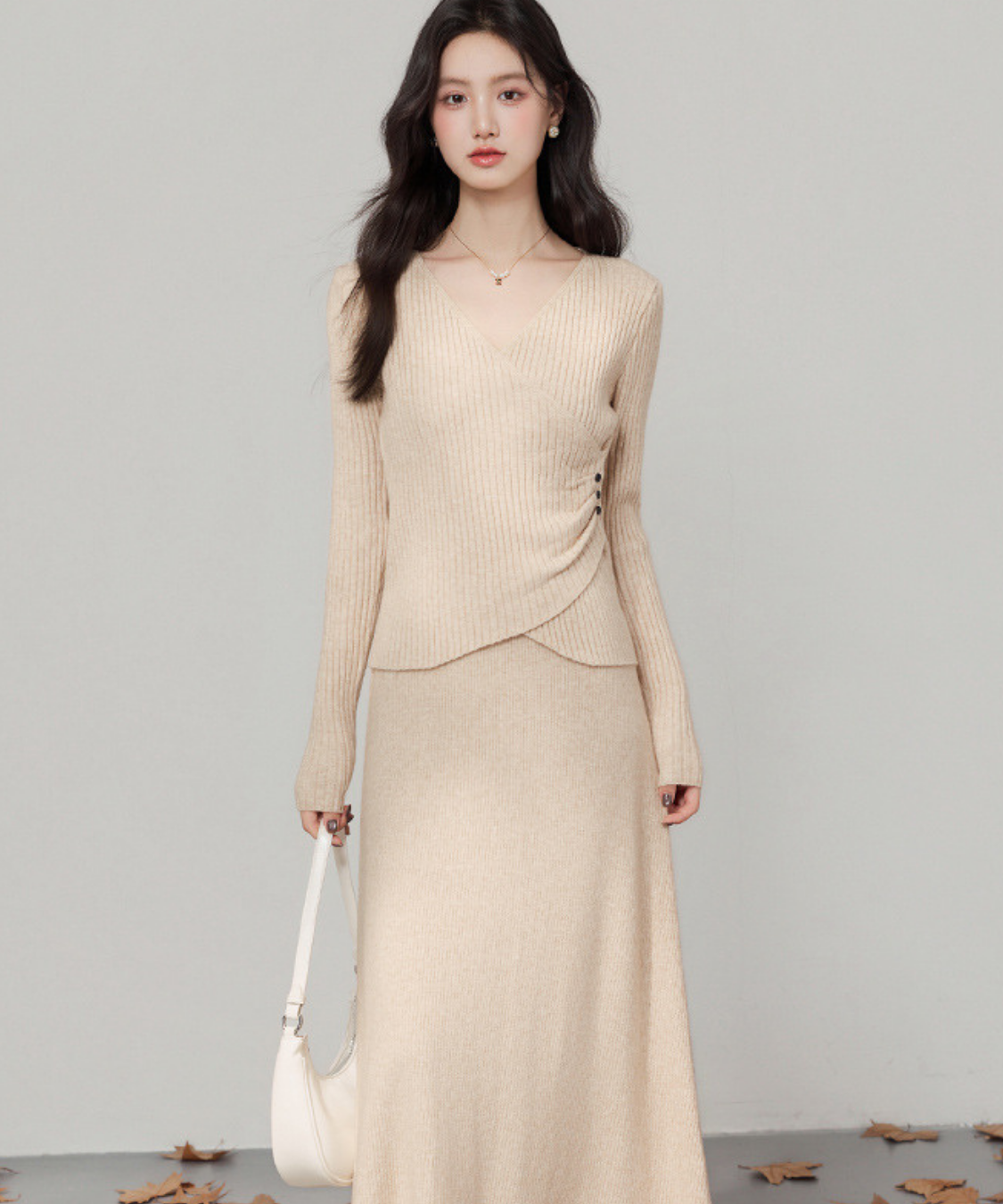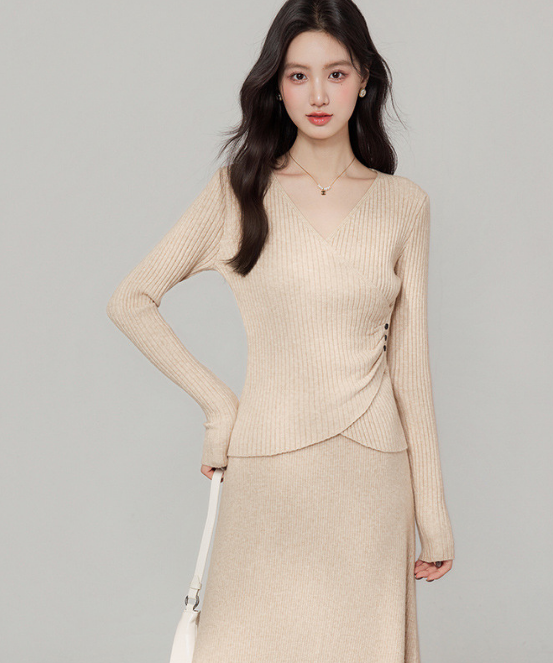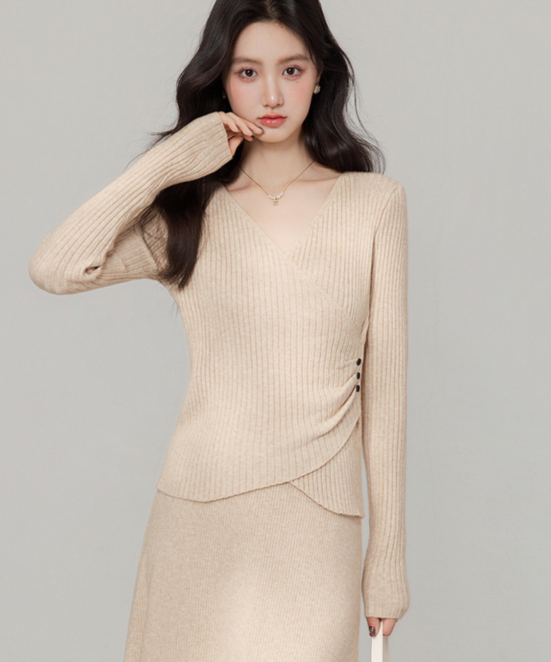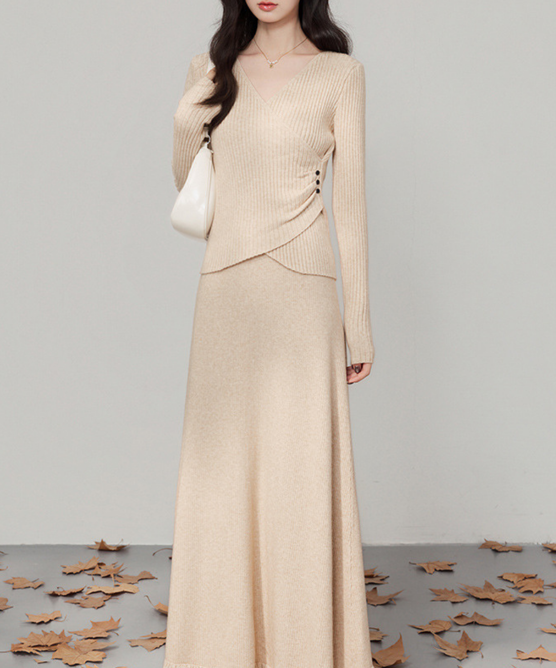 カシュクール風デザインが女性らしさを引き立ててくれるニットセットです。