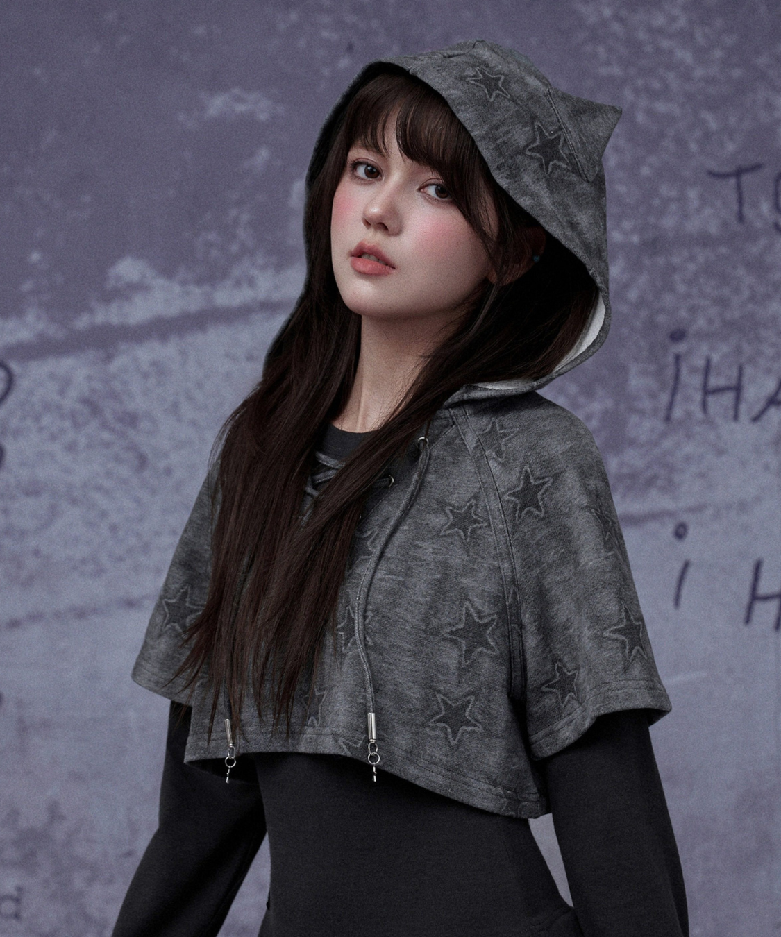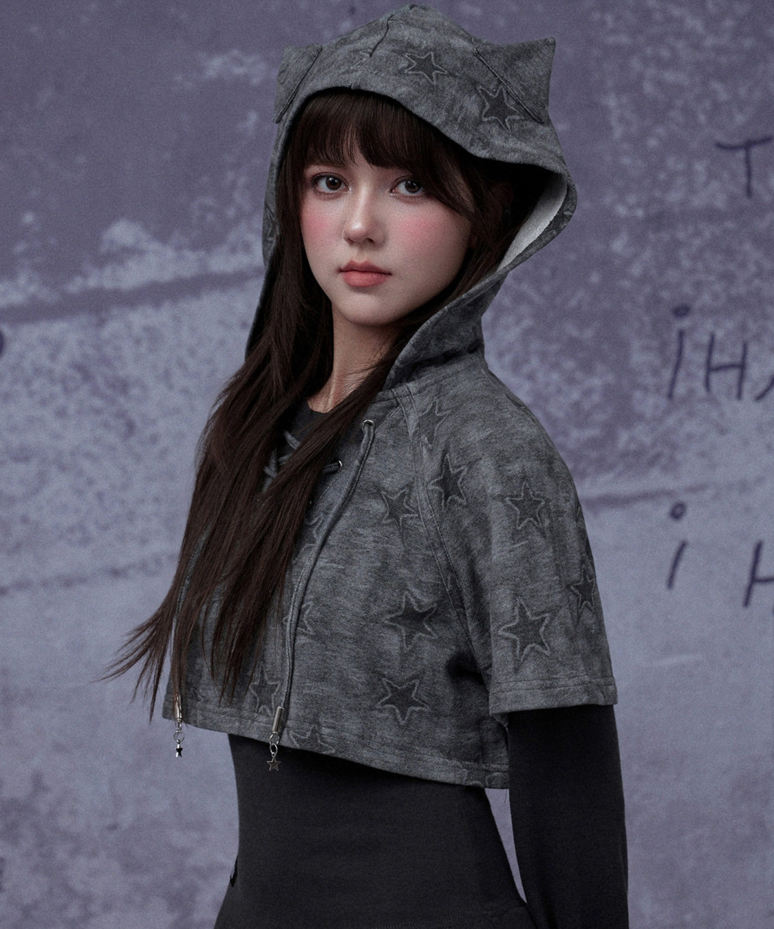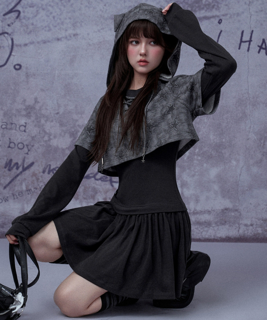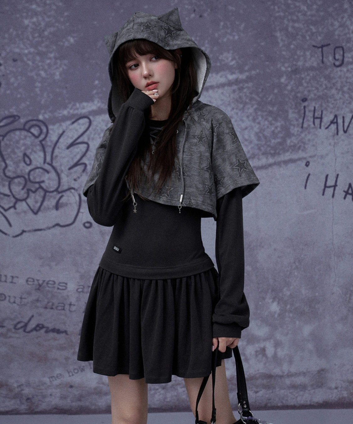 猫耳フーディとフィット&フレアワンピの組み合わせが、小悪魔感たっぷりのセットアイテムです。