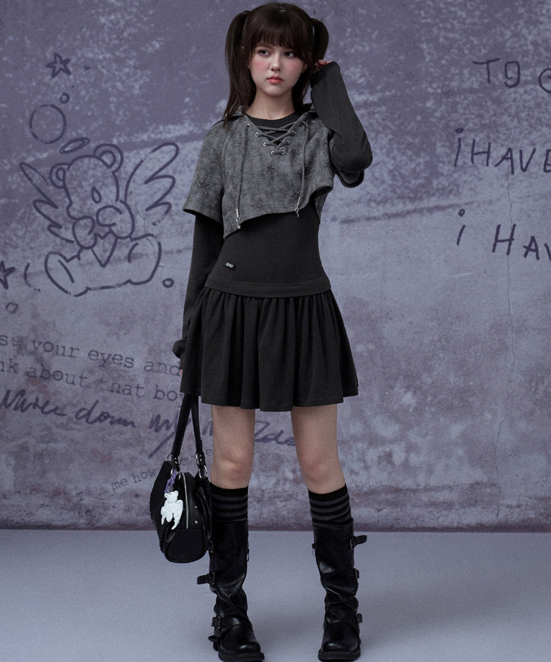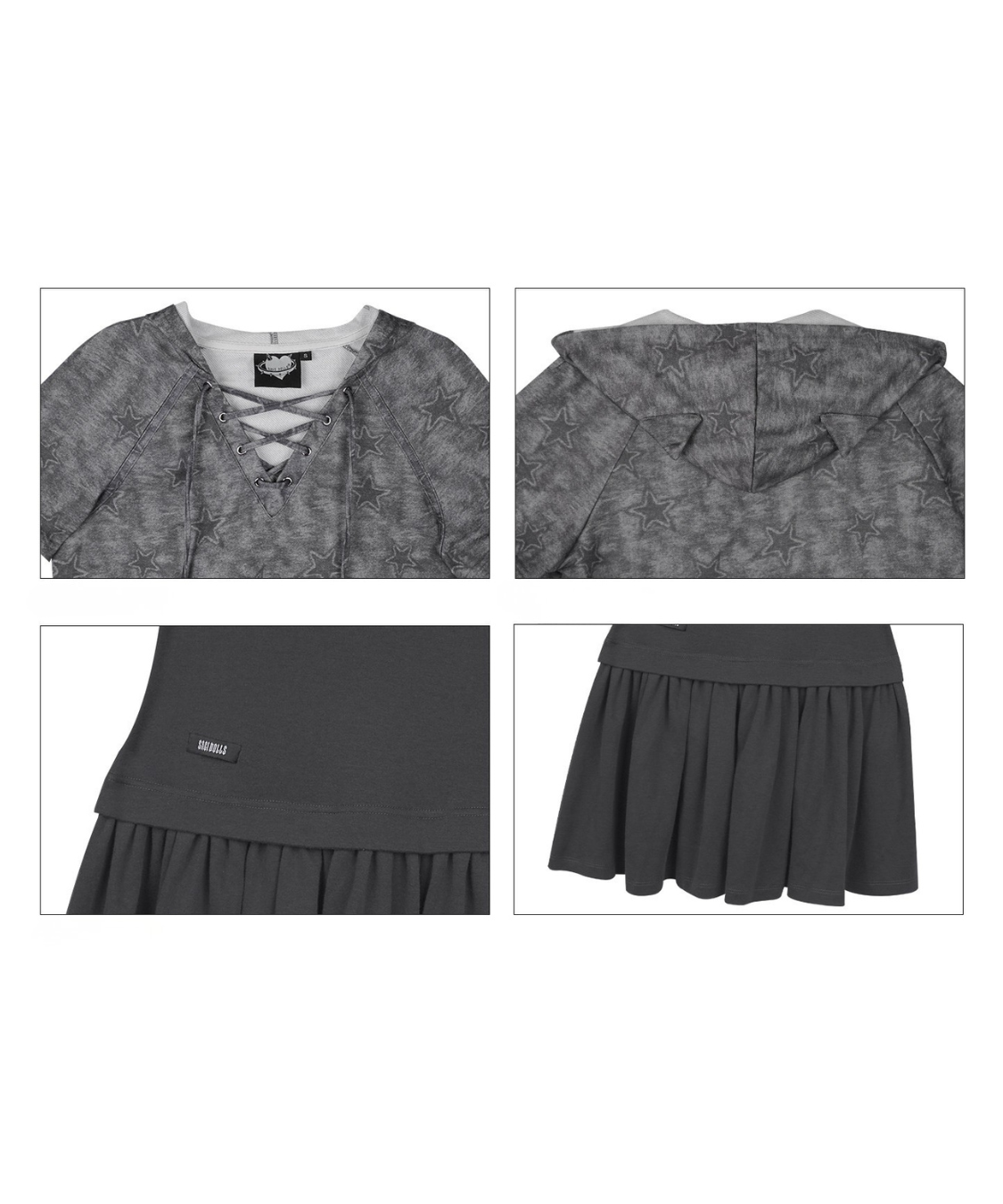 レースアップ猫耳フーディ+ウエスト切り替えワンピース 2点セット
