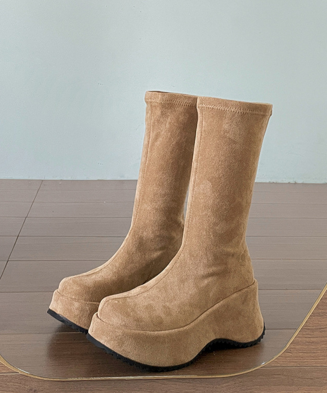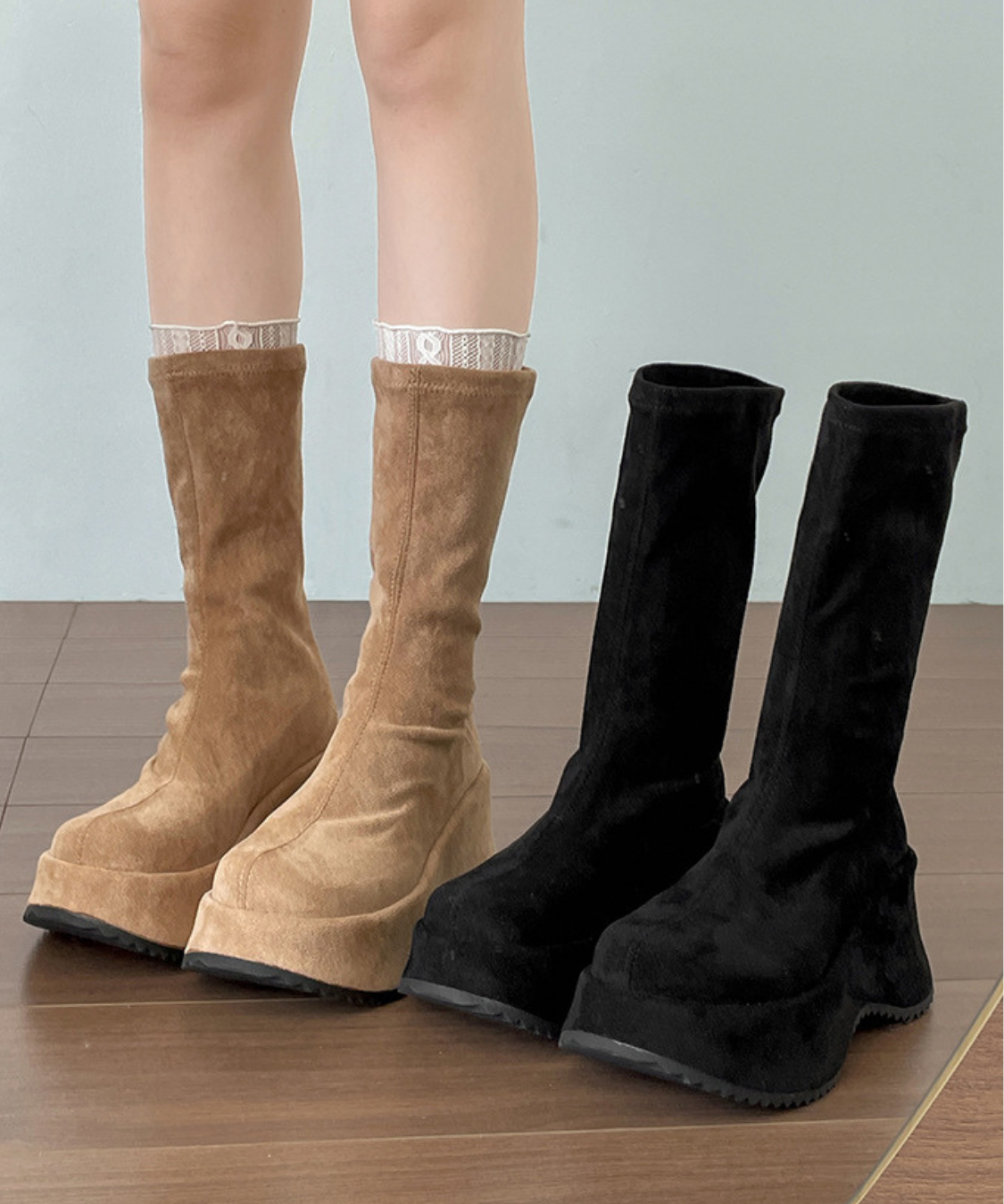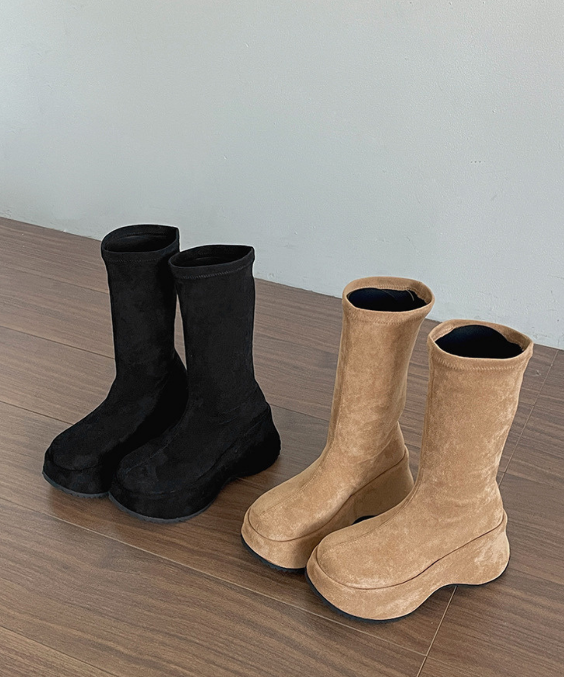 脚にぴたっとフィットするストレッチ素材が魅力の、スエード調厚底ブーツです。