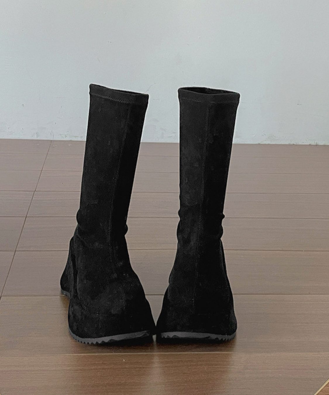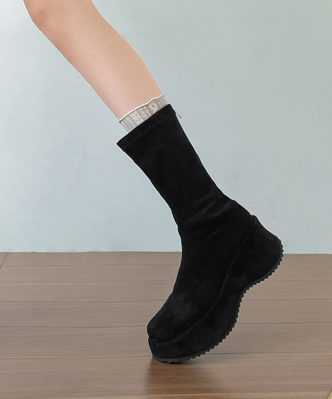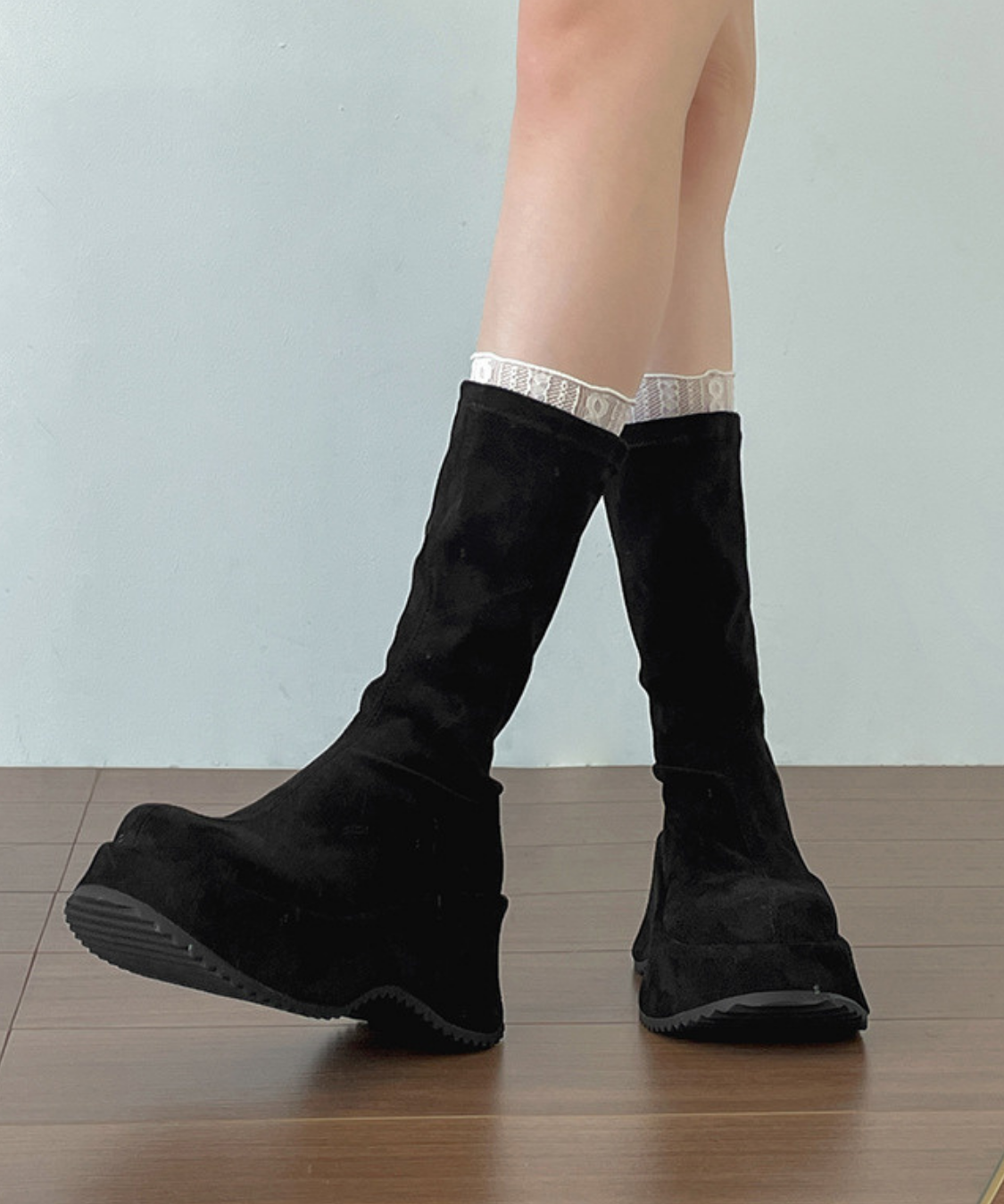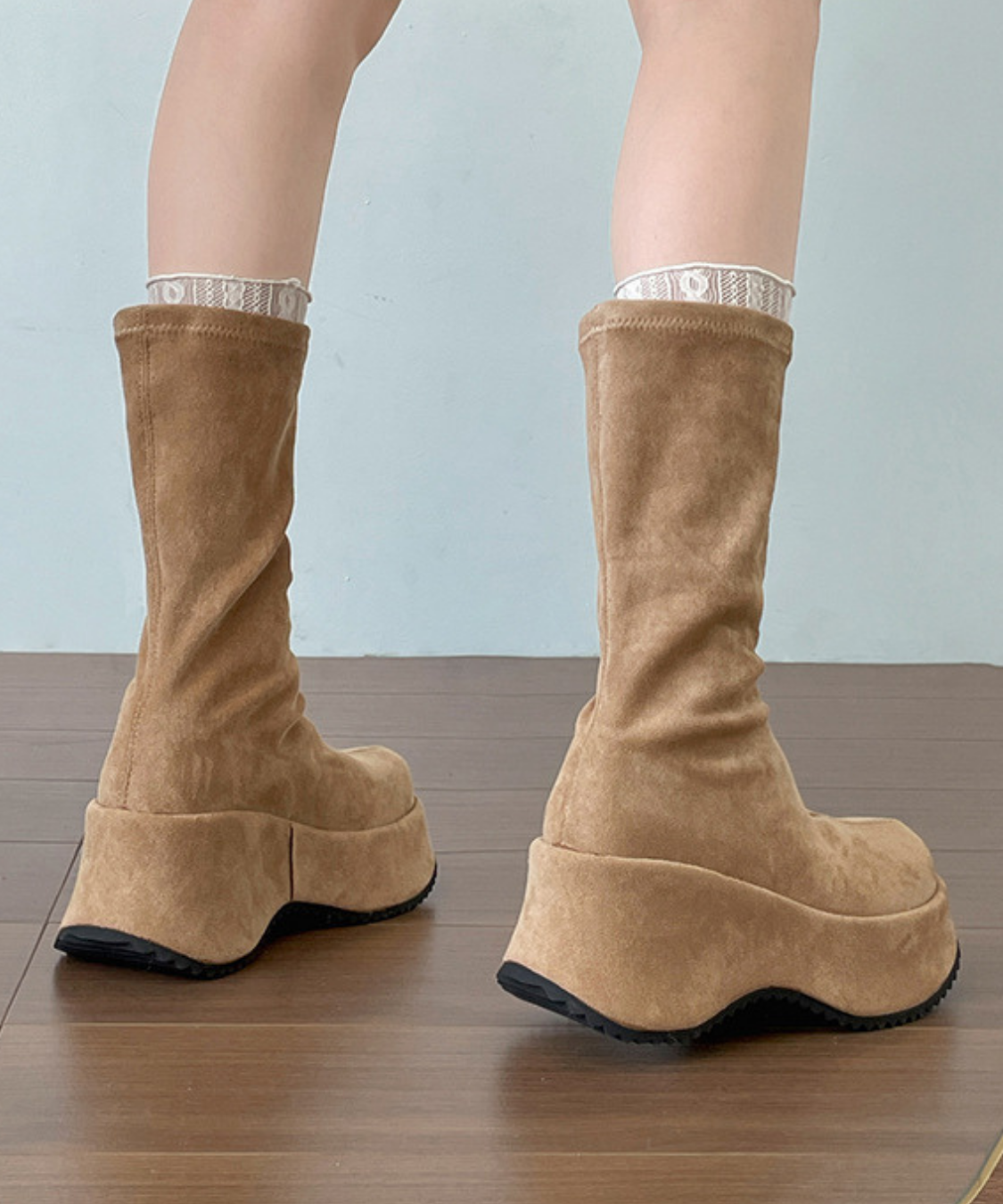 脚にぴたっとフィットするストレッチ素材が魅力の、スエード調厚底ブーツです。