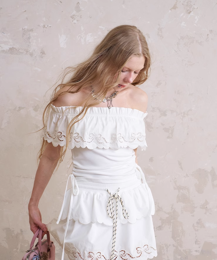繊細なカットワーク刺繍が目を惹く、華やかなオフショルトップスです。