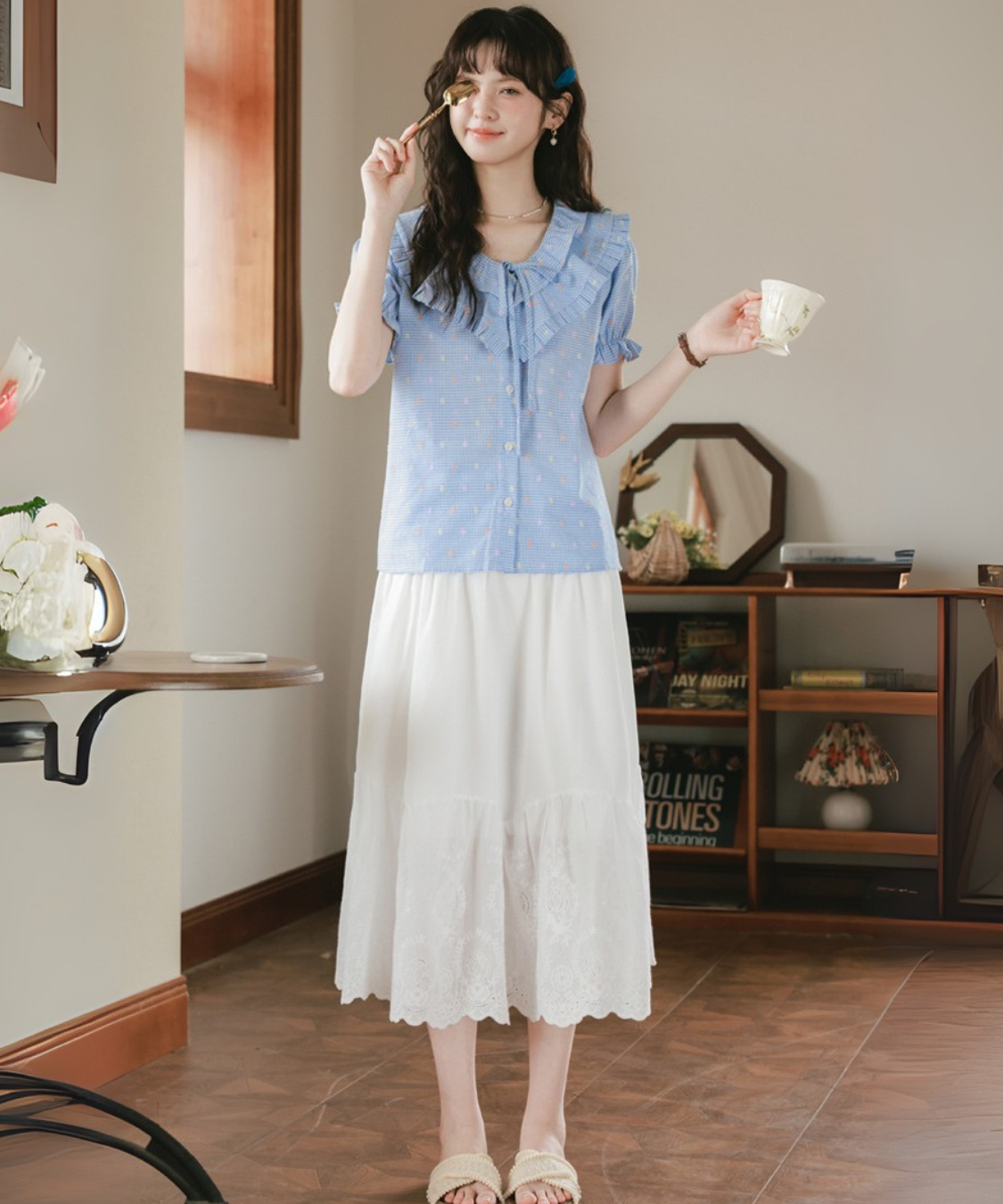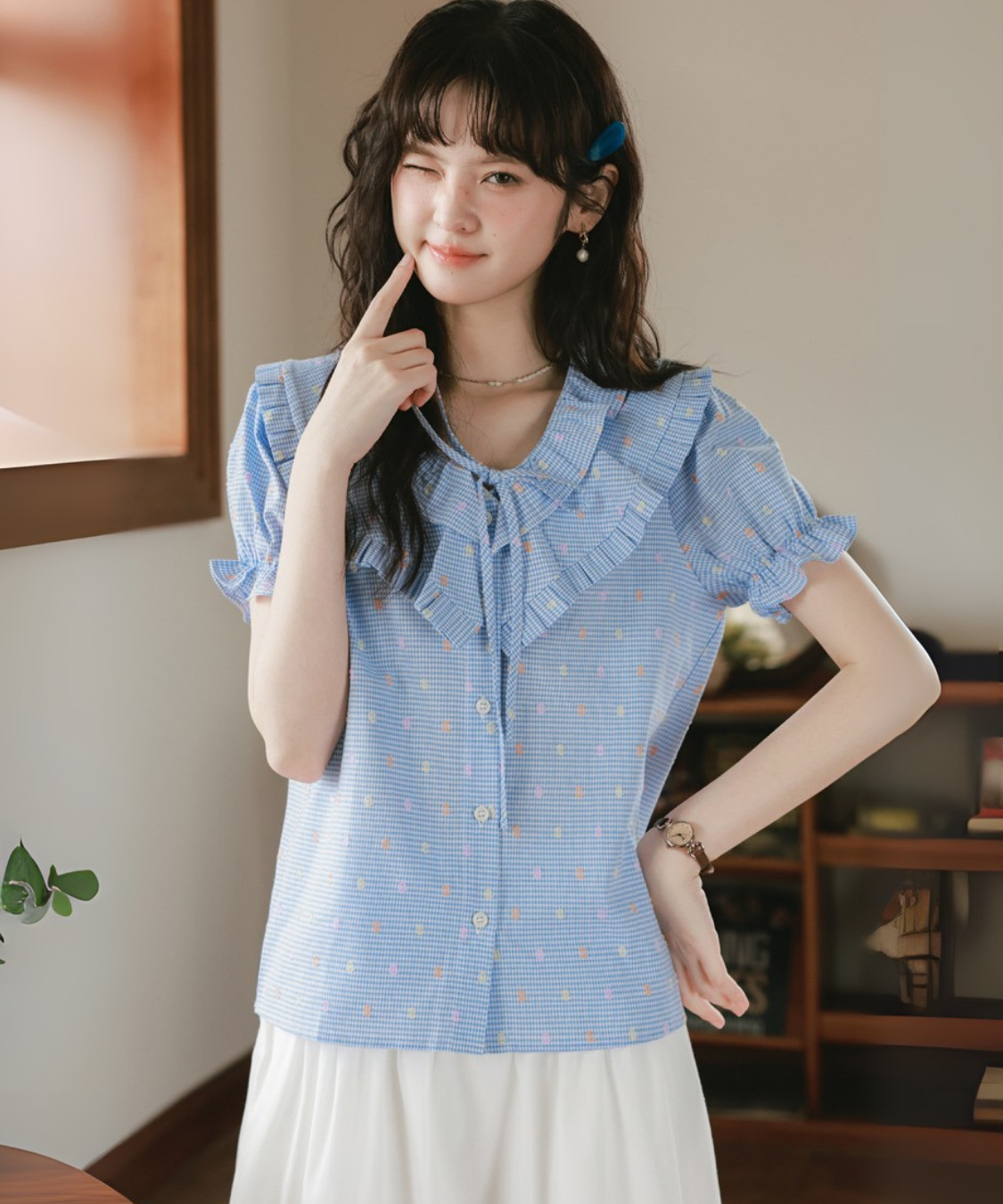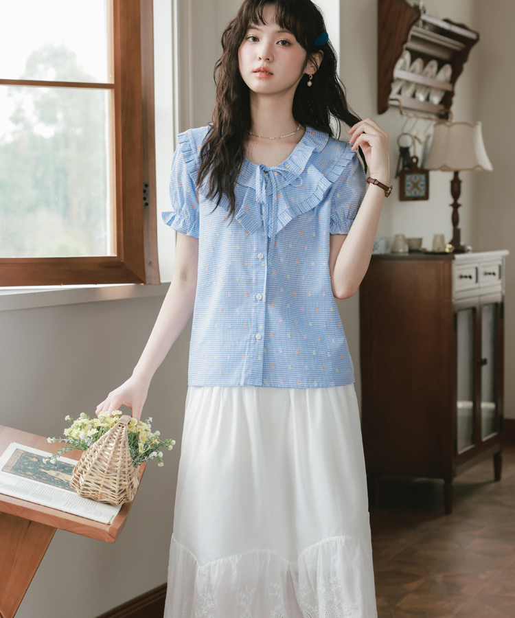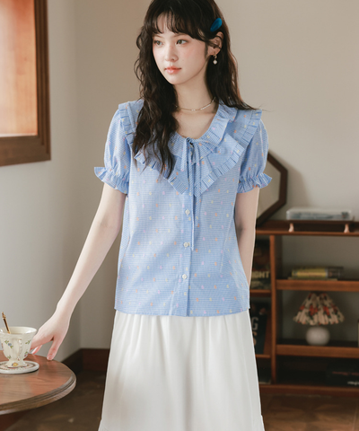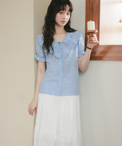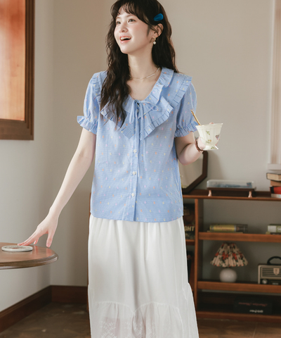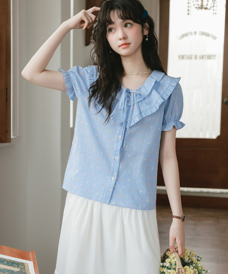 Wフリルネックリボン付きブラウス