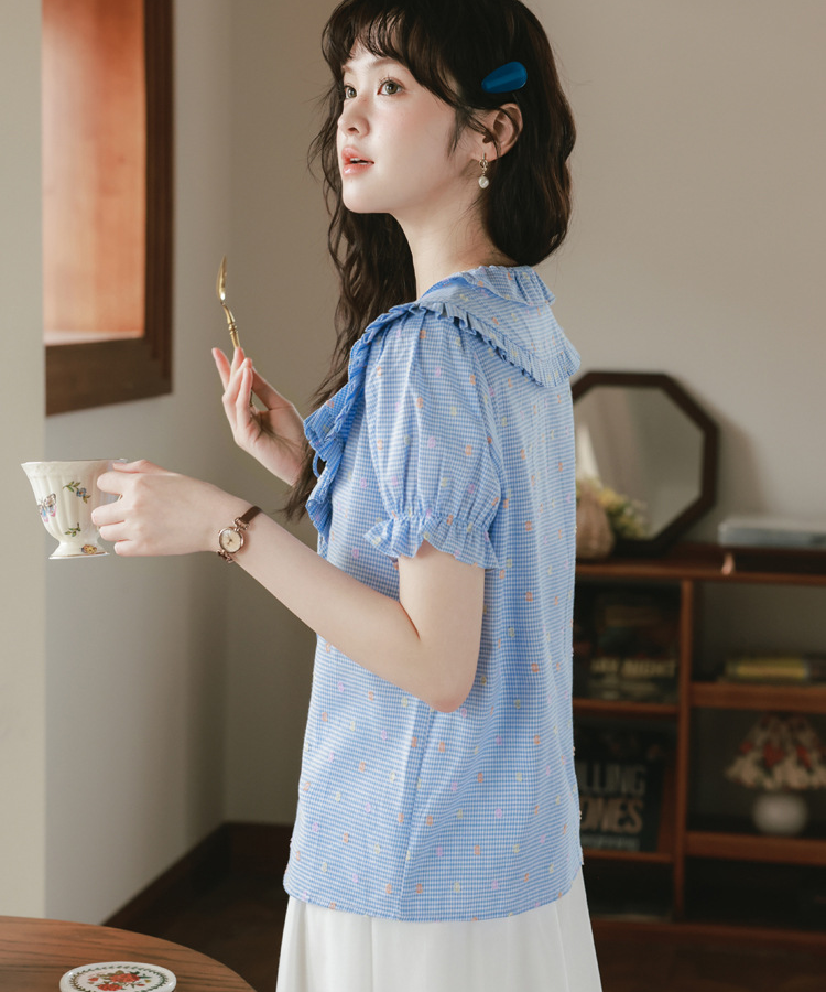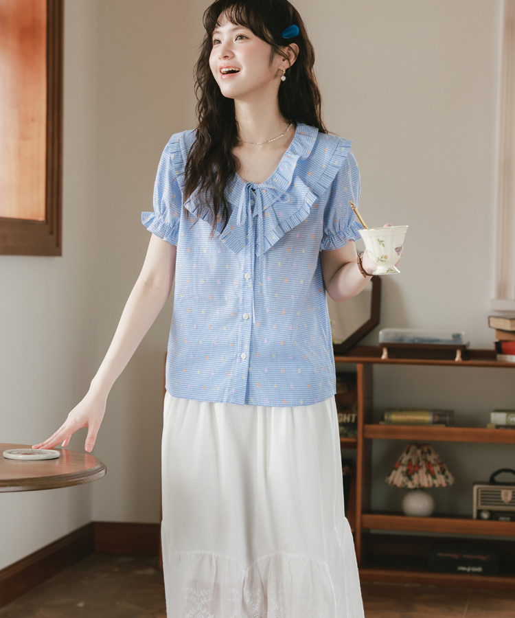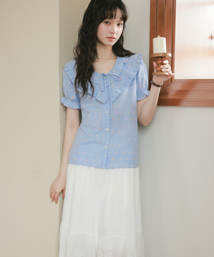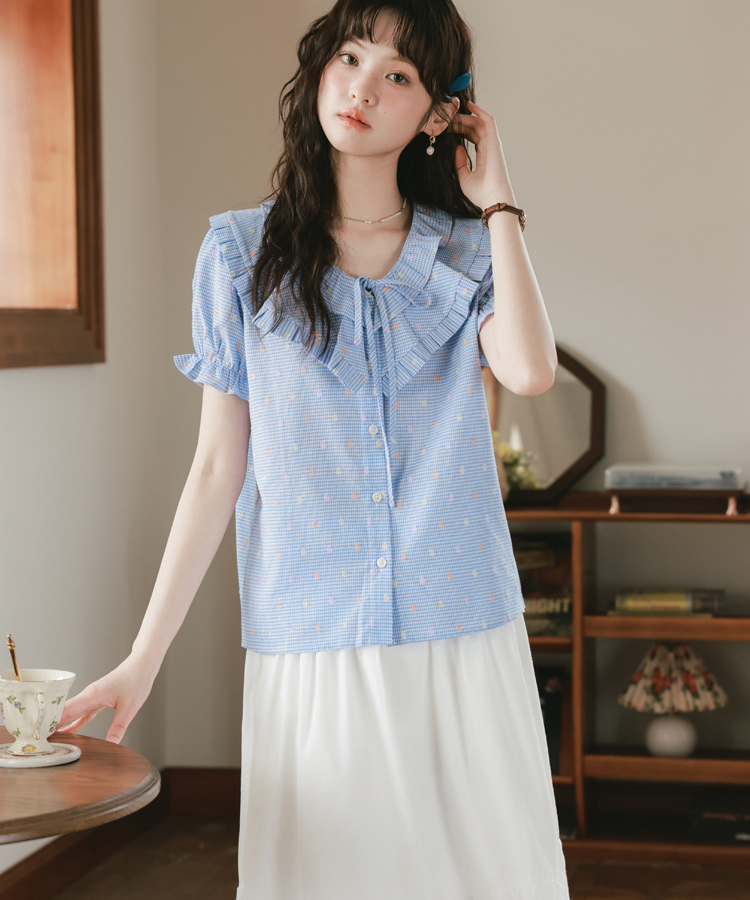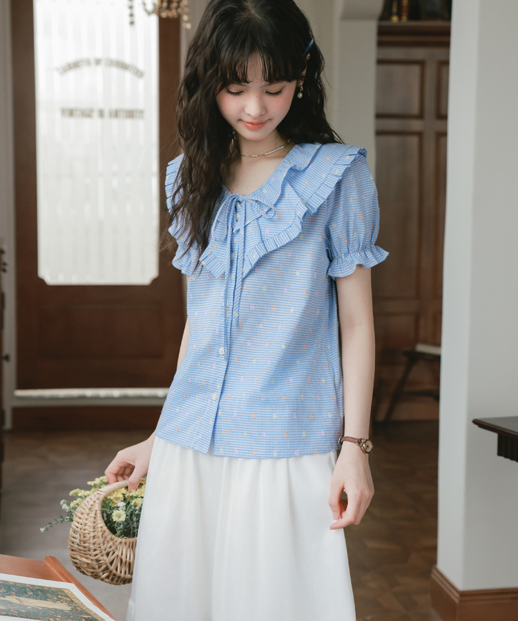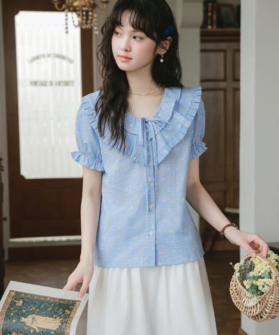 二重になったフリルネックが華やかで、目を惹くデザインのブラウスです。