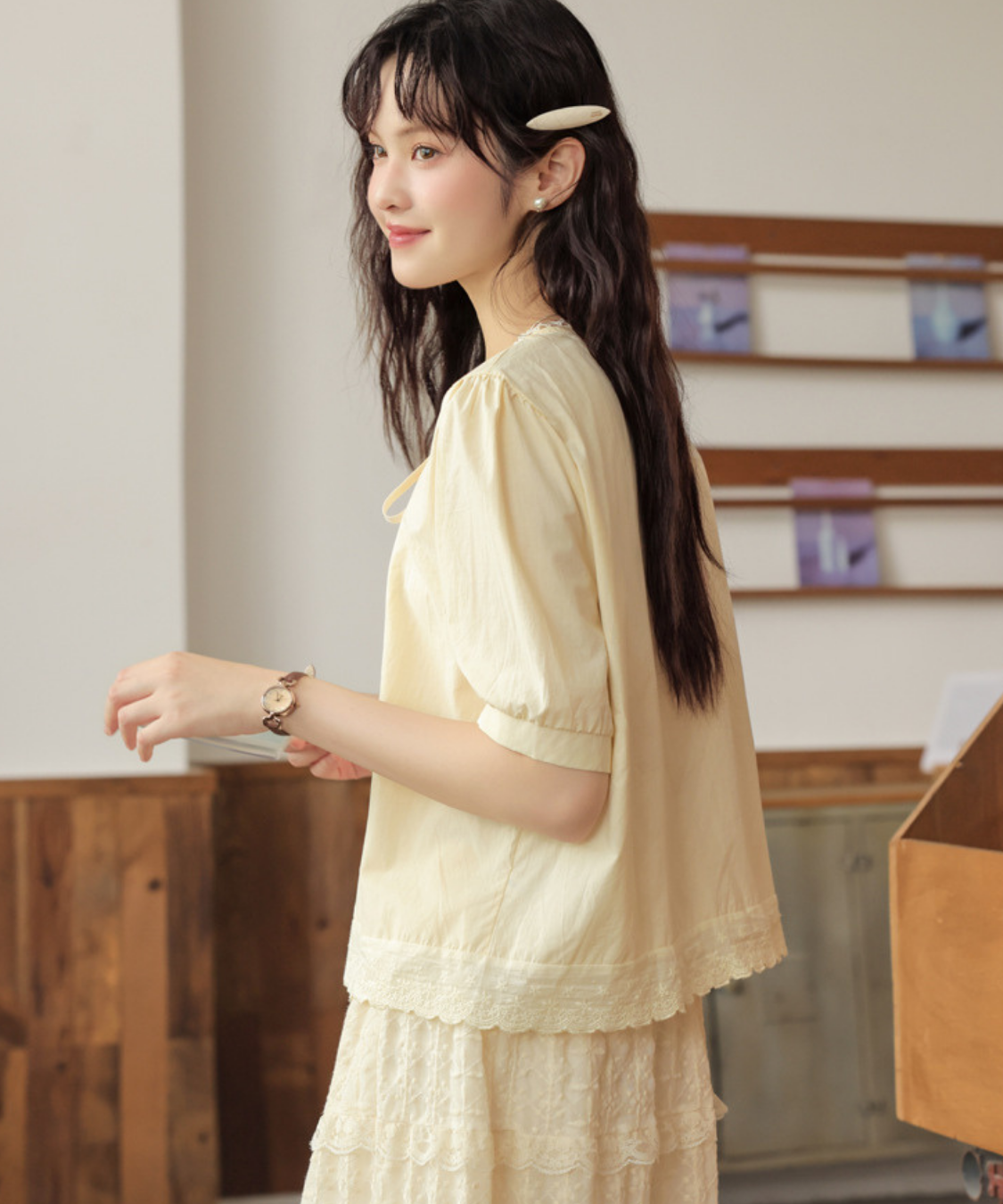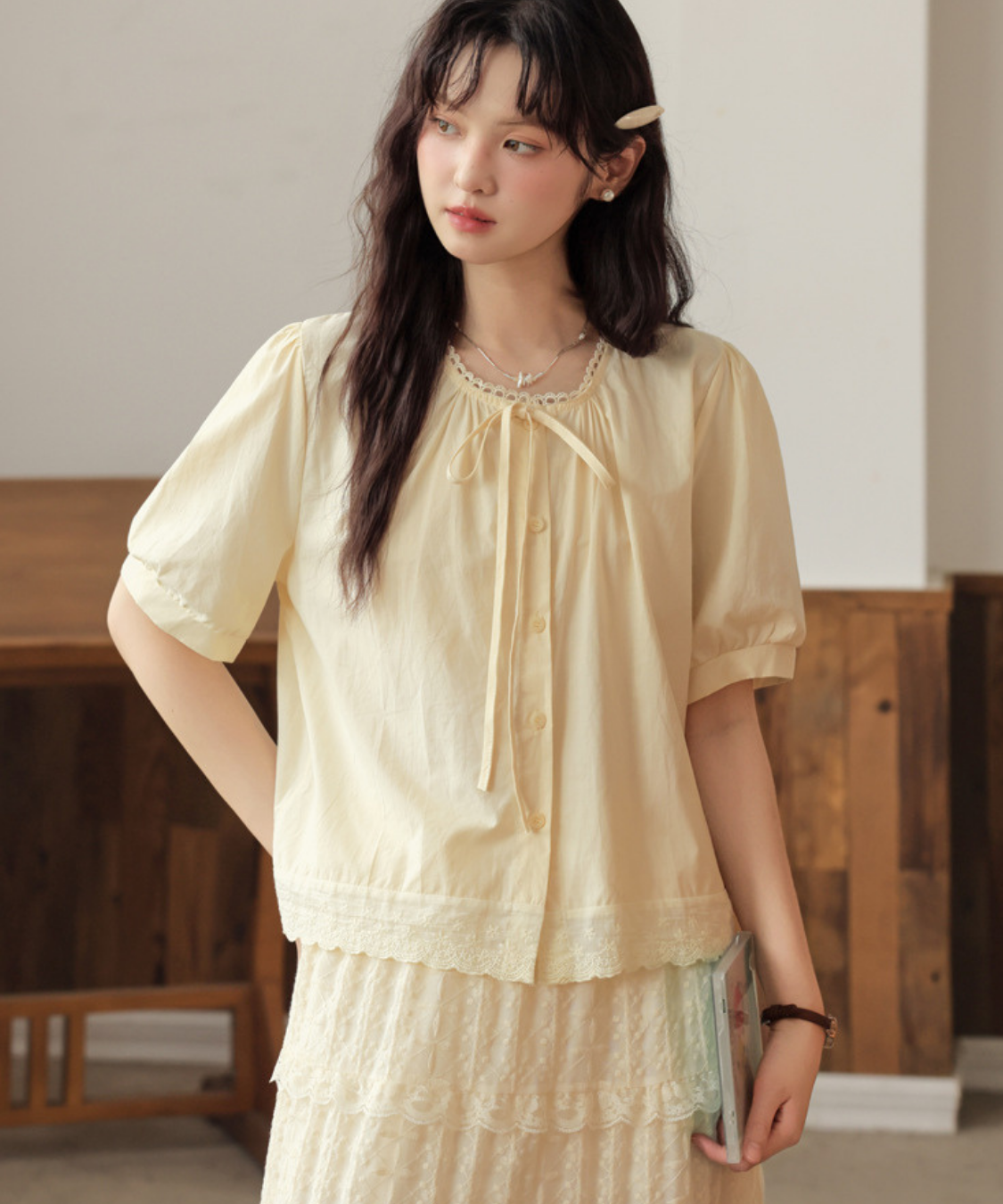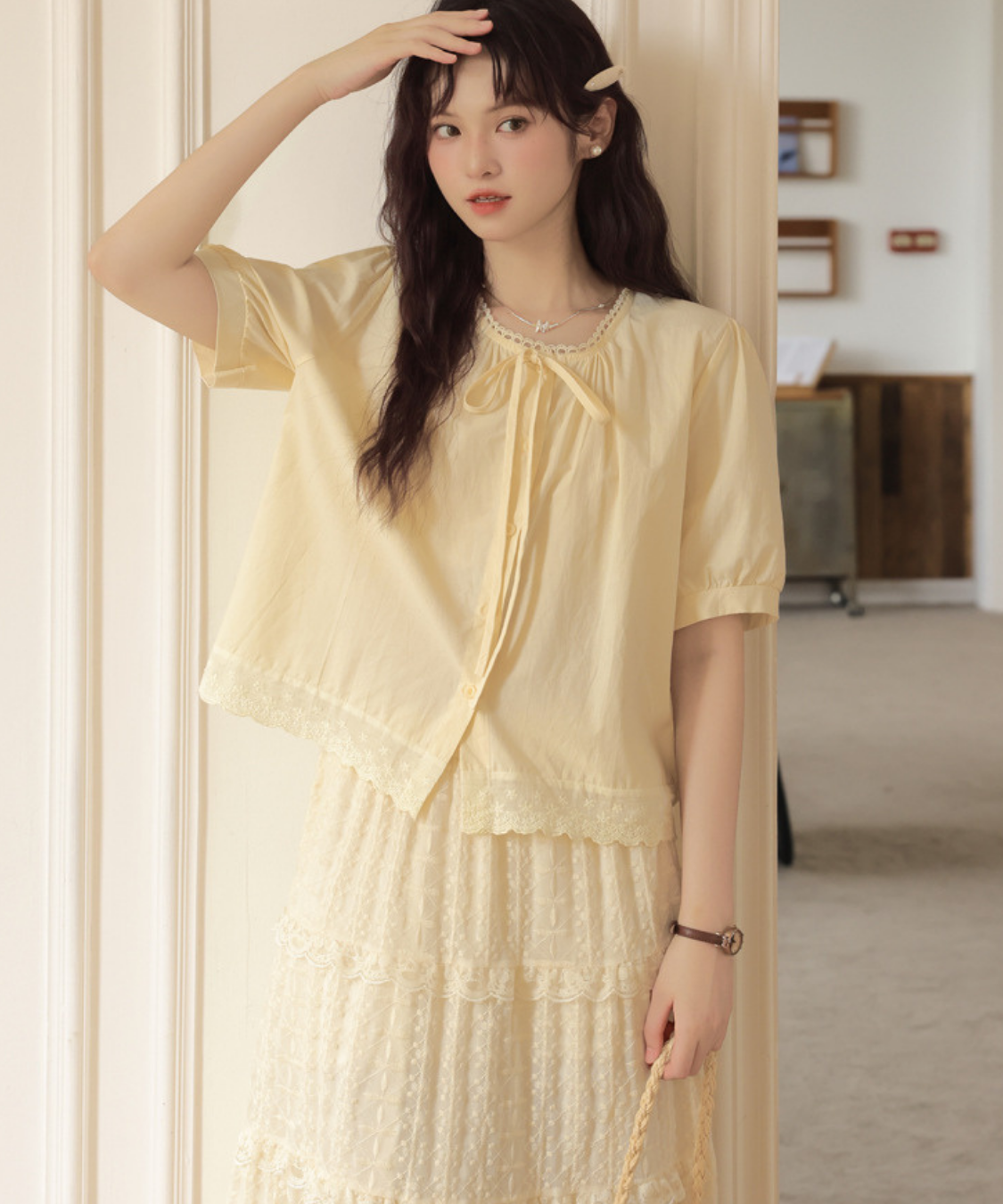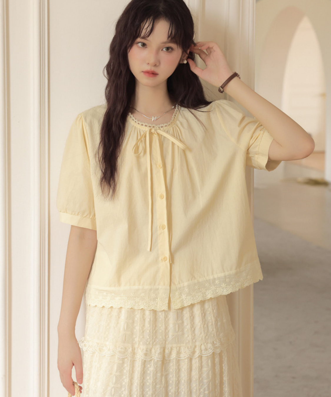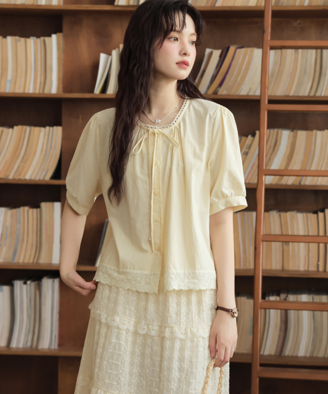 首元のリボンと裾のレースが可憐な印象を与えるフェミニンブラウスです。