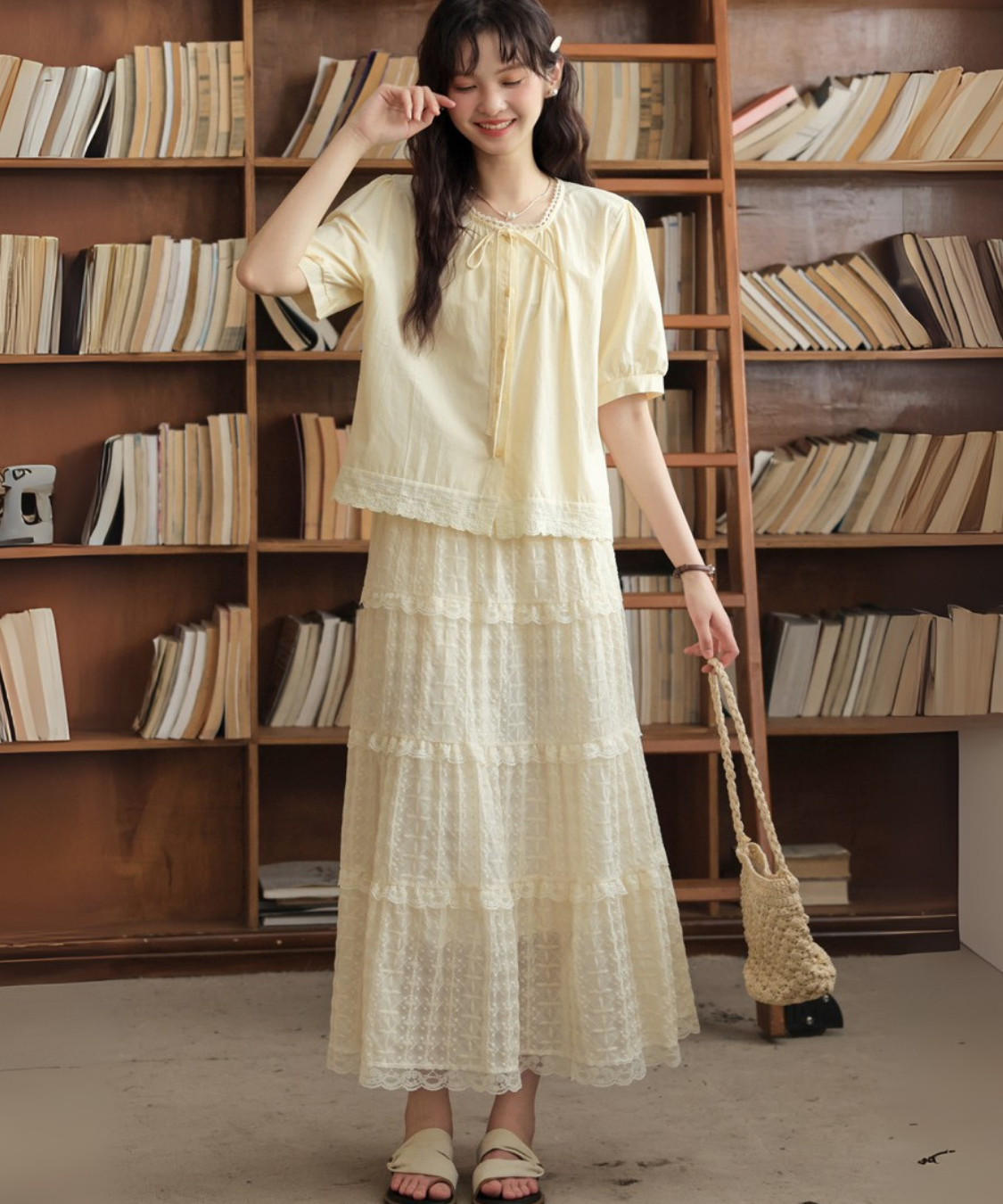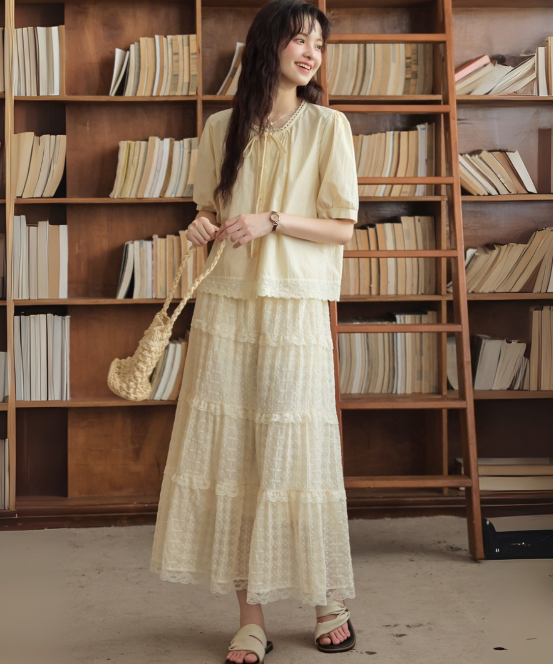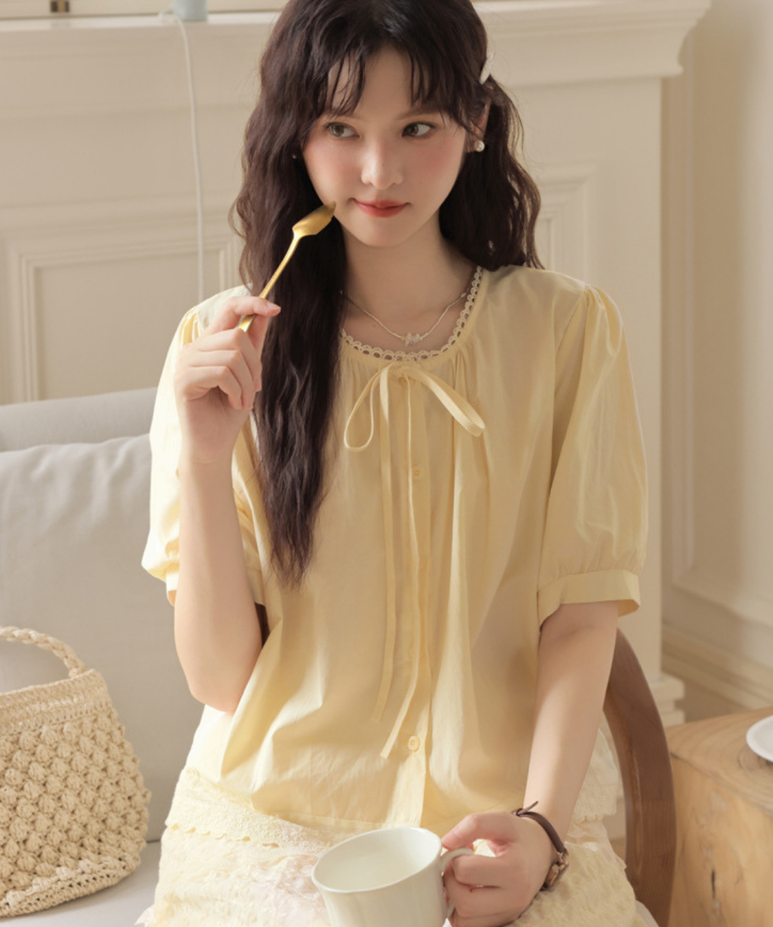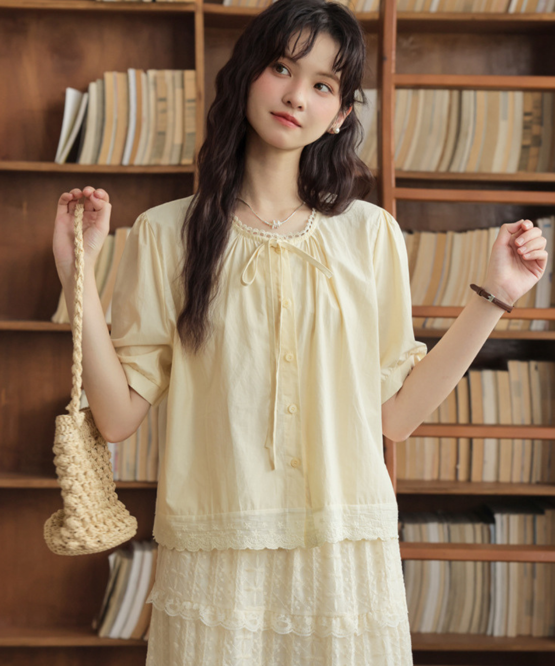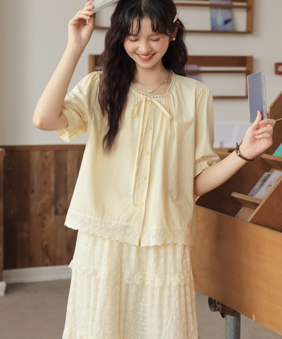 首元のリボンと裾のレースが可憐な印象を与えるフェミニンブラウスです。