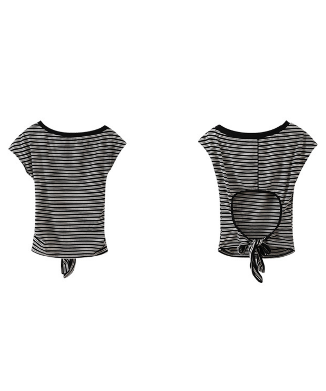 大胆な背中開きとリボンデザインが魅力のカットソーです。