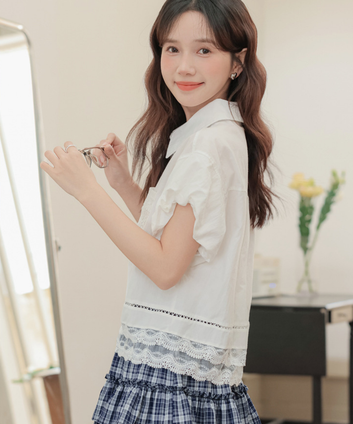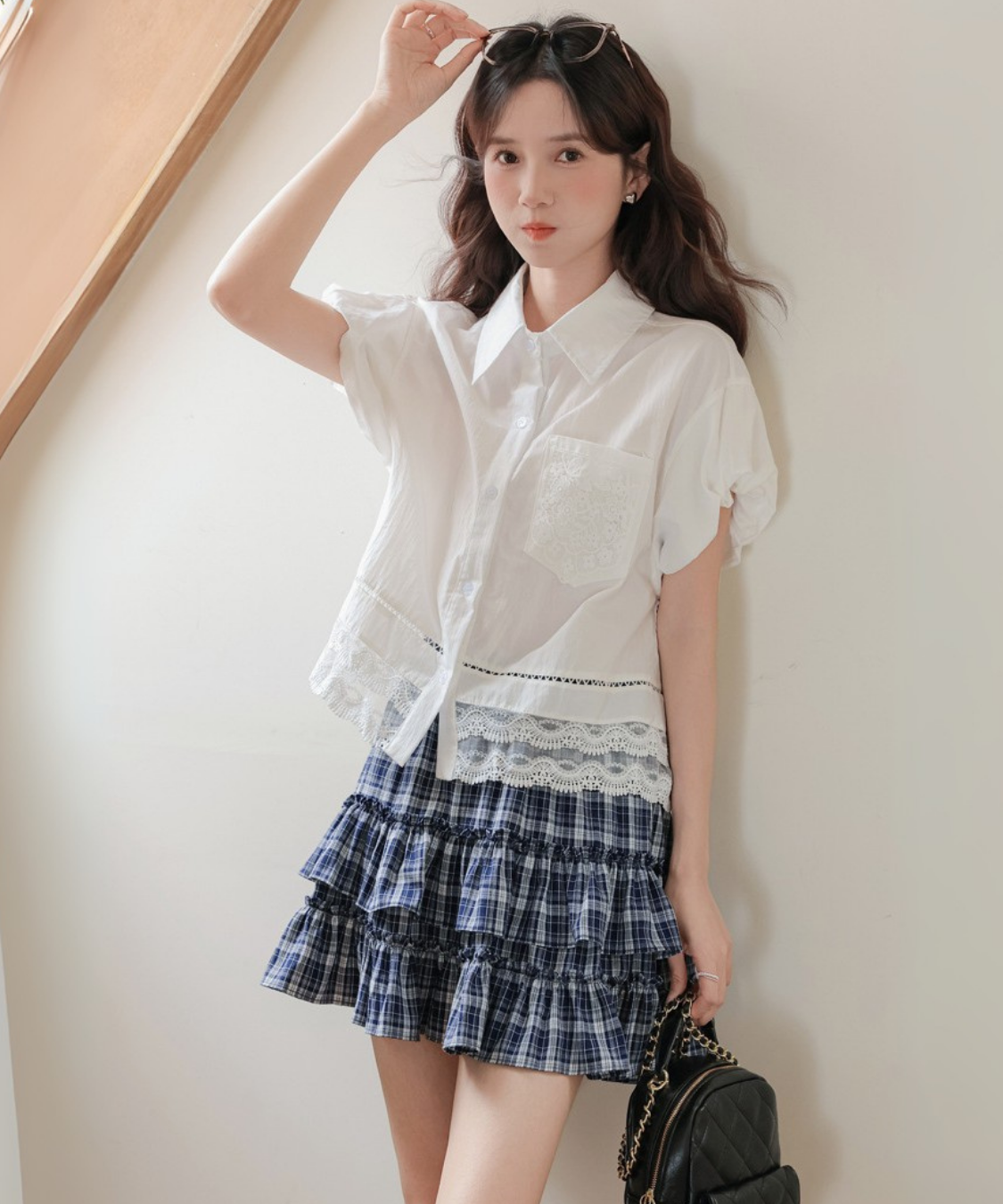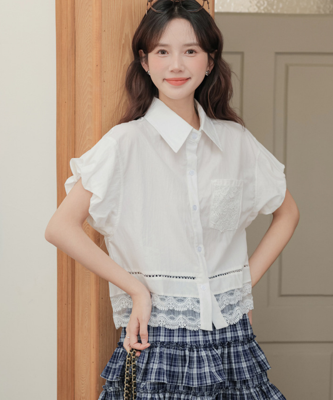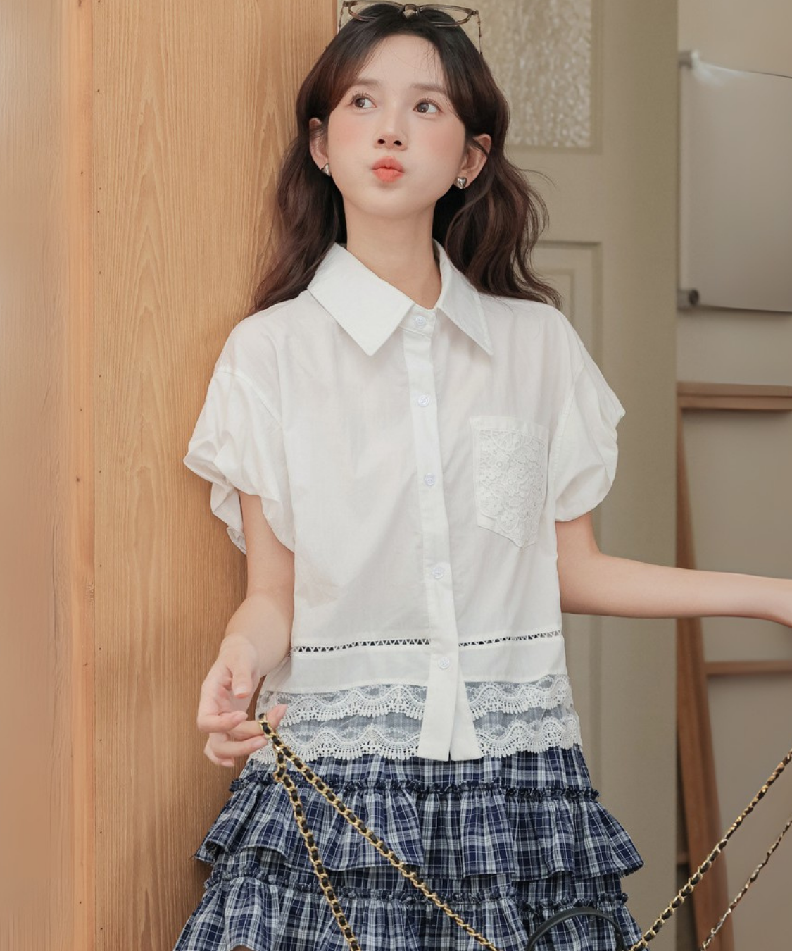 裾のレースが透けてとても可愛いです。レースのおかげで暑い夏にインして着用しなくていいので、涼しく着れました。スカートをブラックにするとレースが目立って可愛いです。胸のポケットにもレースが付いていておしゃれです。