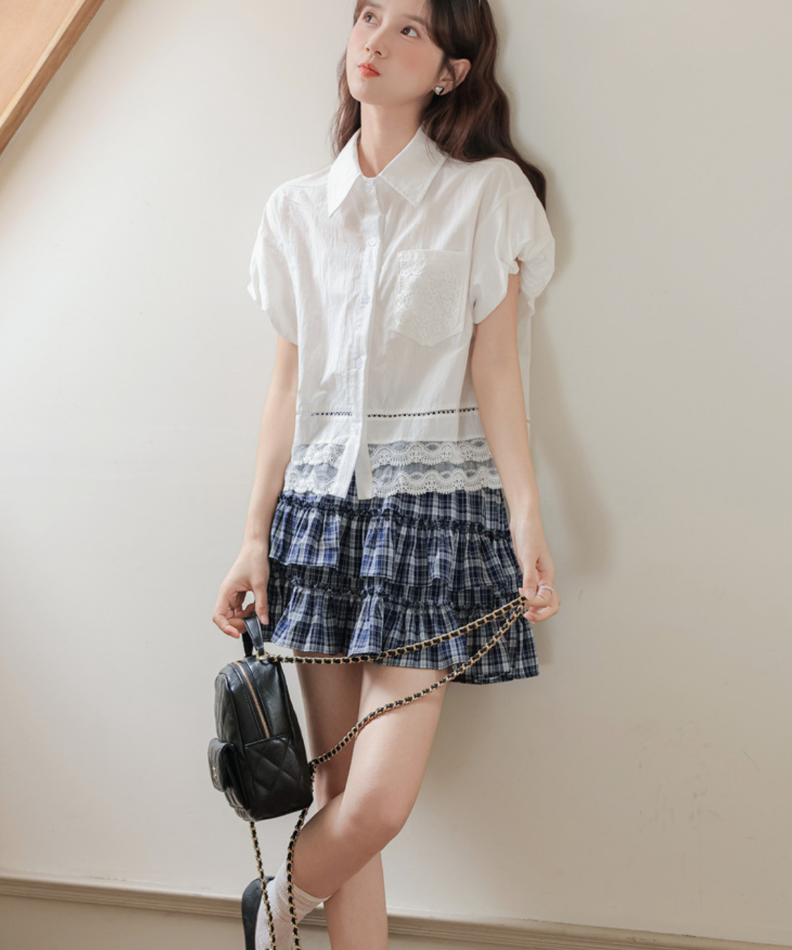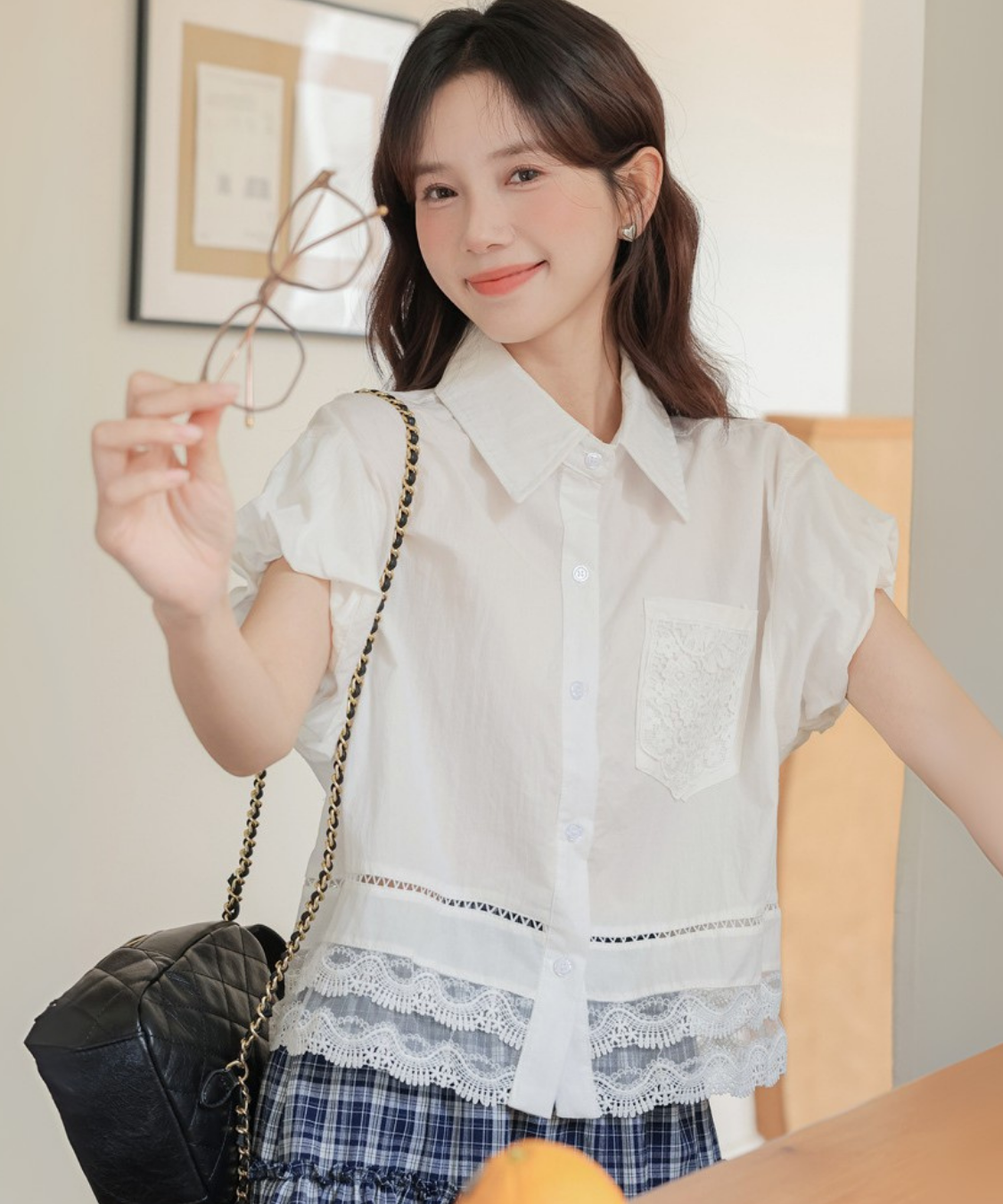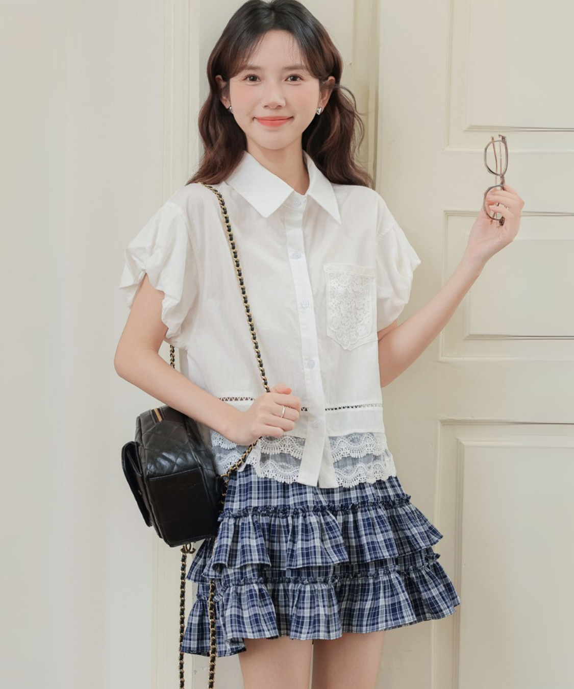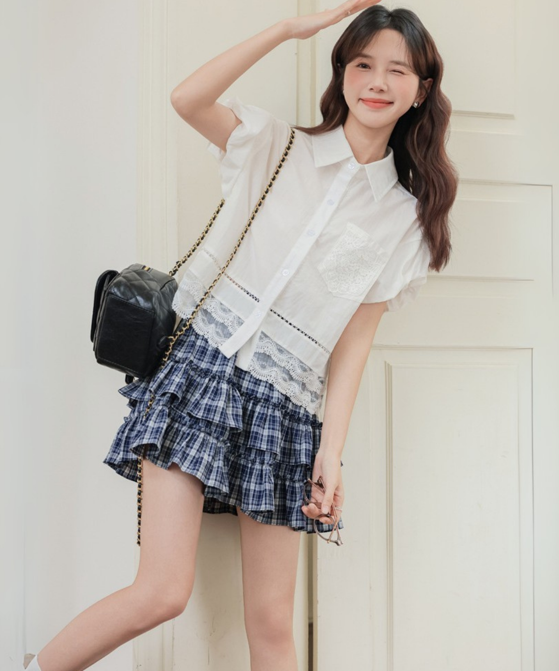 裾のレースが透けてとても可愛いです。レースのおかげで暑い夏にインして着用しなくていいので、涼しく着れました。スカートをブラックにするとレースが目立って可愛いです。胸のポケットにもレースが付いていておしゃれです。