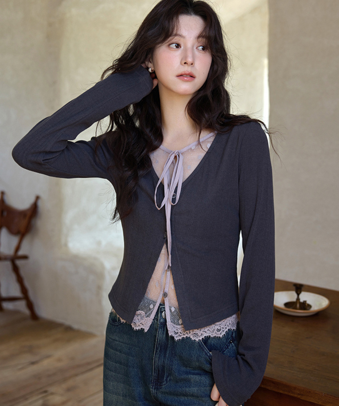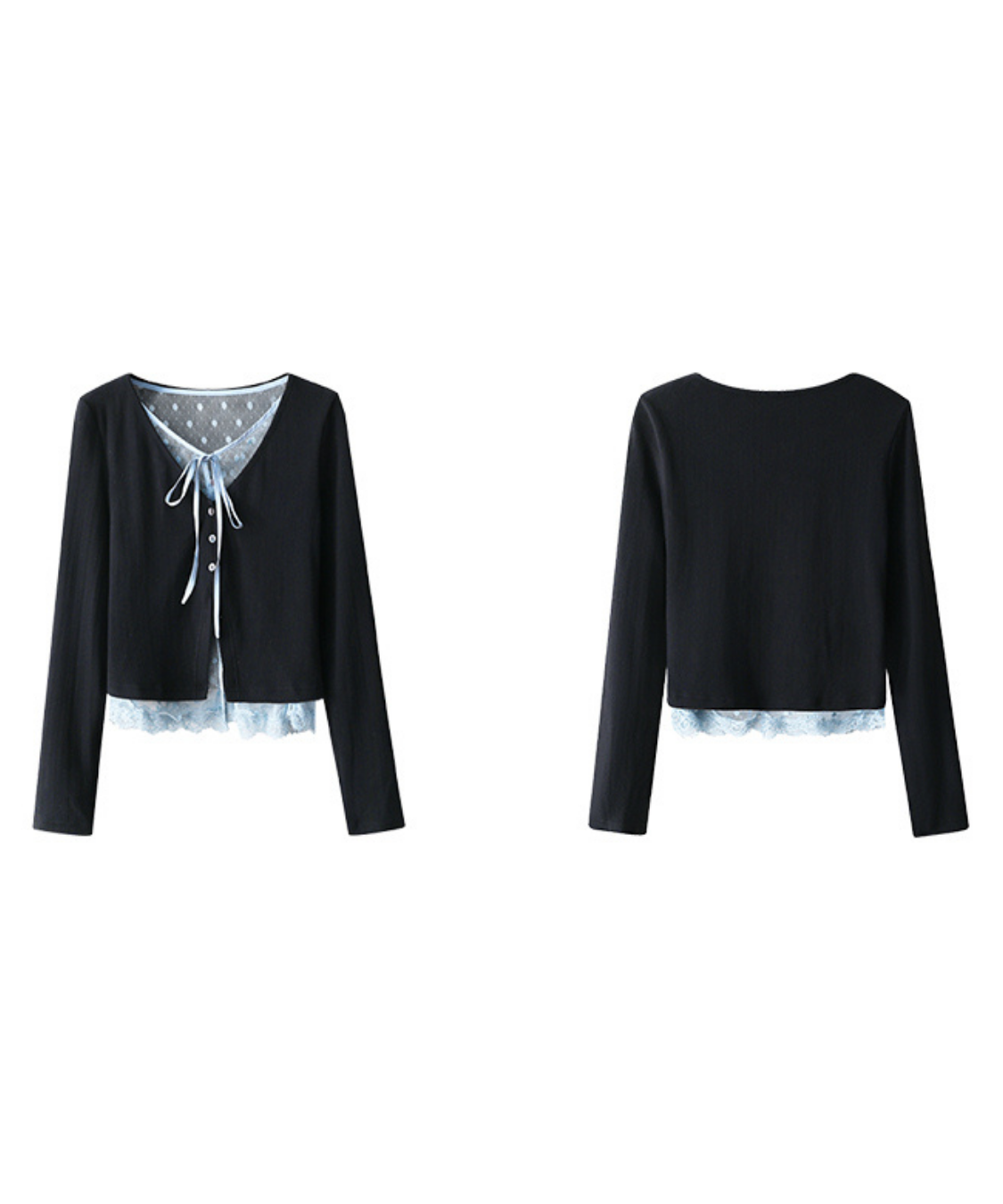カーディガンとインナーを重ねたようなレイヤード風デザインが特徴のトップスです。