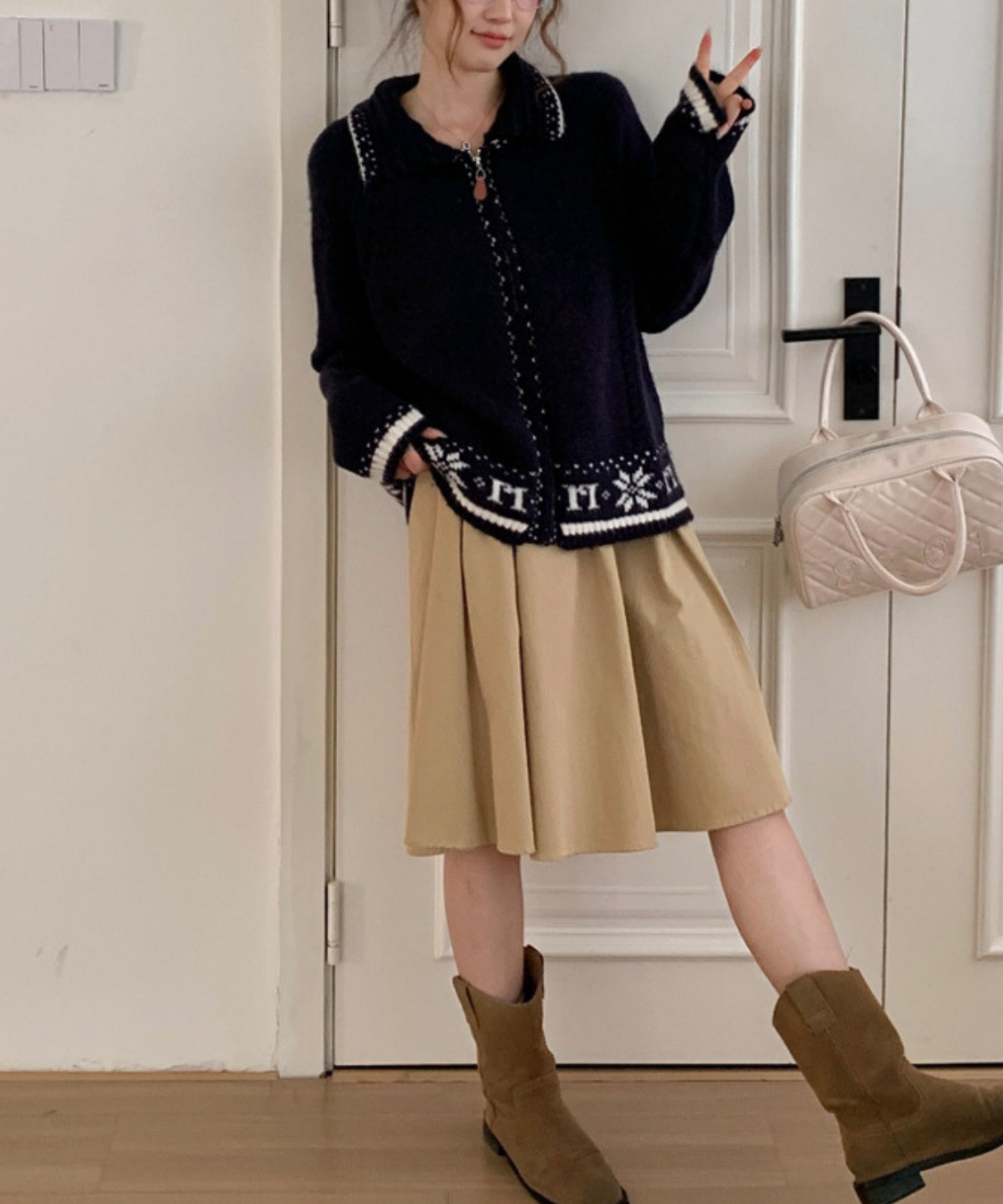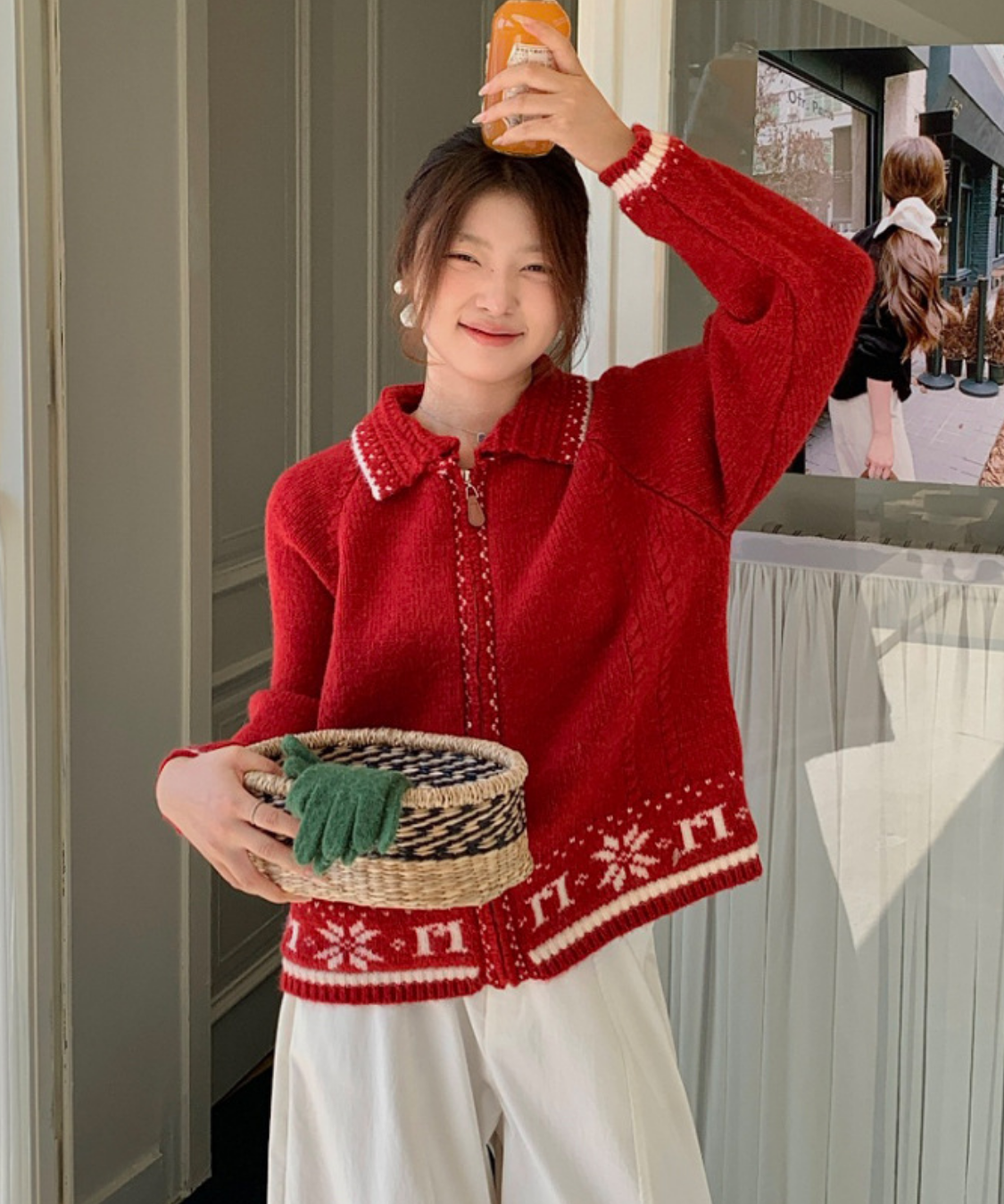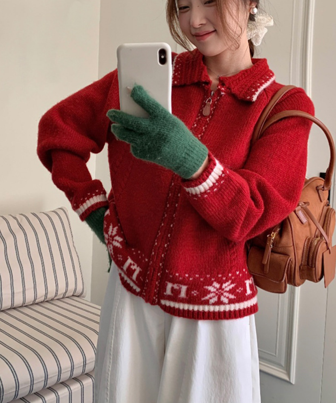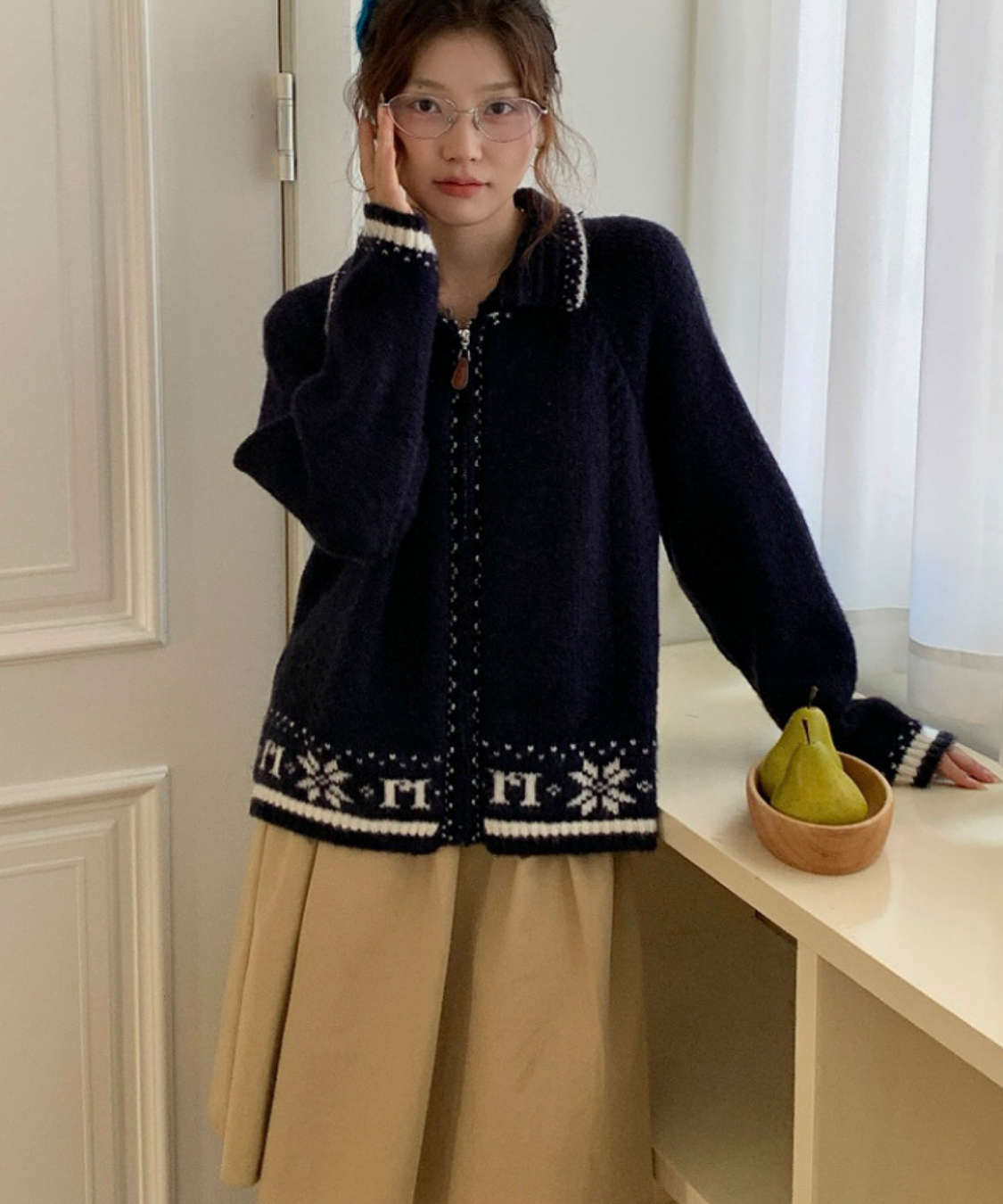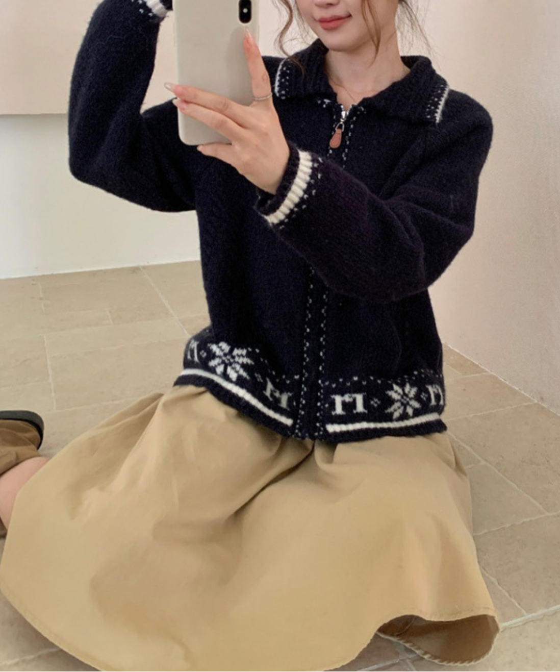ノルディック柄と配色ラインがシーズンムードを高めてくれるニットカーディガンです。
