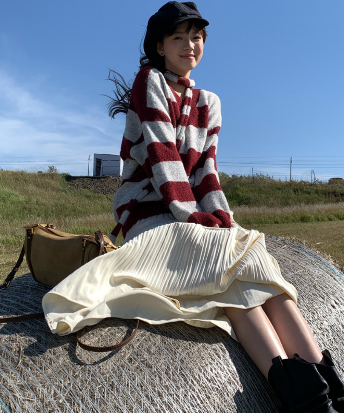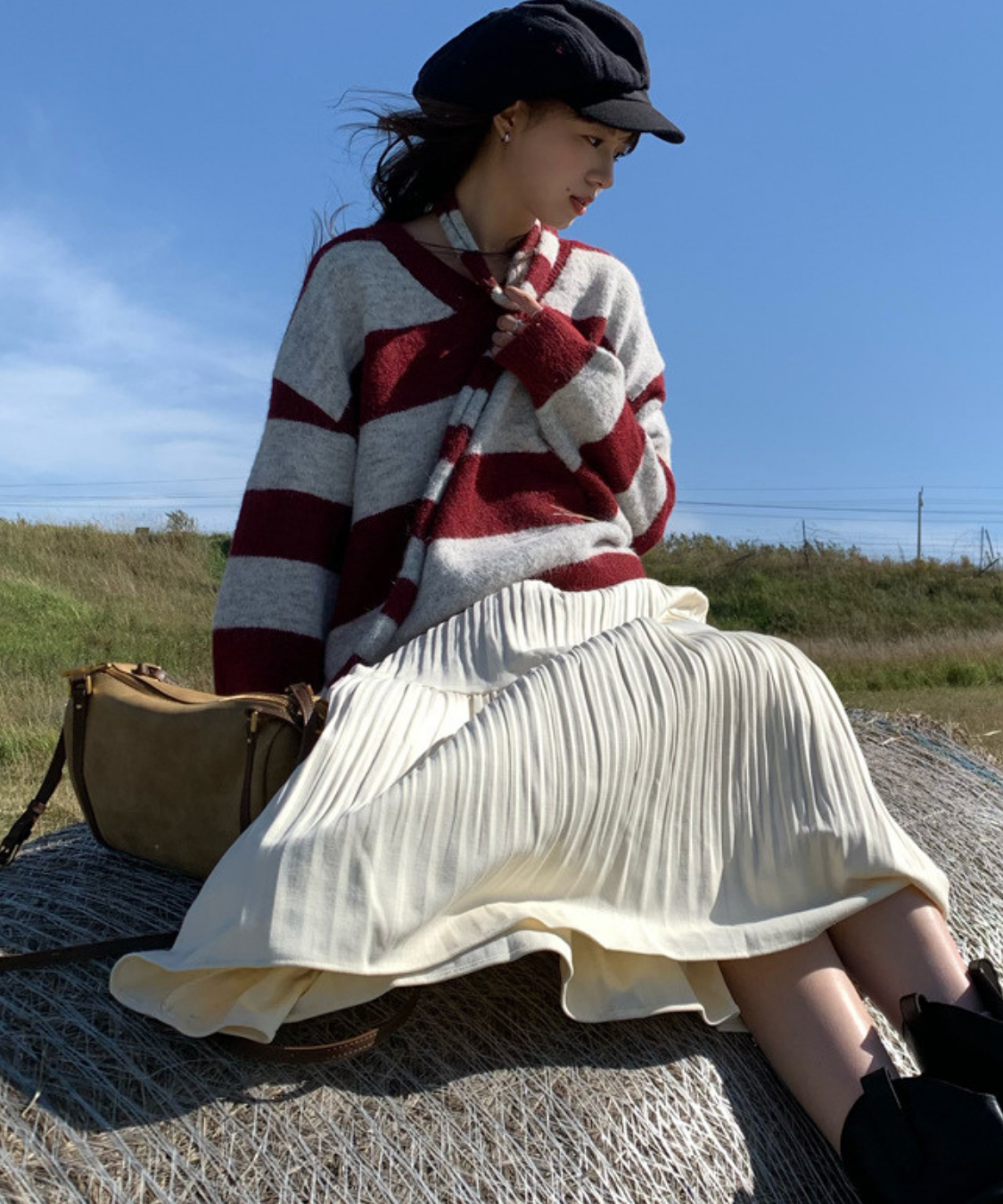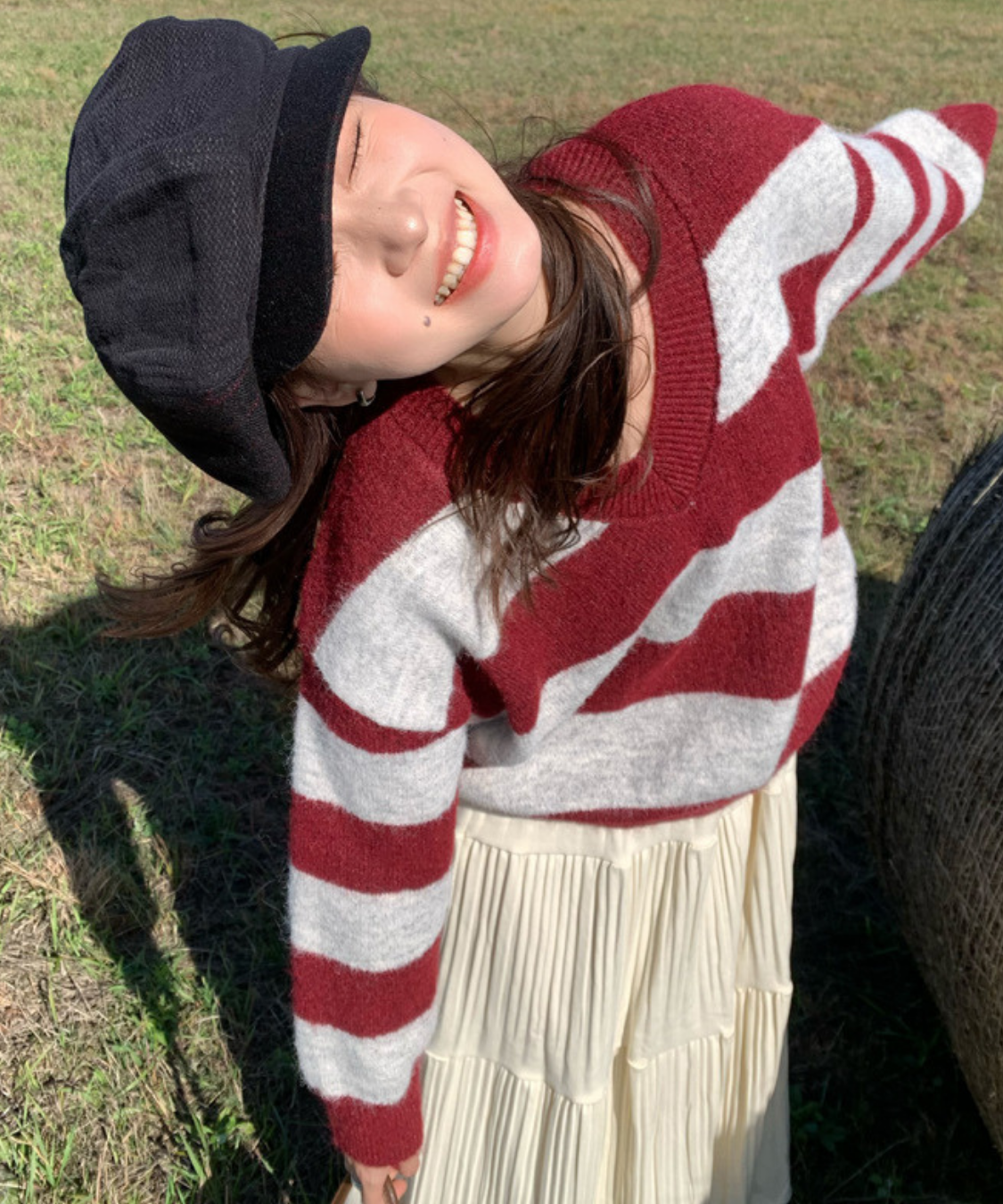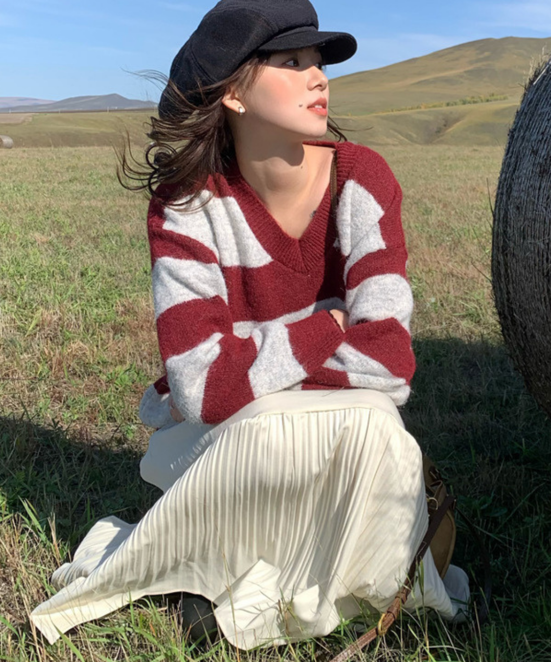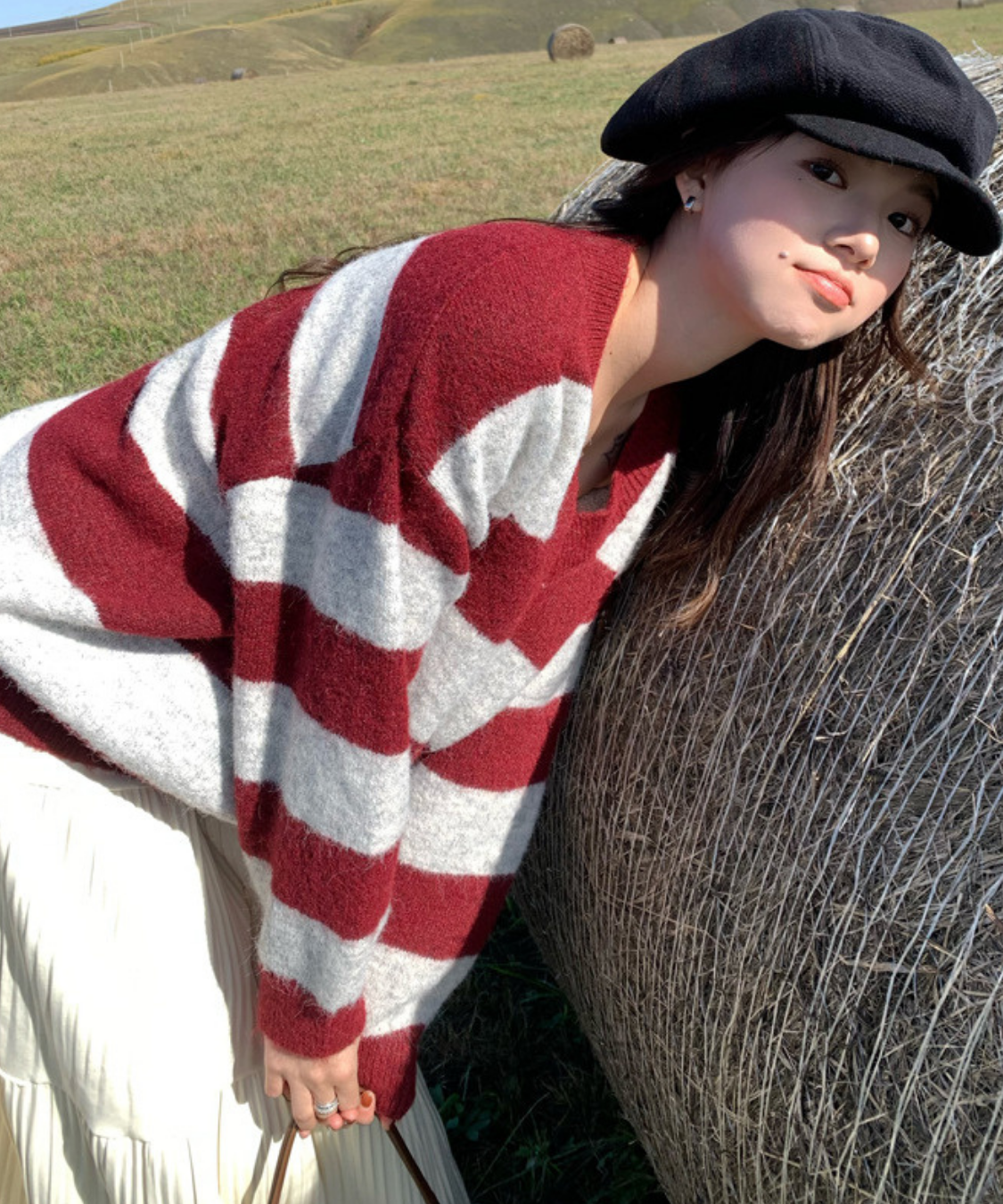 存在感のある太めボーダーが目を引く、ルーズシルエットのVネックニットです。