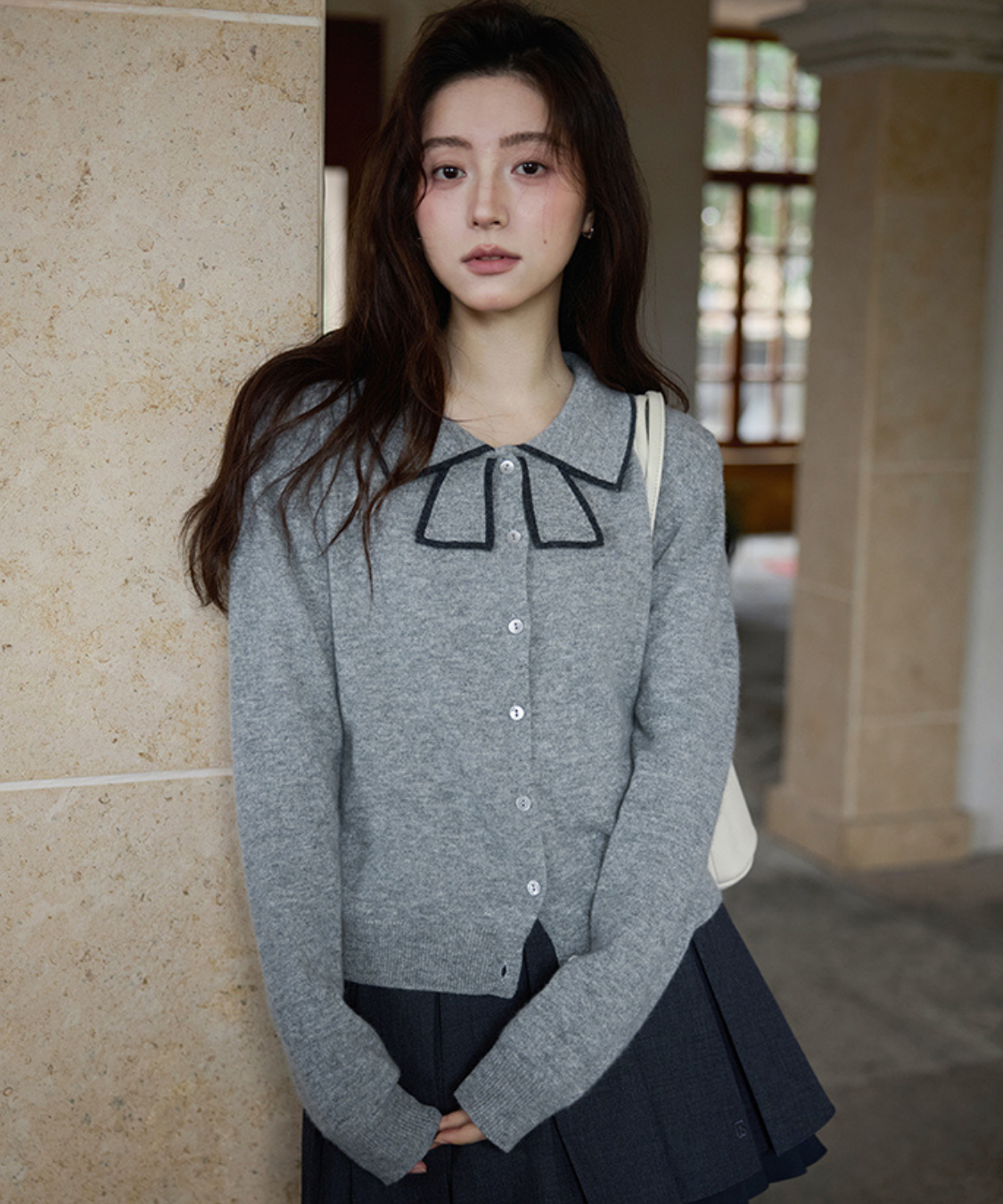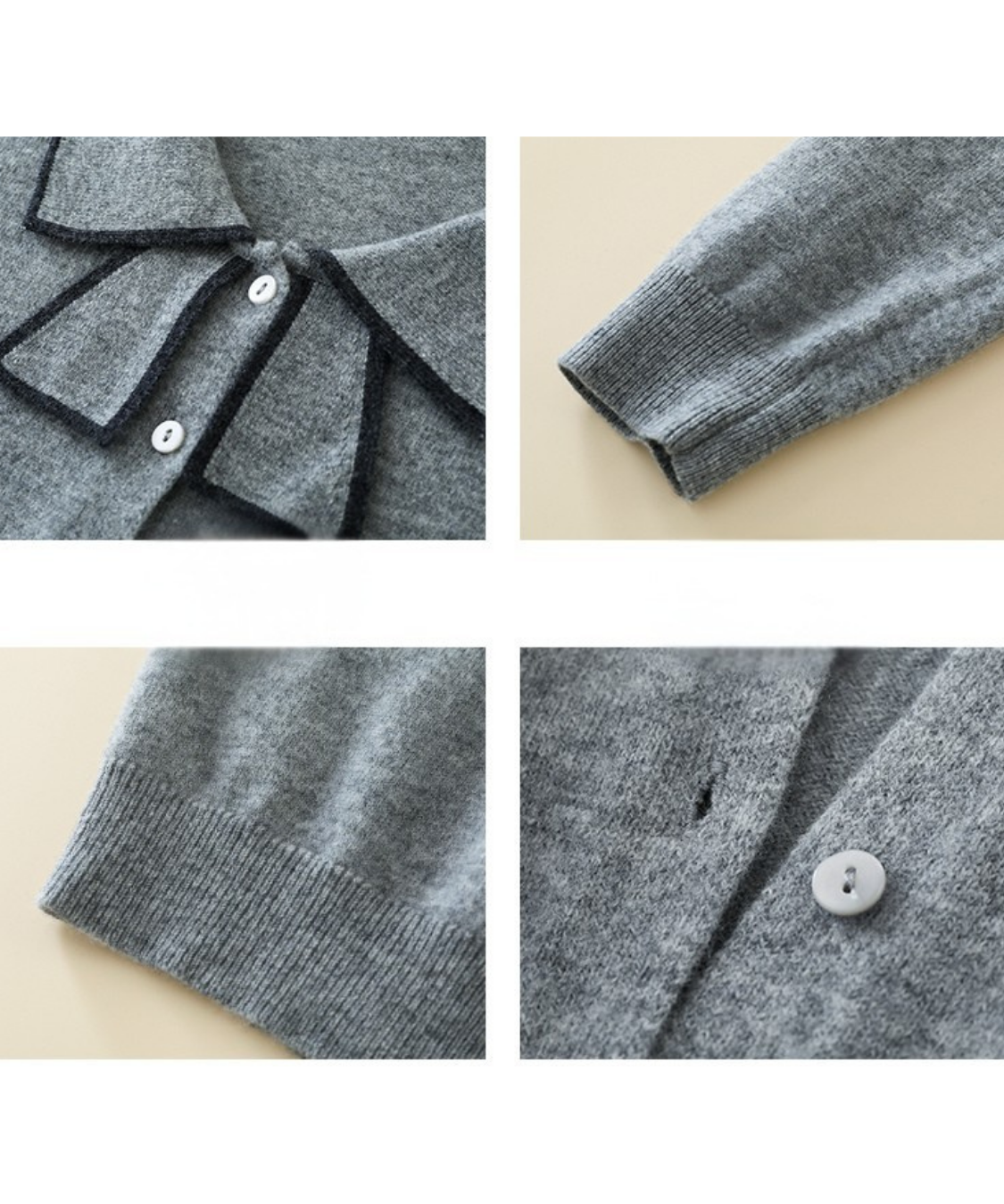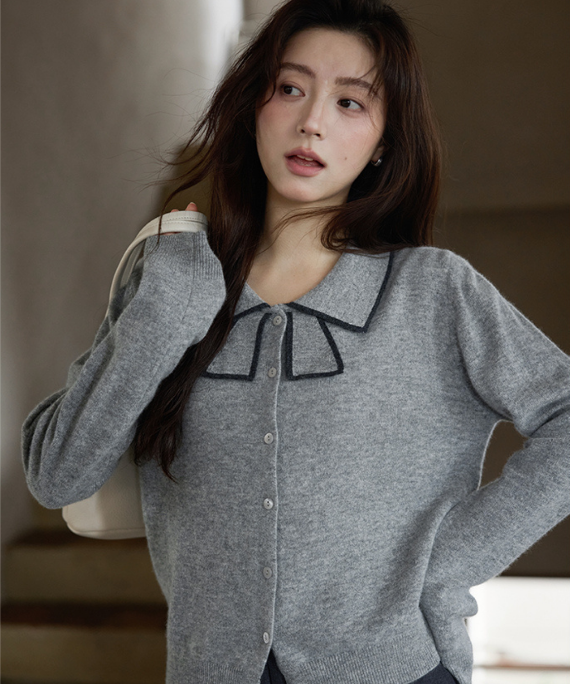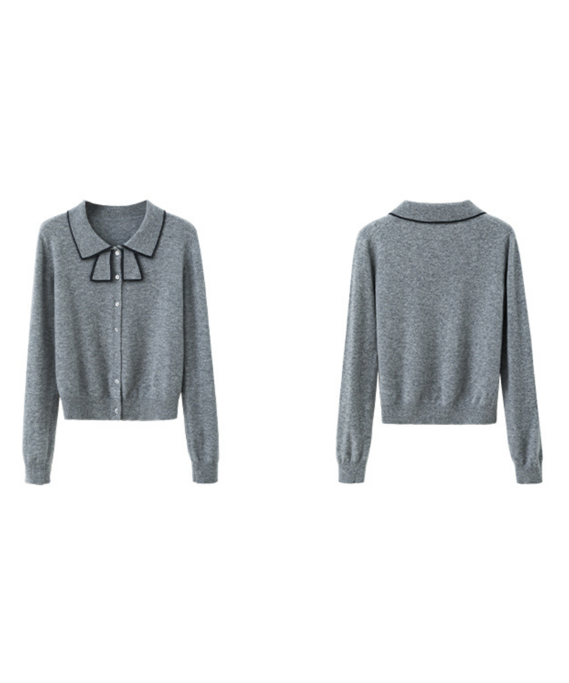リボンを結んだように見える襟デザインがポイントのカーディガンです。