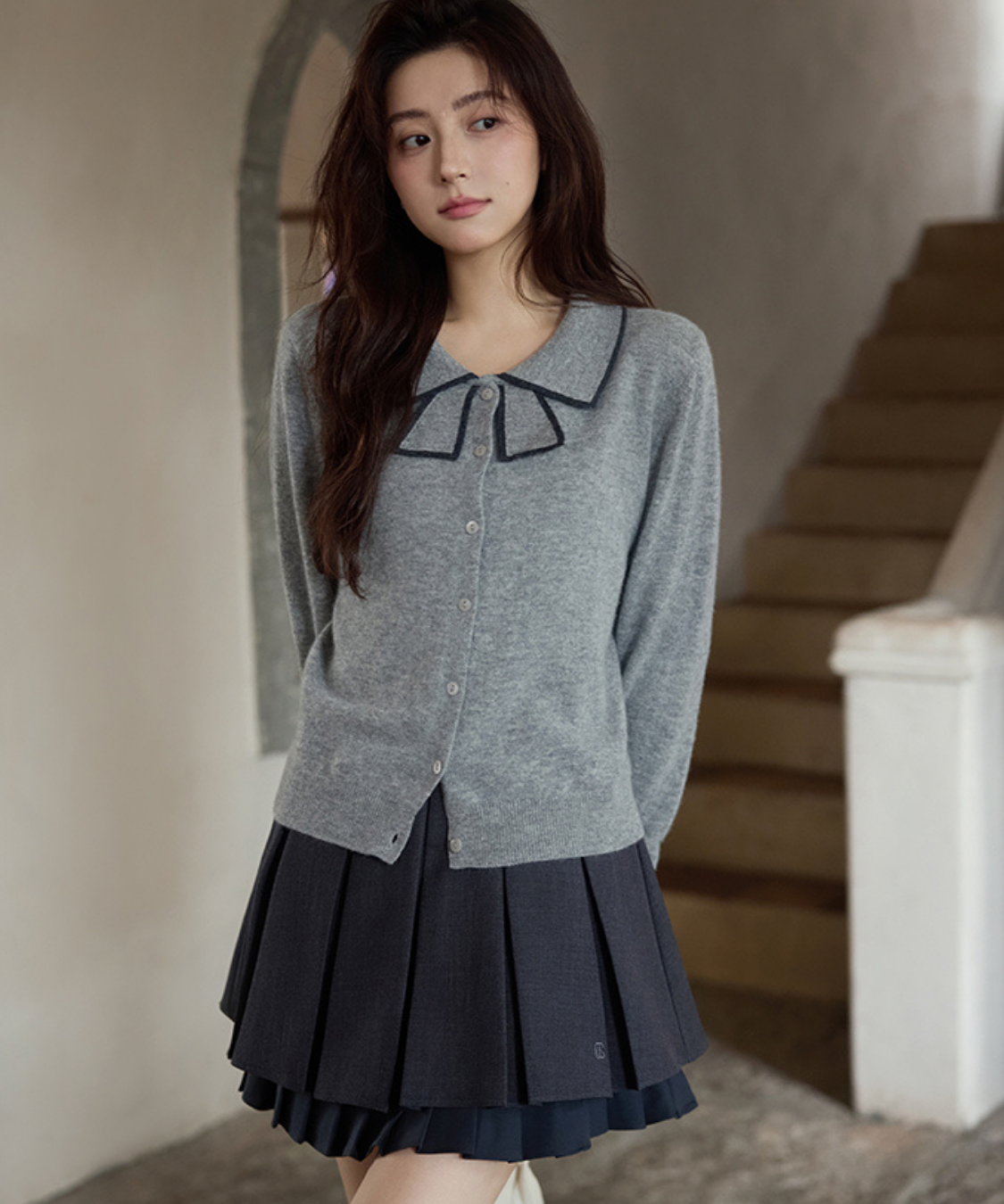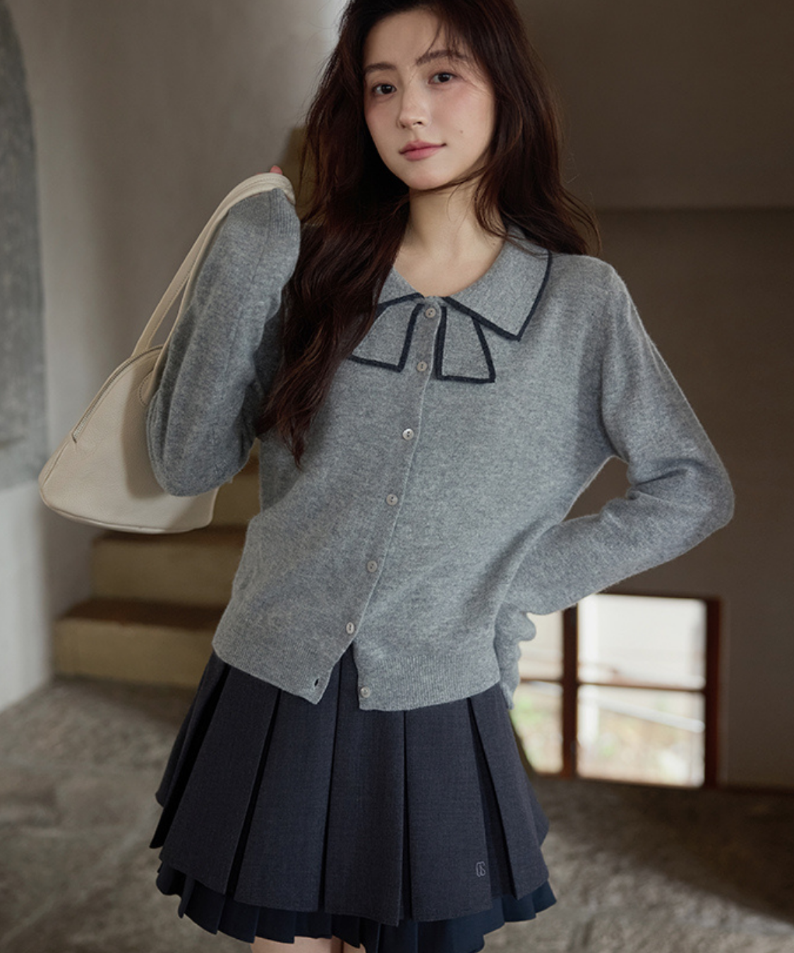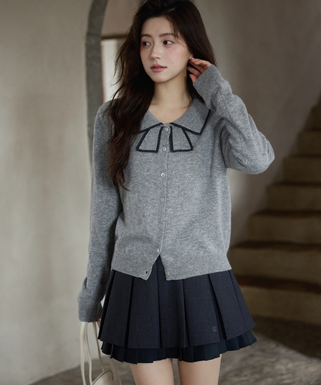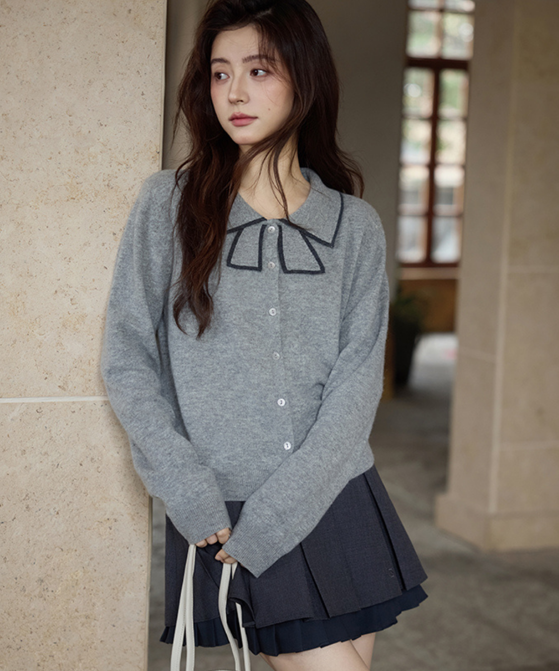 リボンを結んだように見える襟デザインがポイントのカーディガンです。