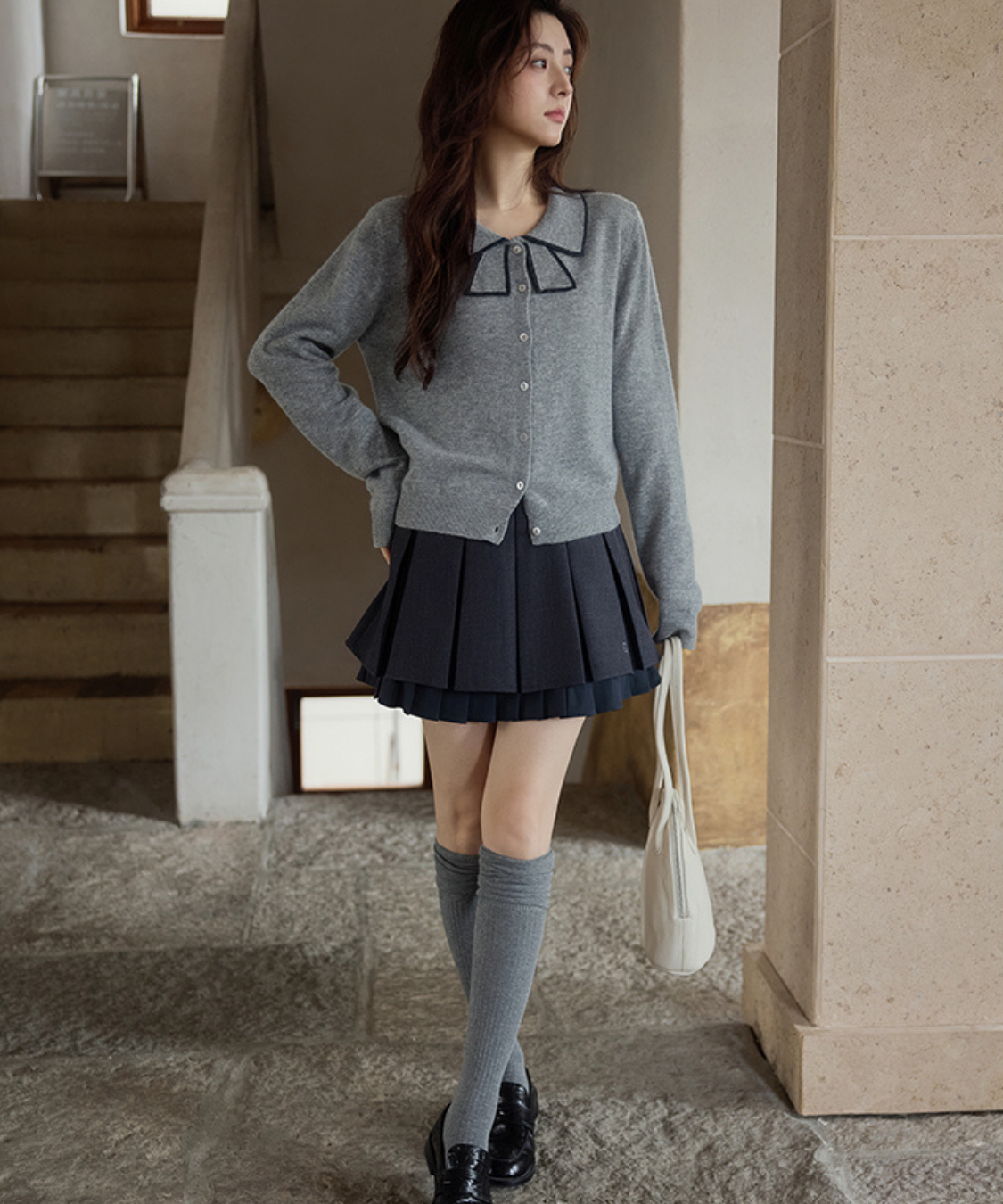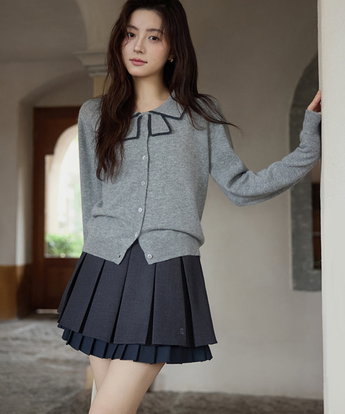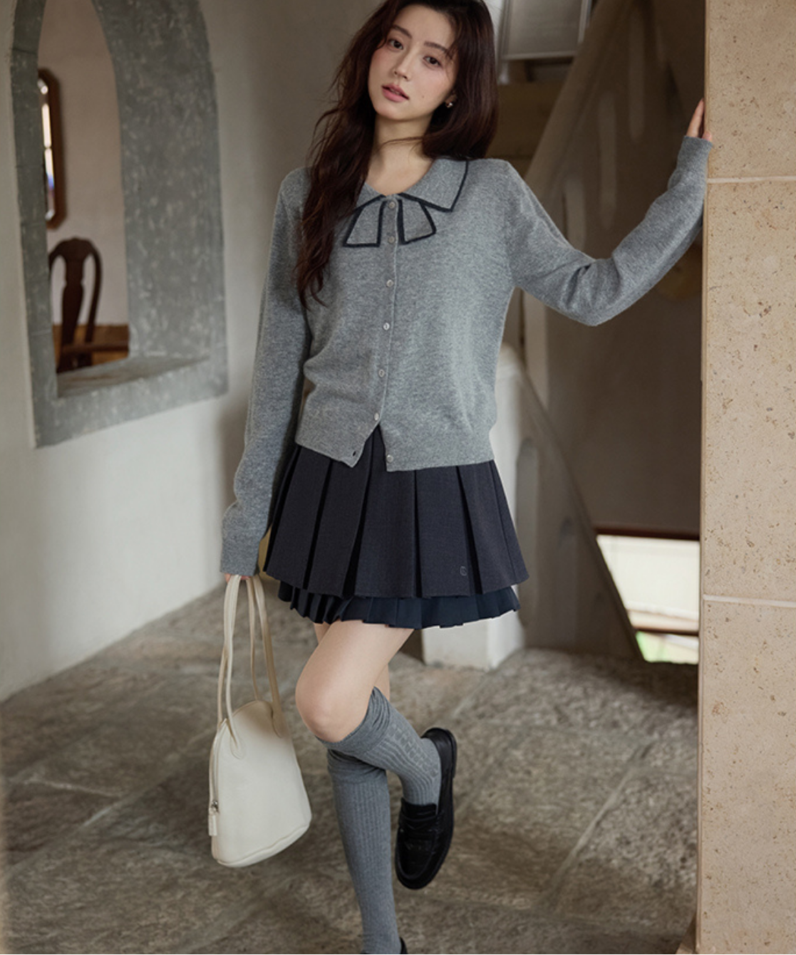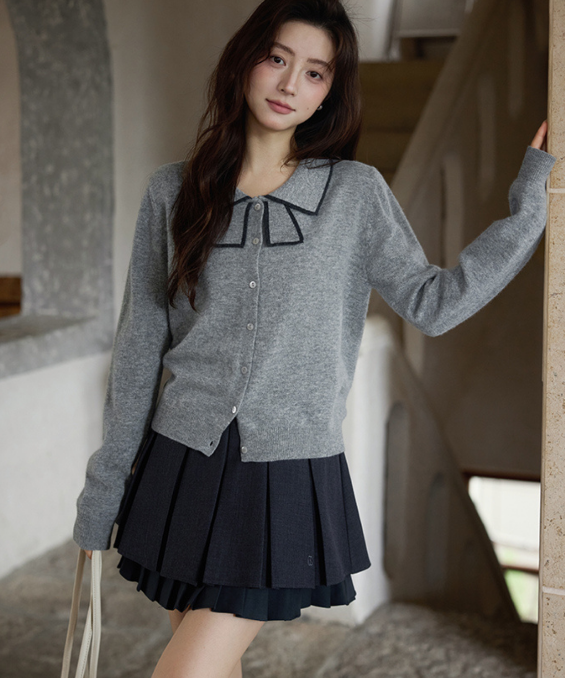 リボンを結んだように見える襟デザインがポイントのカーディガンです。